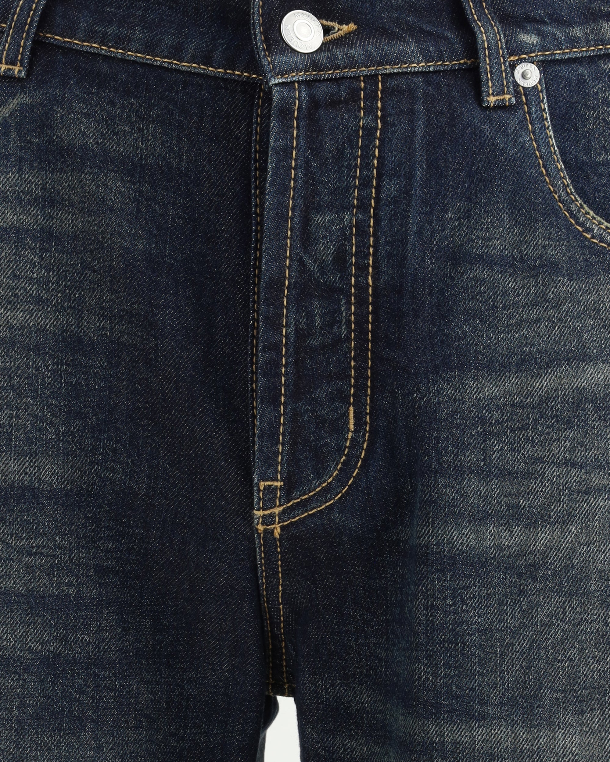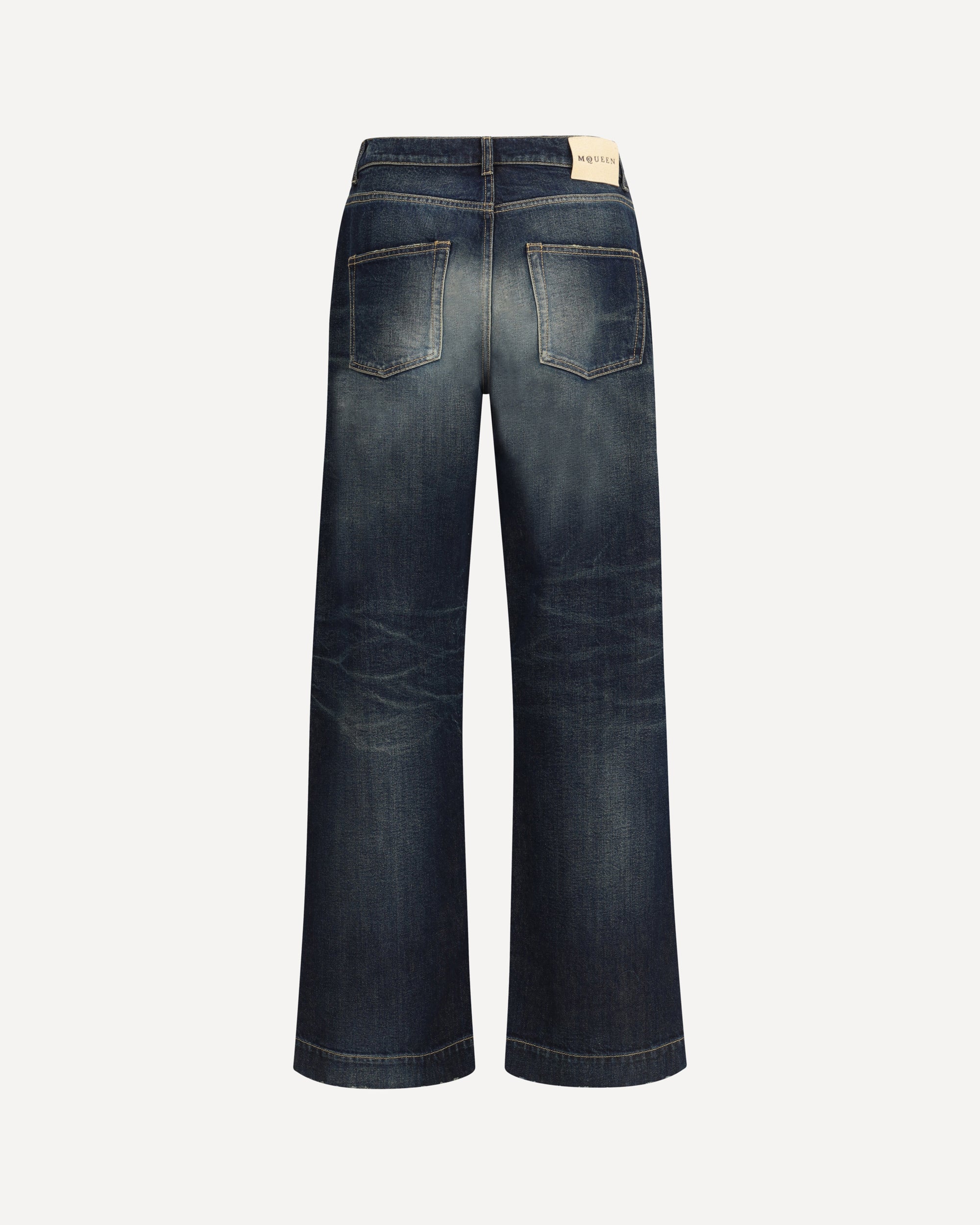 Vintage-effect Jeans by Alexander McQueen feature a five-pocket wide-leg style with belt loops at the waist. Contrasting yellow-orange stitching enhances the garment's construction, while elaborately finished pocket edges add a touch of sophistication to the retro-inspired look.