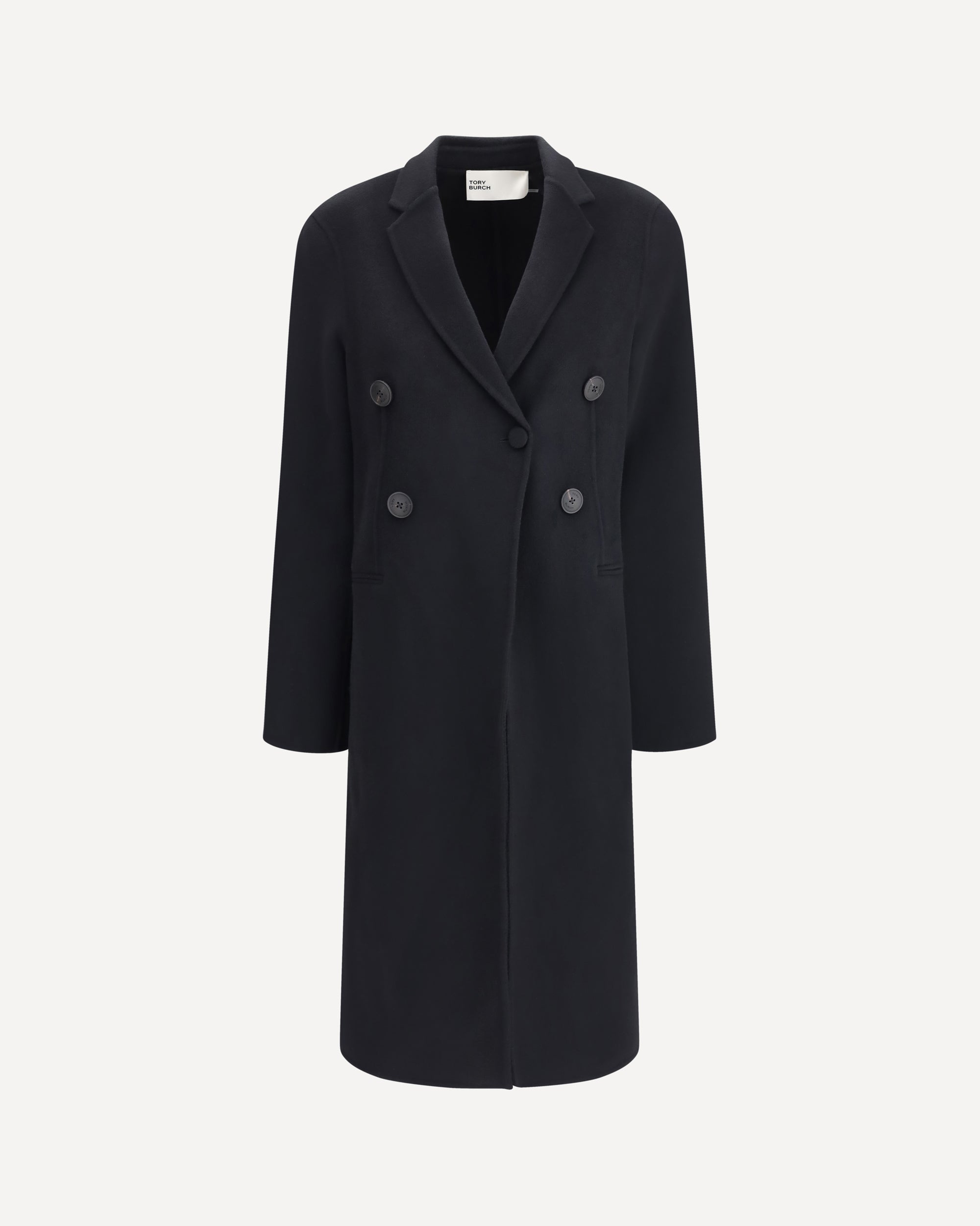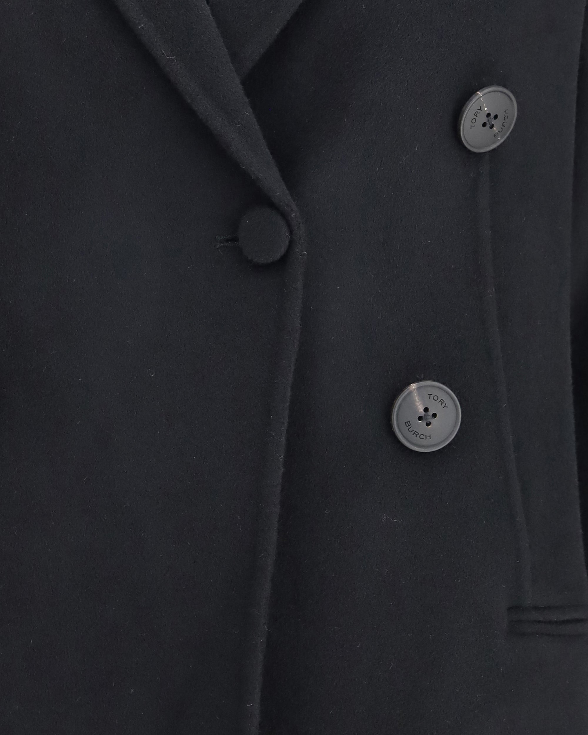 This classic Wool Coat features decorative horn buttons inspired by double-breasted styling. It has a central closure with fabric-covered buttons, horn details on the front and cuffs, a welt chest pocket, and side pockets. An timeless and refined piece, perfect for transitional seasons