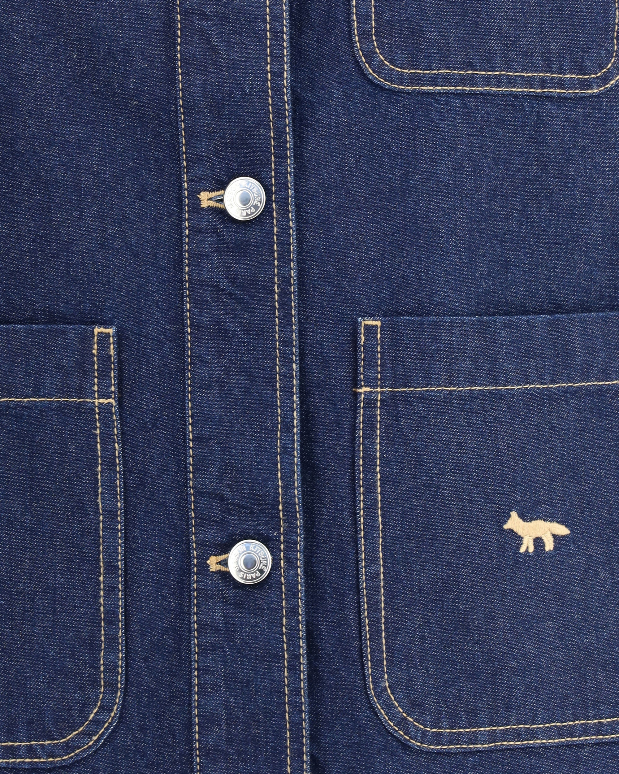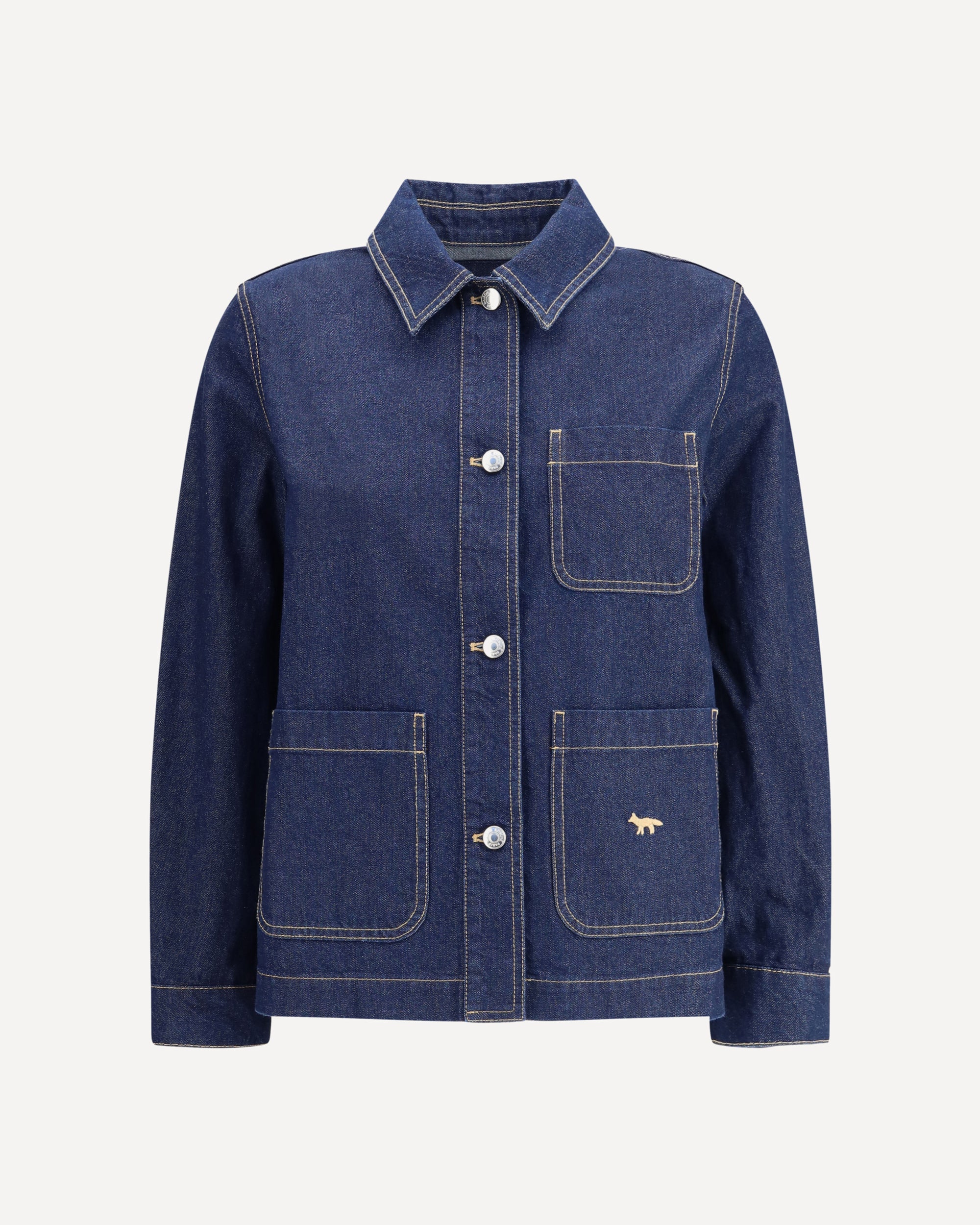 The Denim workwear Jacket by Maison Kitsuné is a versatile and functional style perfect for a casual, urban look. The front button closure and classic collar lend a touch of simple elegance, while the three patch pockets on the front offer practicality and a functional design. The brand's iconic logo stitched on the front adds a distinctive and recognizable detail. With its structured cut and rugged denim, this jacket is ideal for those seeking a garment that combines aesthetics and comfort.