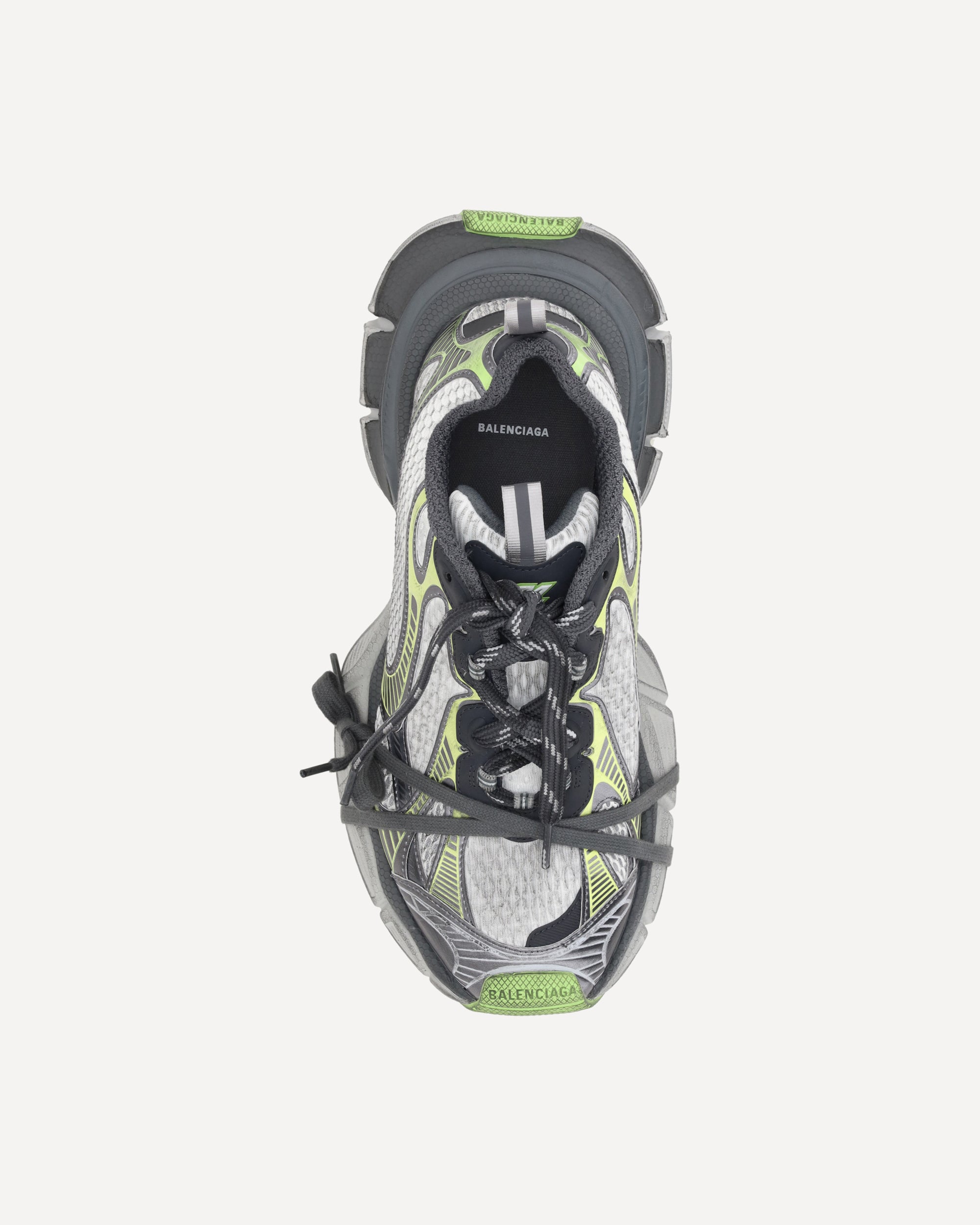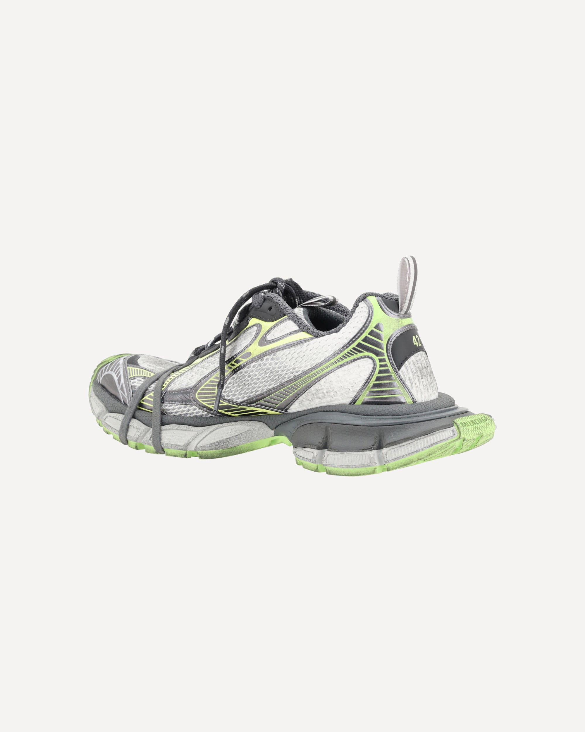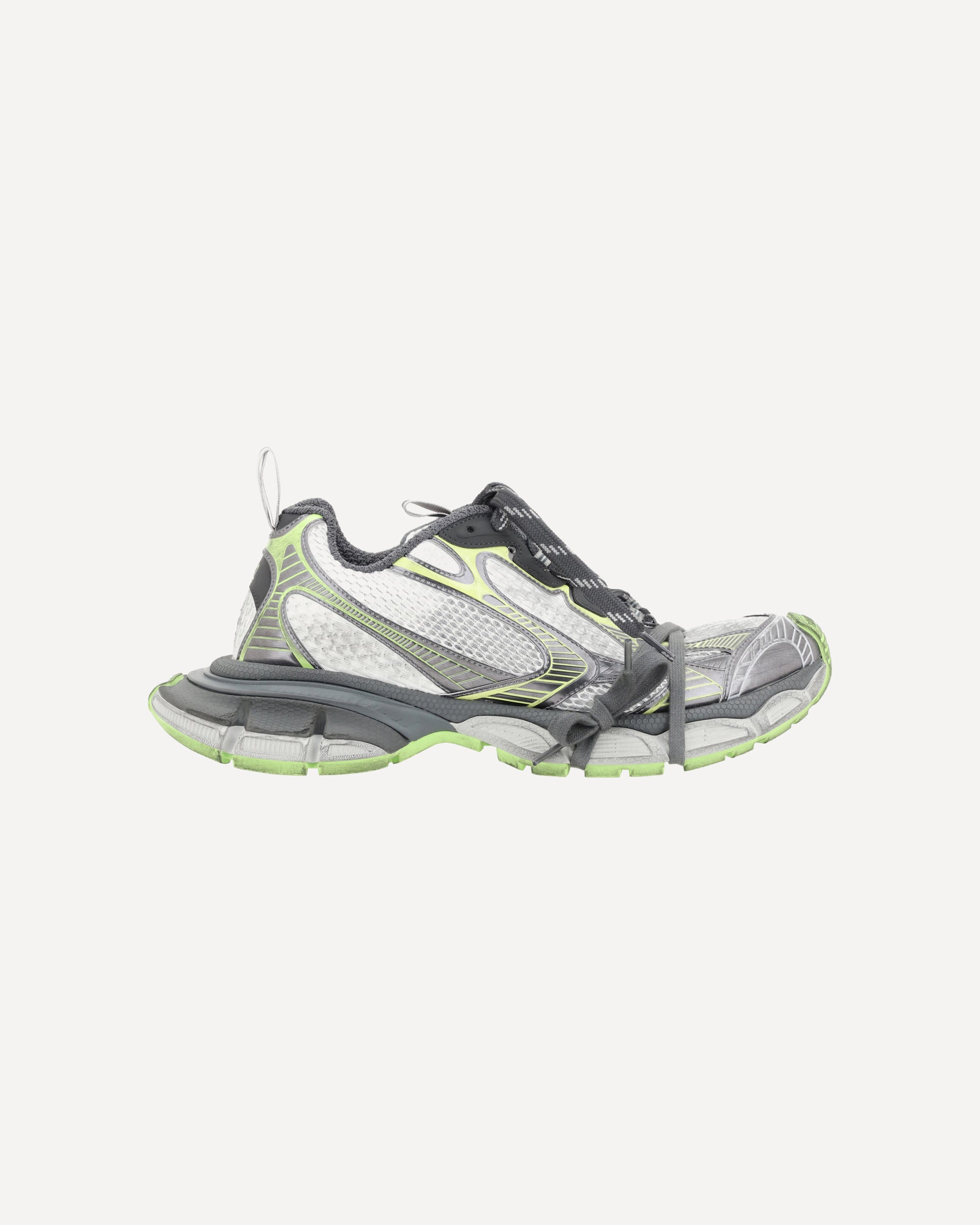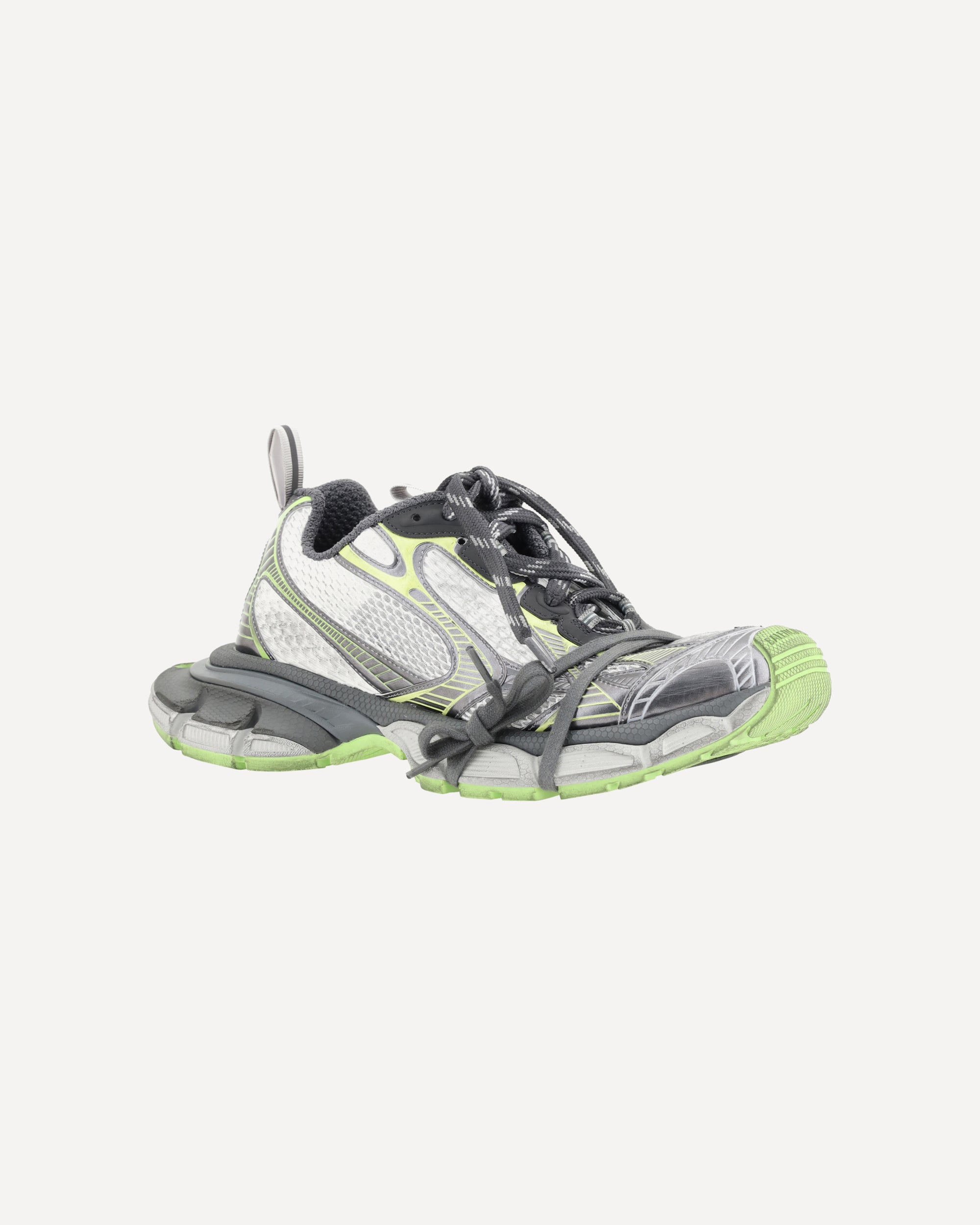 The 3XL Sneakers by Balenciaga feature an oversized design with a textured chunky rubber sole, giving a bold look. The front closure is made with multiple laces, offering a customized fit. The body of the shoe is composed of mesh and mesh panels, creating a dynamic and lightweight visual effect. The closure features a double tongue for a sporty and functional look. Balenciaga's logo is printed on both the sole and insole, while reflective details add a stylish, technical touch. A perfect blend of comfort and cutting-edge design.