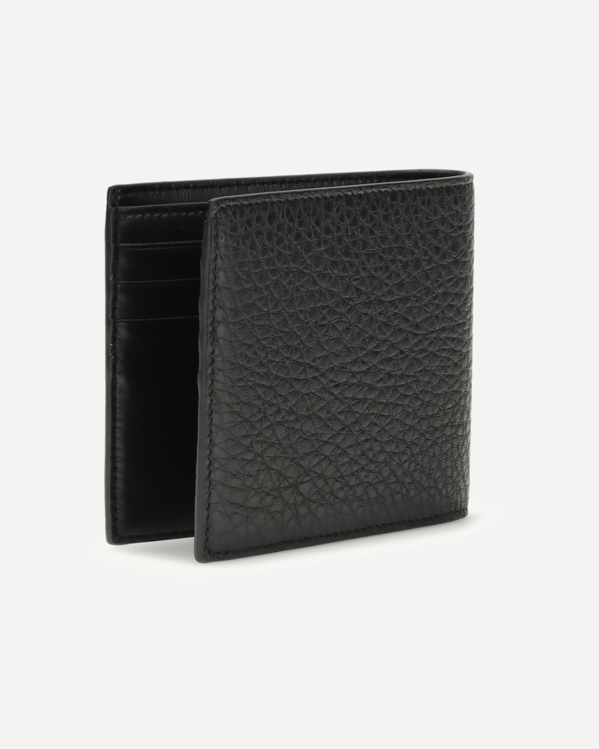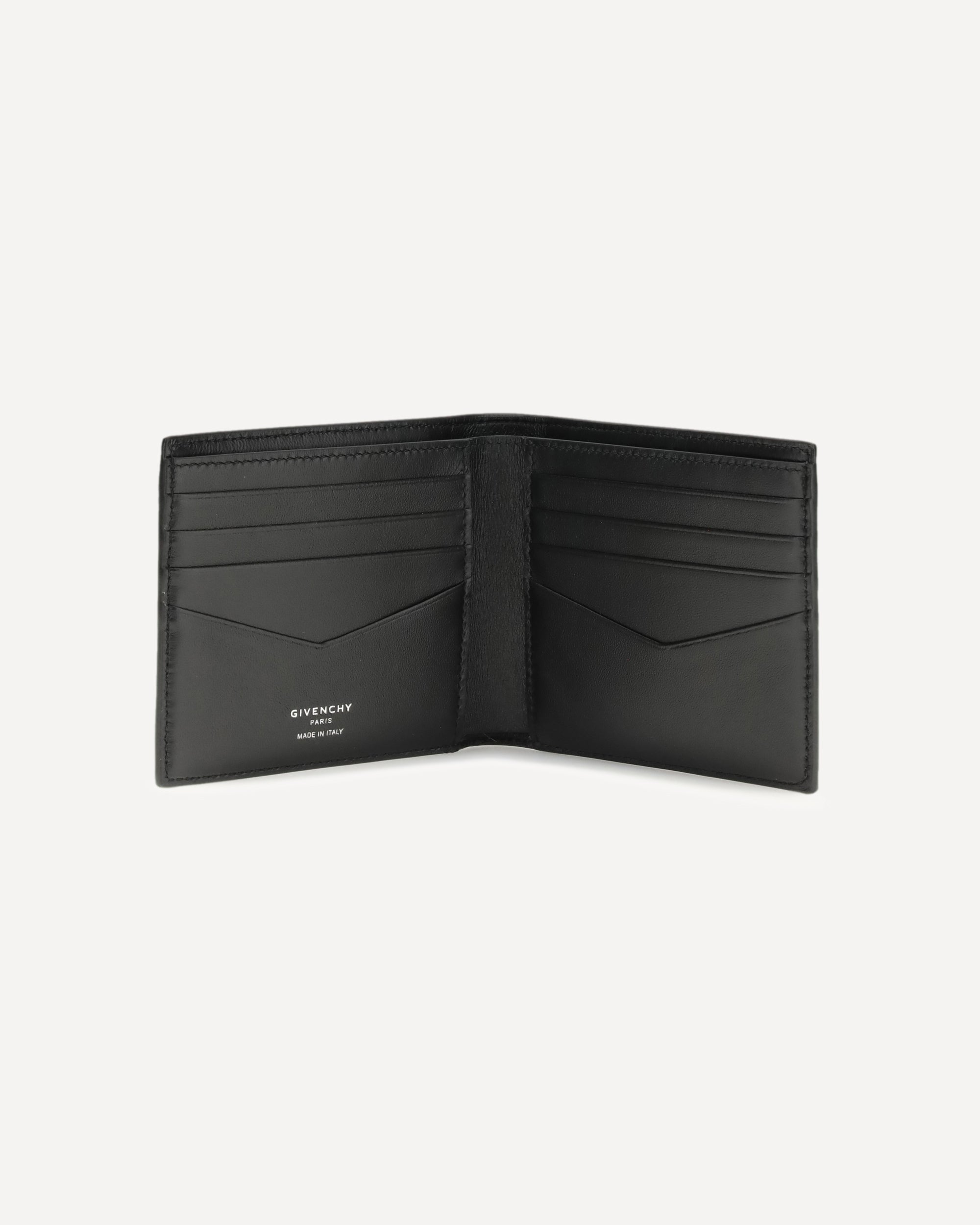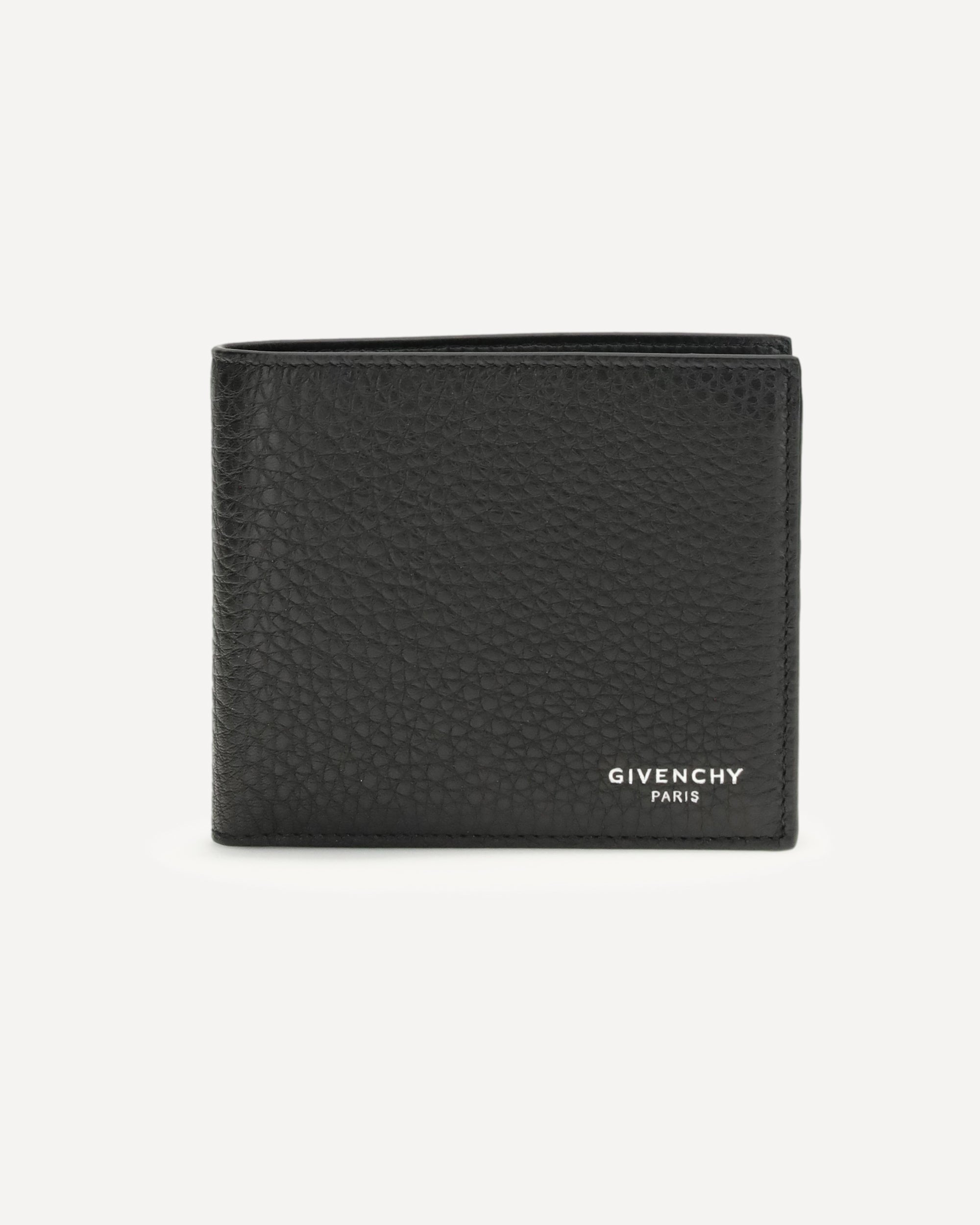 The leather bifold Wallet by Givenchy is crafted from black grain calfskin leather that is both elegant and durable. The GIVENCHY Paris signature embossed on the front and the logo on the inside underscore the brand's identity.Inside it features two bill pockets and eight card compartments, combining style and functionality in a refined and practical accessory.
