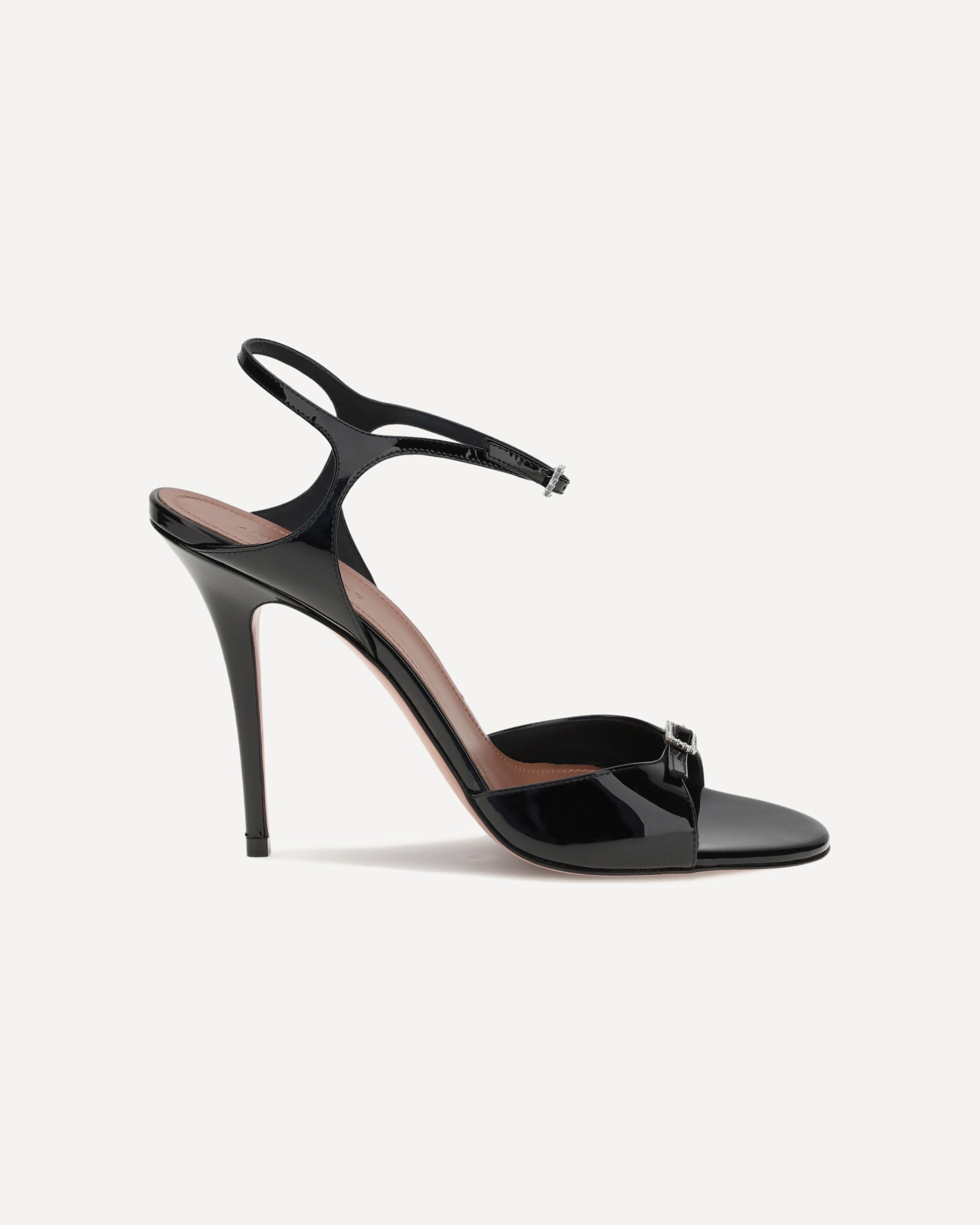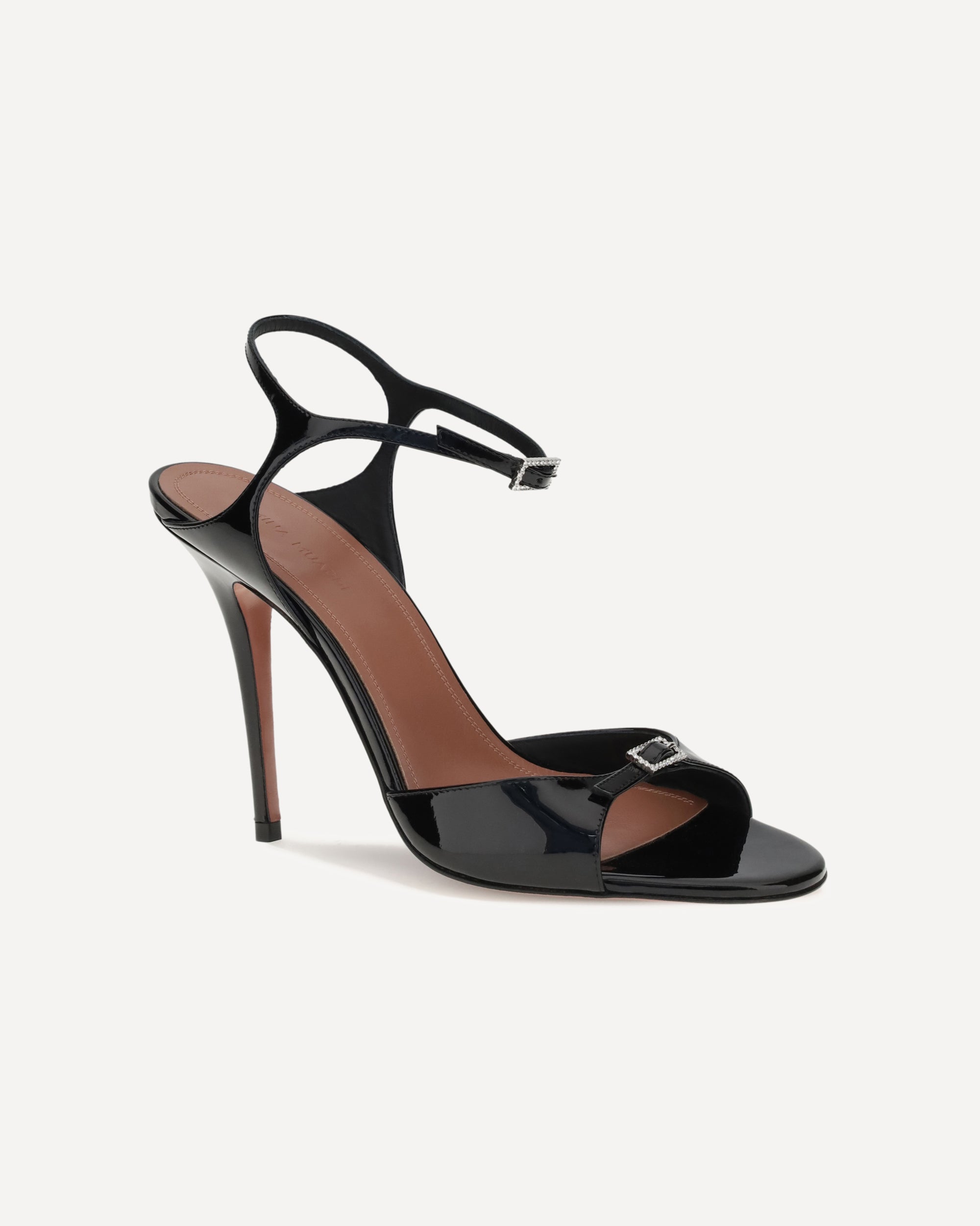 Amina Muaddi's Adut Sandals embody elegance and femininity in a striking design. Made of patent leather, they stand out for their sleek stiletto heel and buckle closures embellished with rhinestones, featured on both the ankle and upper. A sophisticated model, perfect for adding a sparkling touch to evening looks or special occasions.