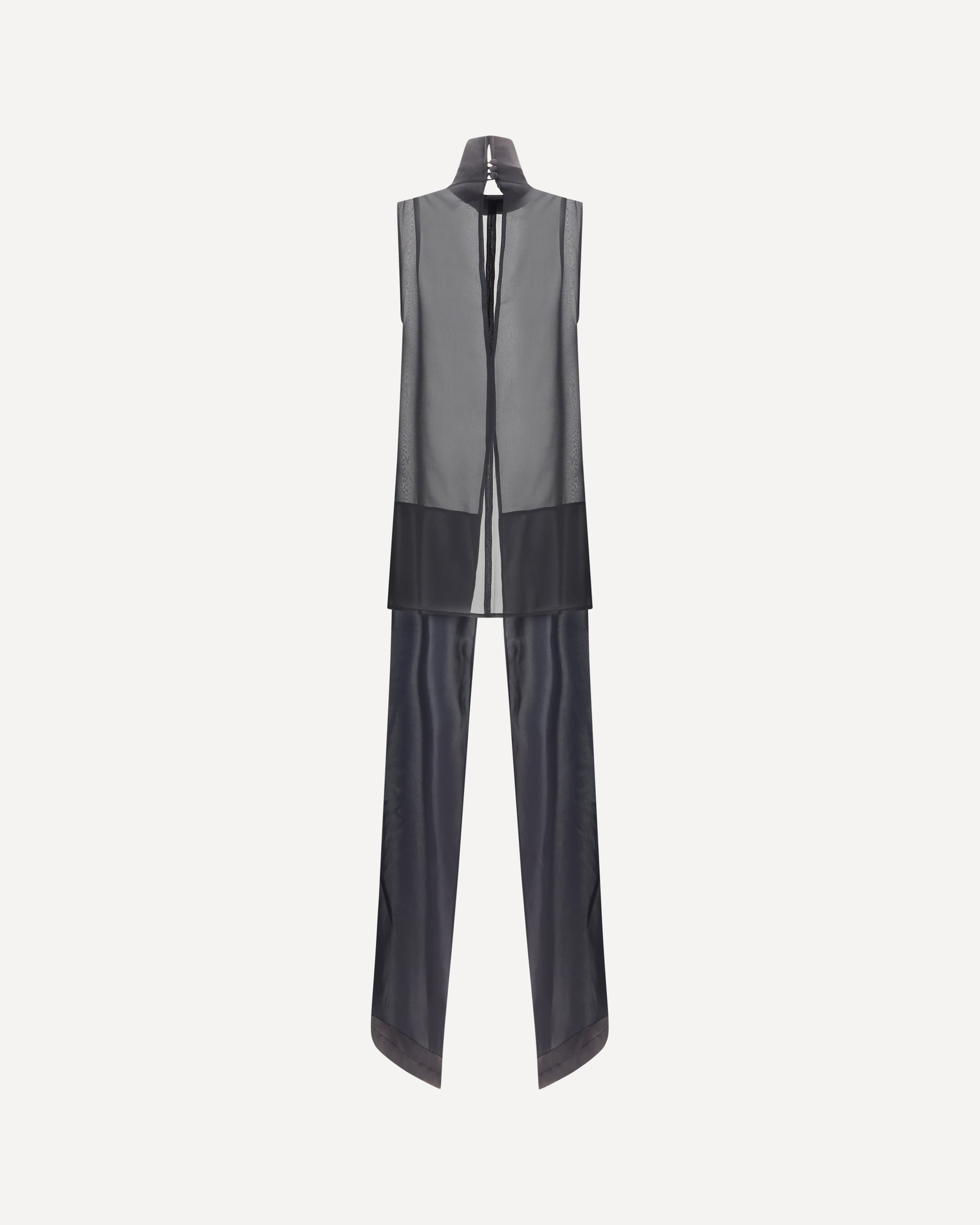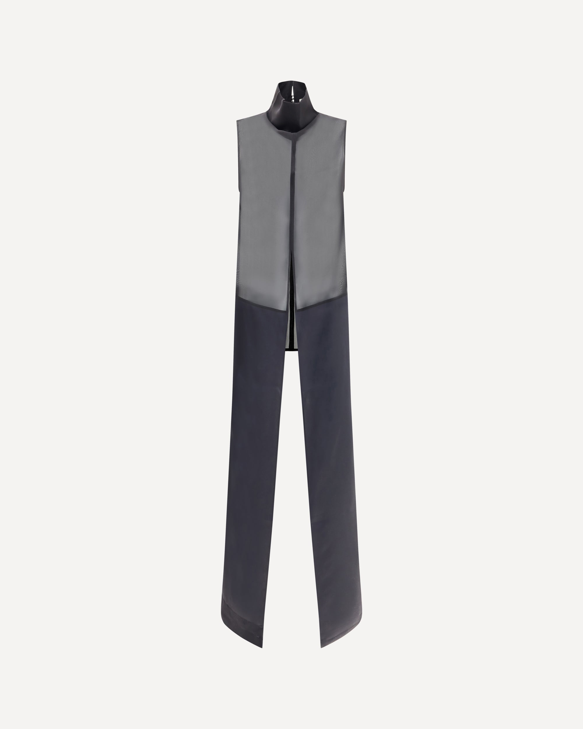 Di Stavnitser's silk Aida Top is a sophisticated garment with a contemporary style. Sleeveless and high-necked, it is distinguished by a long front panel that falls to the feet, divided in the middle by a deep slit that creates elegant movement. The semi-sheer design adds a touch of lightness and sensuality, making it ideal for refined and original looks.