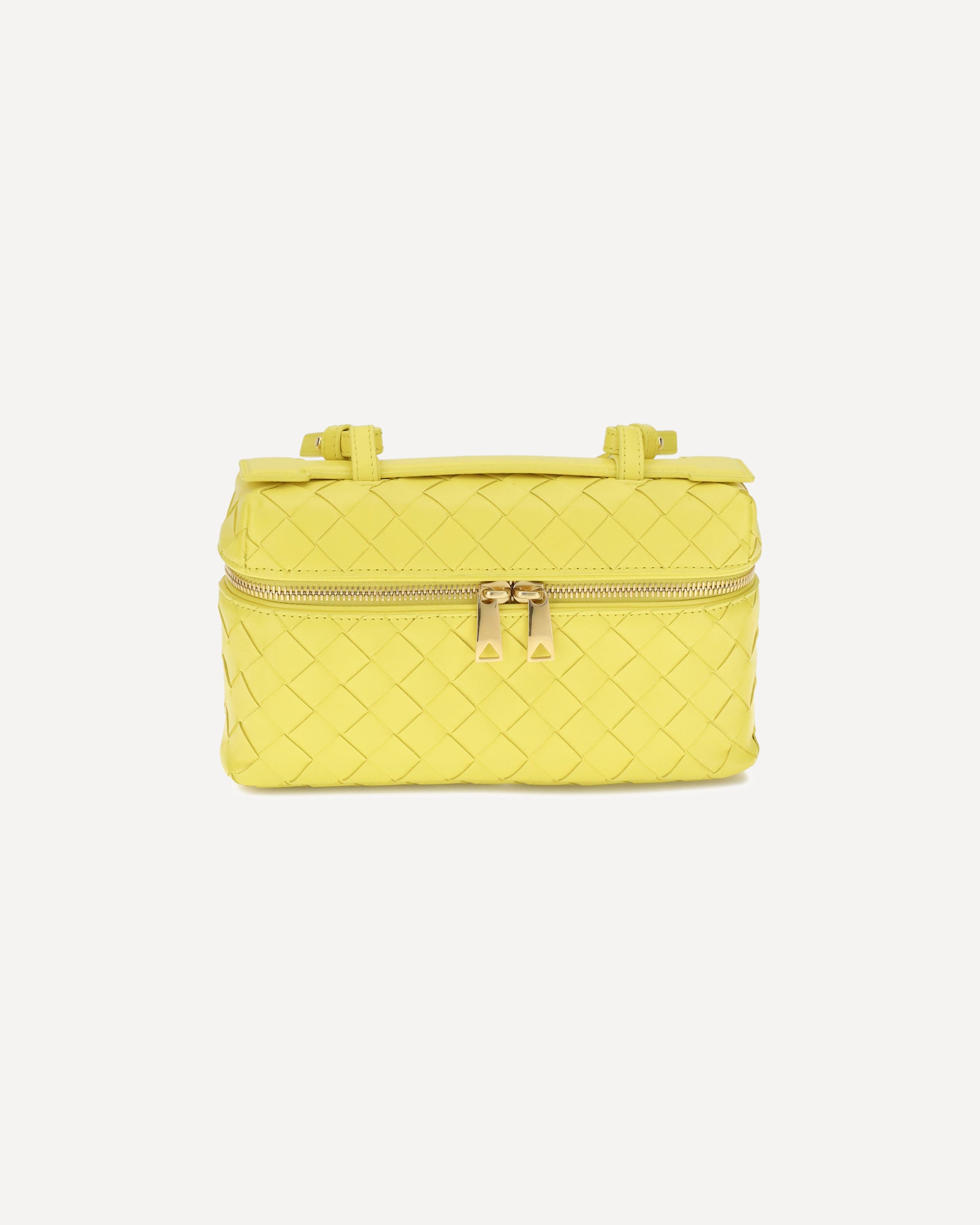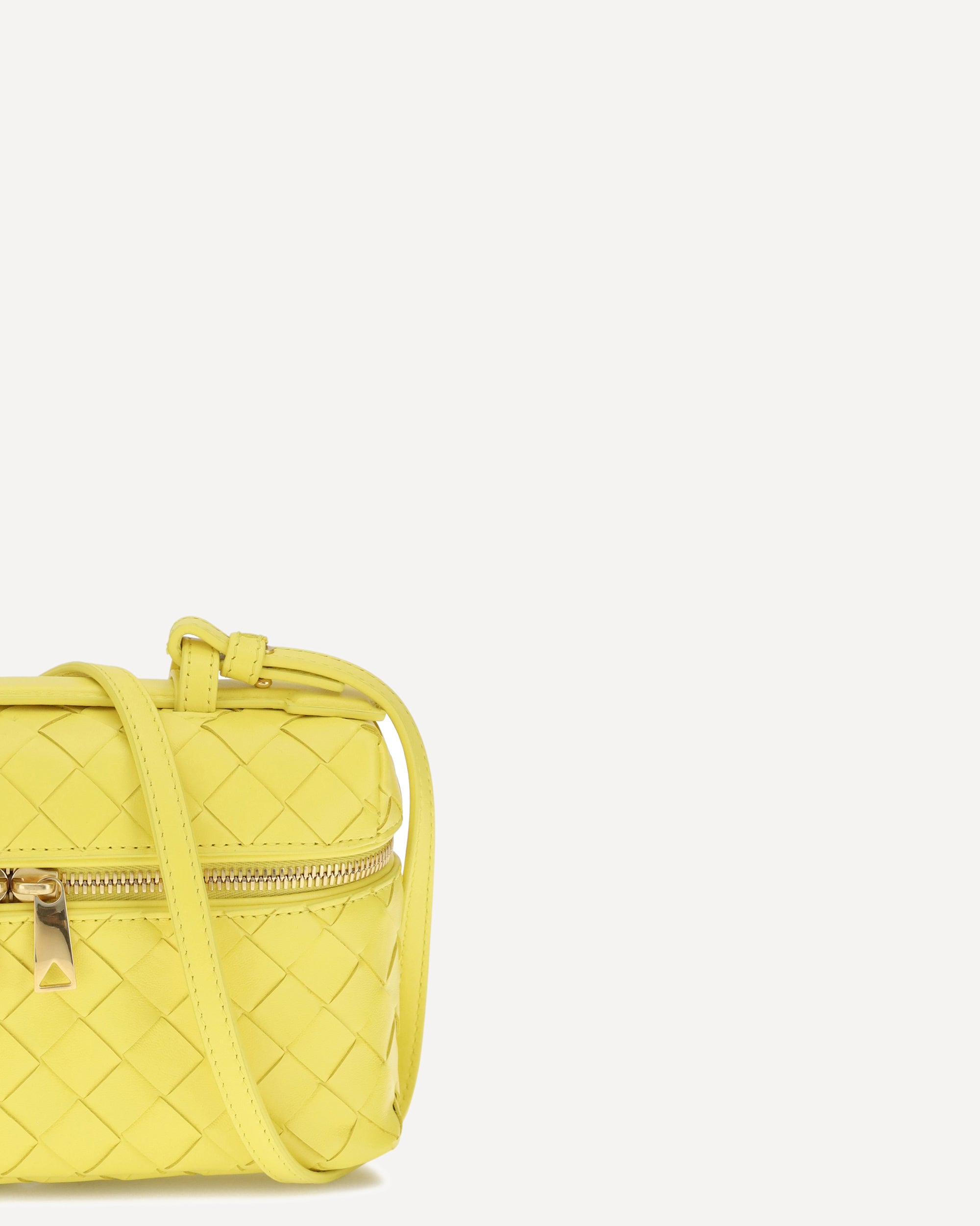 The Bang Bang leather Vanity Case Shoulder Bag by Bottega Veneta is an elegant and distinctive accessory perfect for adding a touch of luxury to any look. Made of high-quality leather, it features a long shoulder strap with a knotted detail at the base, offering both comfort and a unique design element. Its iconic Intrecciato design, typical of the brand, is applied all-over, giving the item a sophisticated and recognizable look. The top lap closure, via a double-slider zipper, provides convenience and security. Contrasting gold-plated hardware adds a touch of luxury, while the bag's rigid design makes it perfect for a structured and refined look.