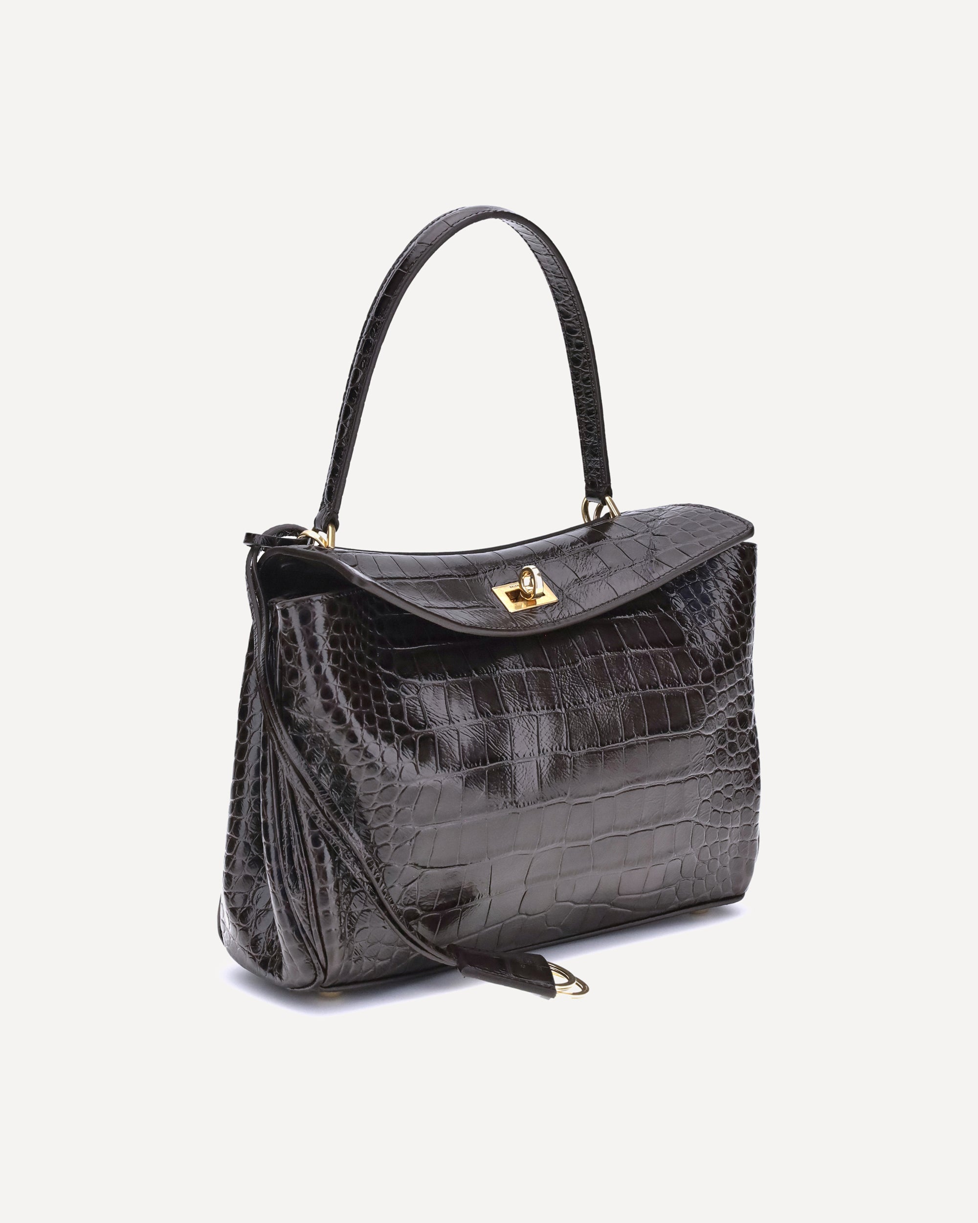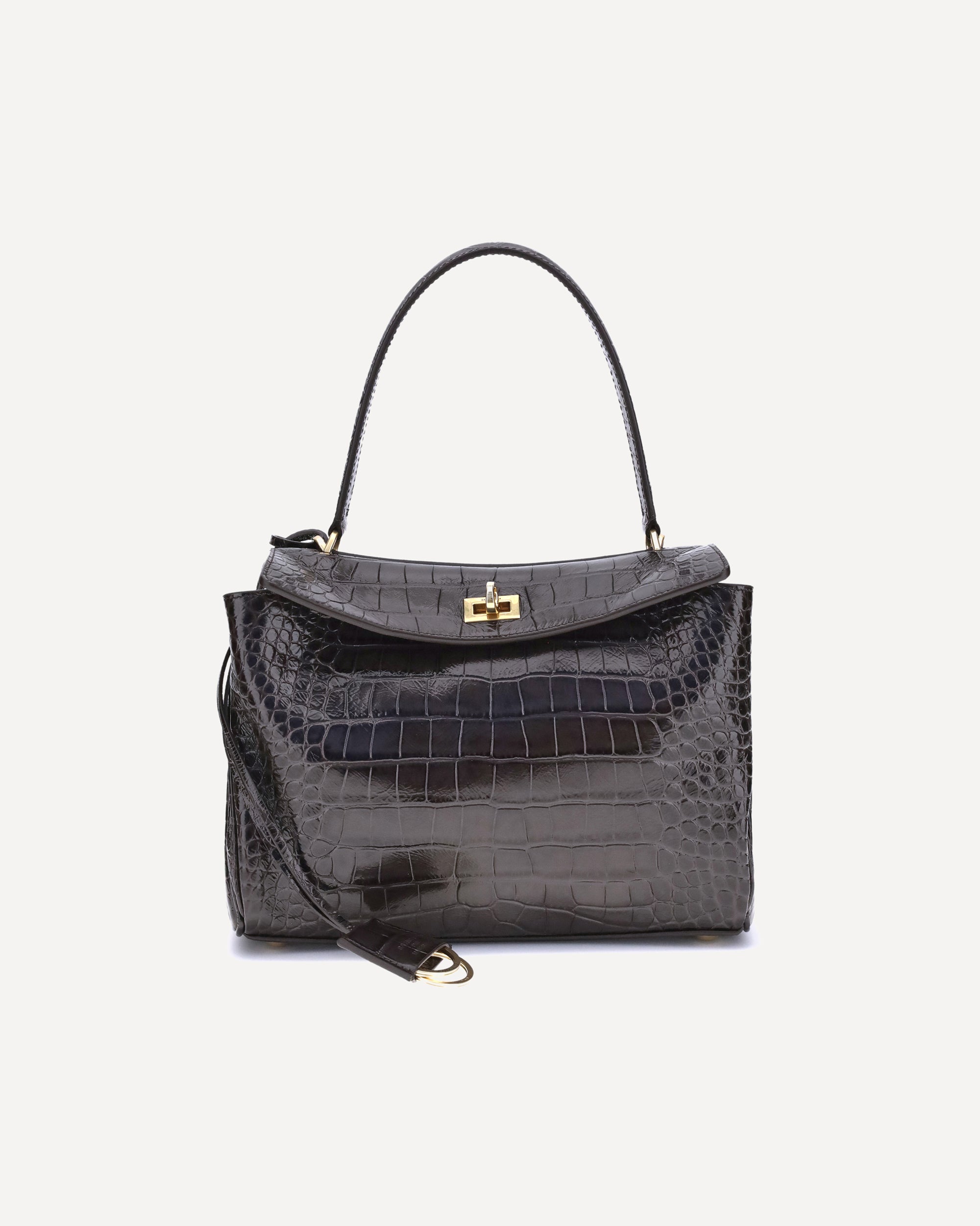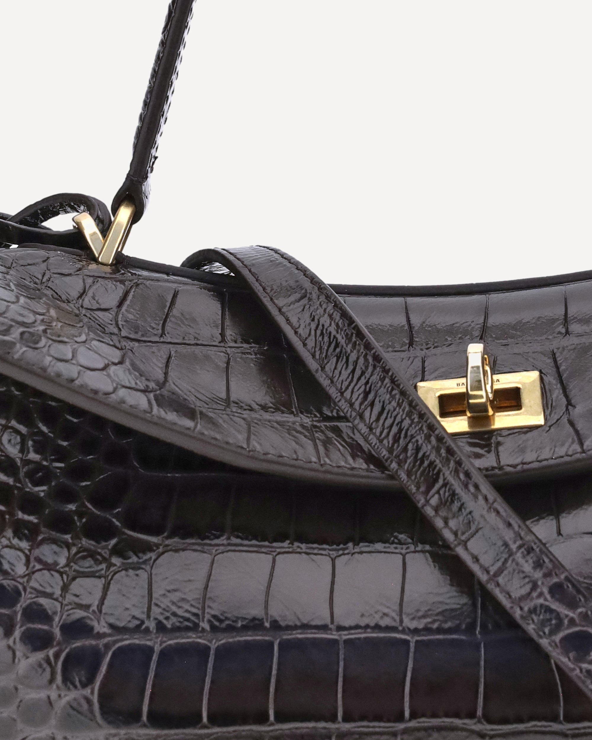 The Rodeo Shoulder Bag in crocodile-print leather by Balenciaga features a top handle for a comfortable and elegant grip. The front closure is equipped with a flap and turn lock, adding a distinctive and functional detail. Key ring detail applied to the top handle. The removable shoulder strap is secured with snap hooks, allowing it to be carried both on the shoulder and by hand. Inside, the bag offers a single internal compartment, ideal for organizing essentials. Additionally, there are metal feet at the base of the bag, to protect it and keep it in place.