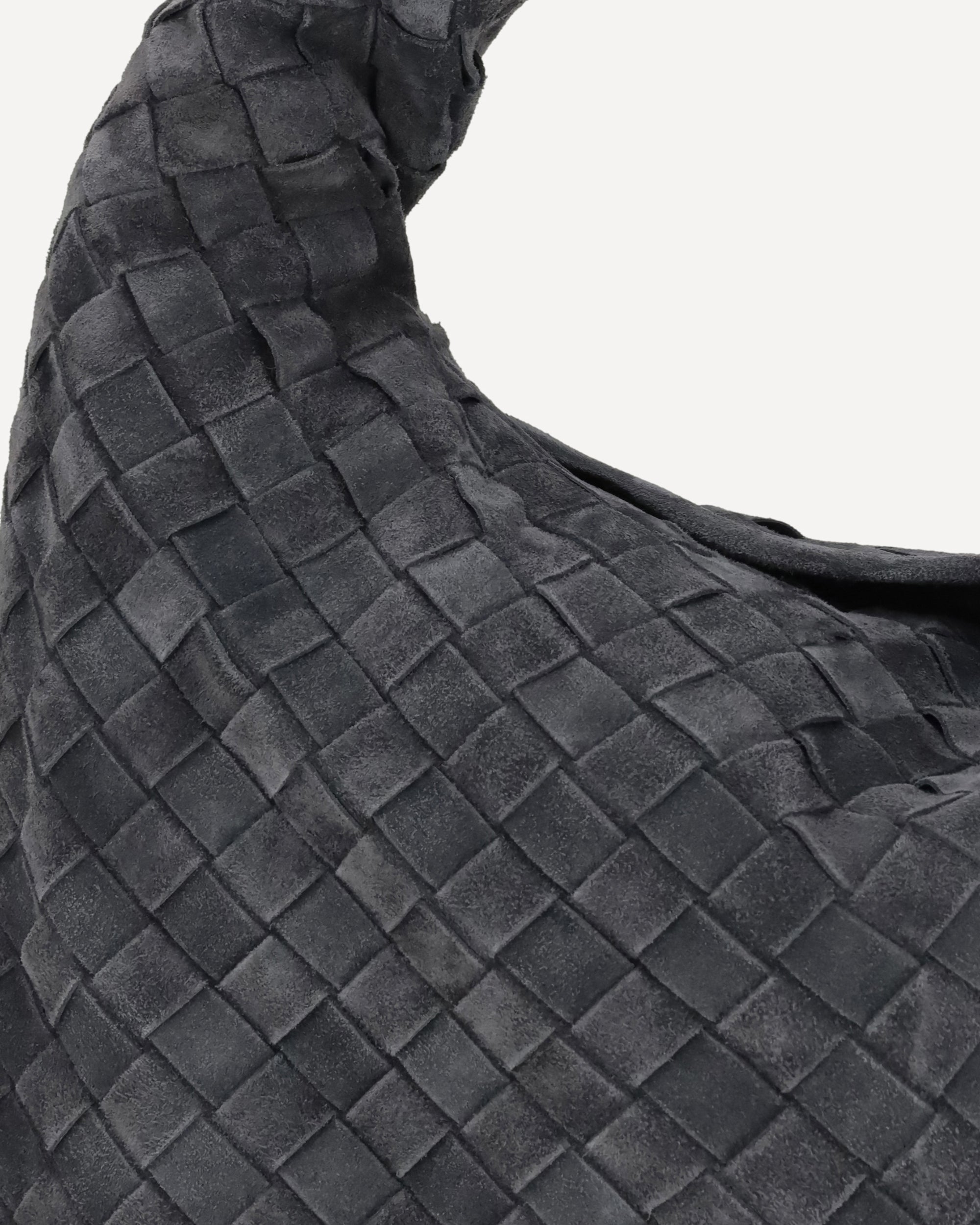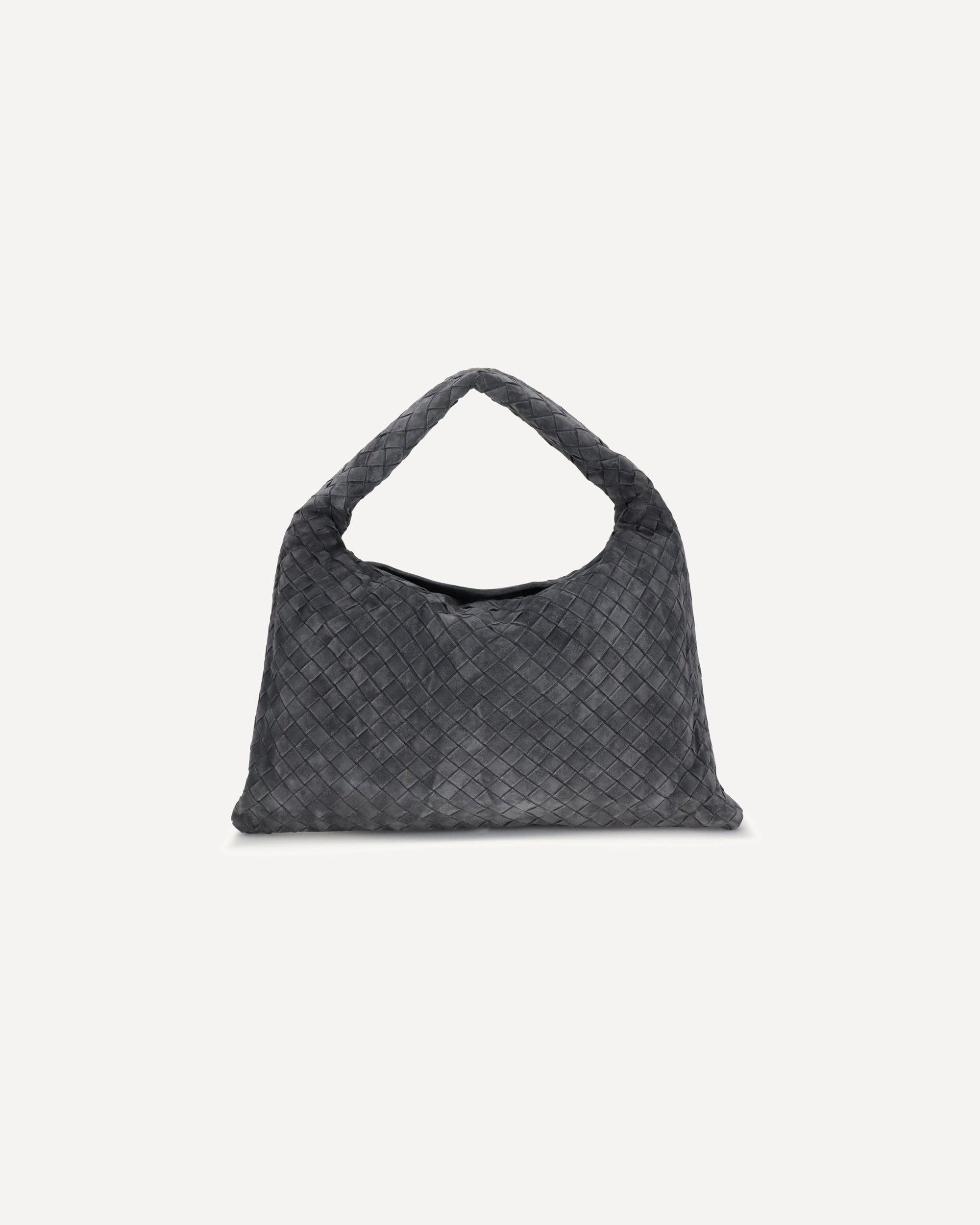 The leather Hop Shoulder Bag by Bottega Veneta expresses the discreet elegance and craftsmanship typical of the maison. Made of suede-effect leather, it features a single top handle and the iconic intrecciato design that is the brand's signature style. The interior, with a single compartment, is completed by a hidden magnetic closure that combines functionality and clean lines. An essential and sophisticated accessory, perfect for everyday use.