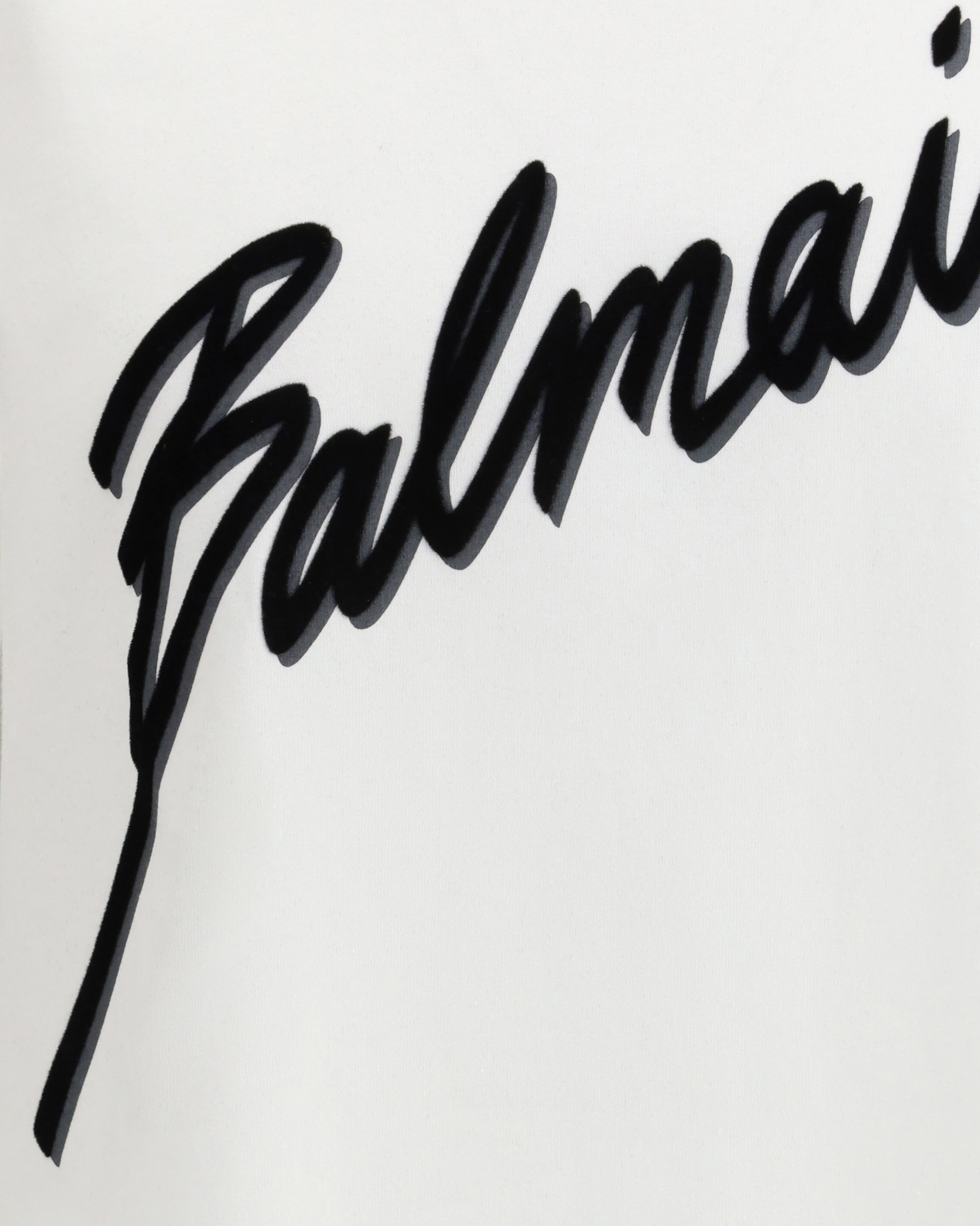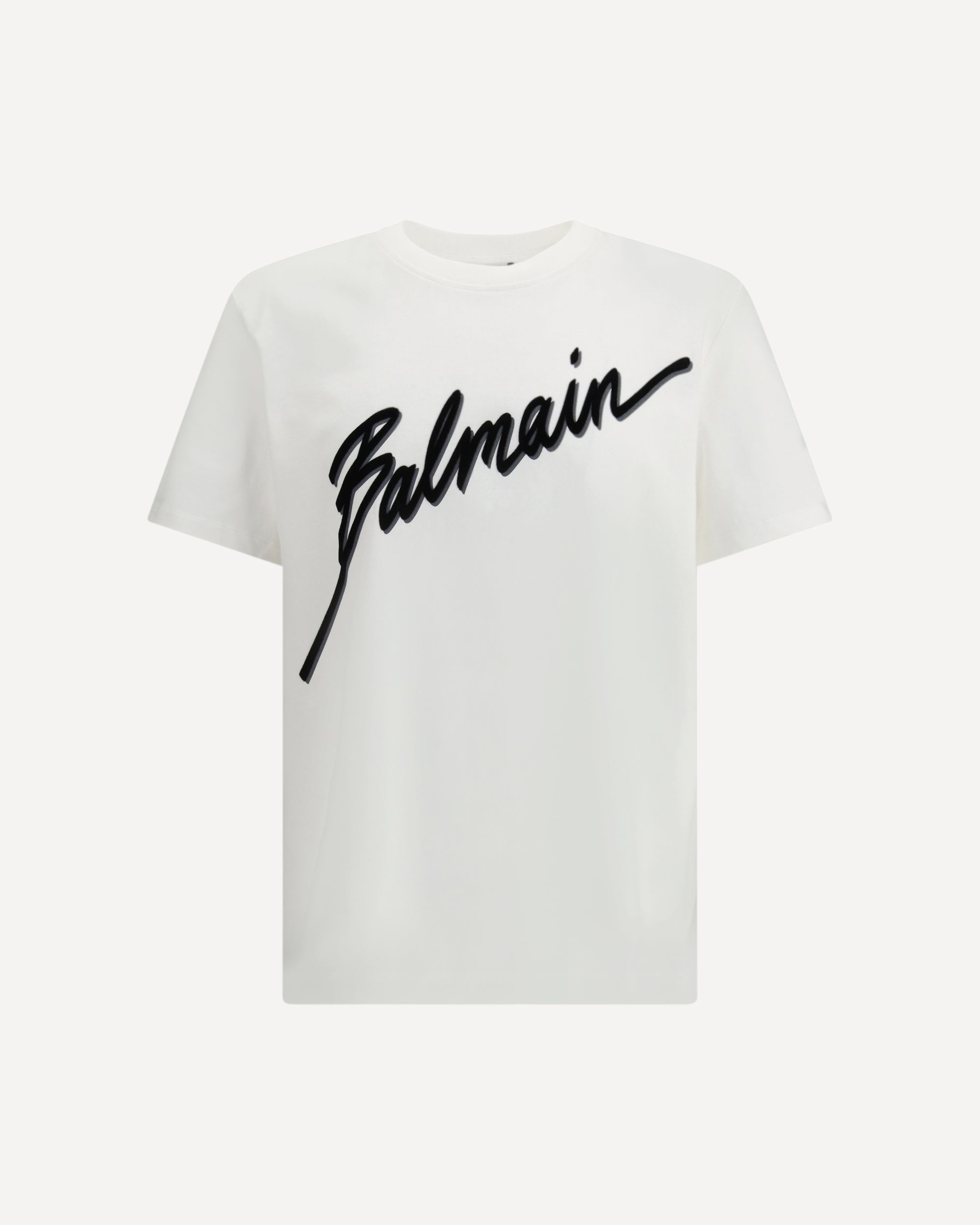 The Balmain Lettre flocked T-shirt is crafted from soft cotton and features a classic ribbed crew neckline and short sleeves. The contrasting printed and flocked Balmain letter on the front adds a bold touch to the piece, offered in a regular fit that enhances its contemporary aesthetic.