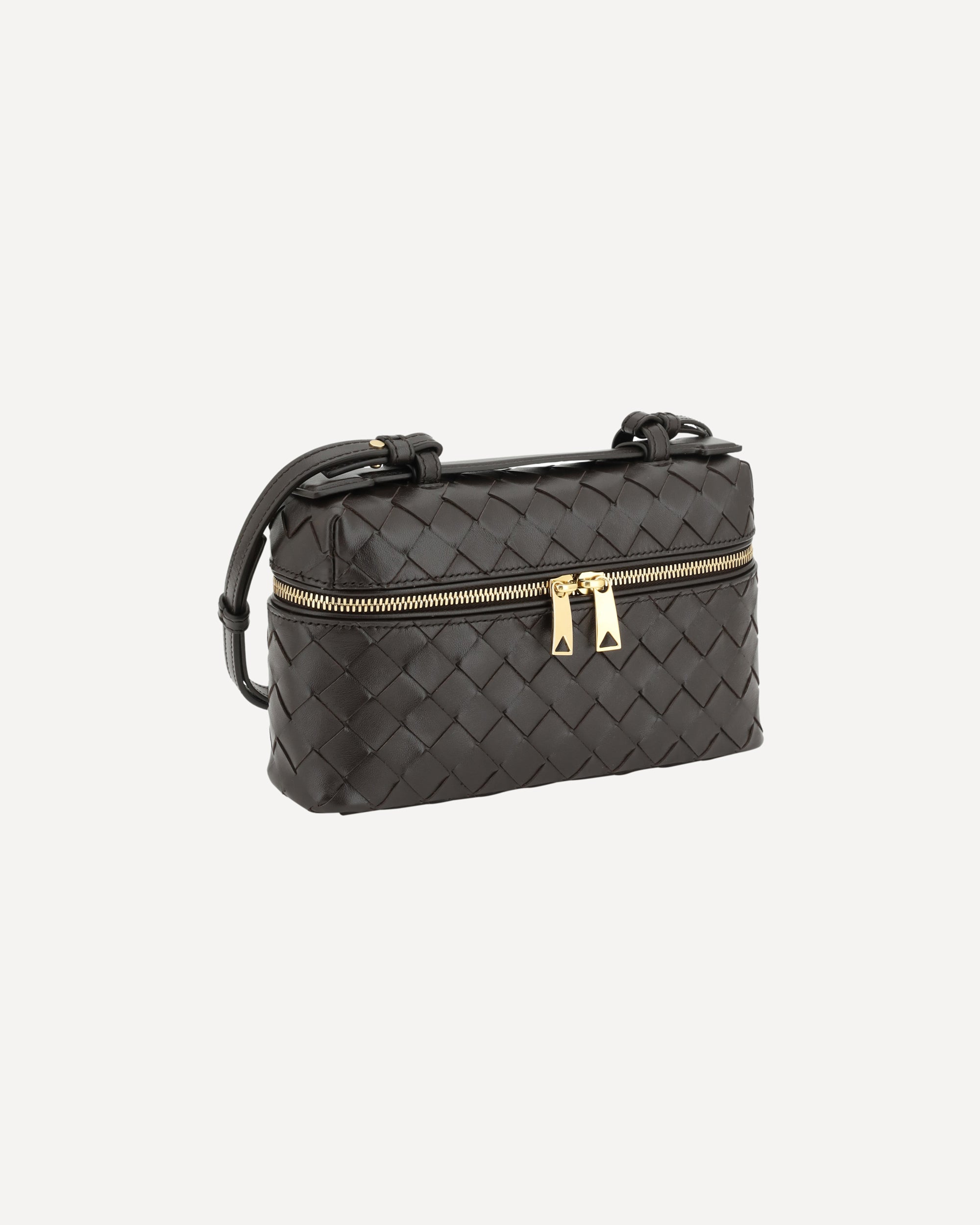 The Bang Bang leather Vanity Case Shoulder Bag by Bottega Veneta is an elegant and distinctive accessory perfect for adding a touch of luxury to any look. Made of high-quality leather, it features a long shoulder strap with a knotted detail at the base, offering both comfort and a unique design element. Its iconic Intrecciato design, typical of the brand, is applied all-over, giving the item a sophisticated and recognizable look. The top lap closure, via a double-slider zipper, provides convenience and security. Contrasting gold-plated hardware adds a touch of luxury, while the bag's rigid design makes it perfect for a structured and refined look.