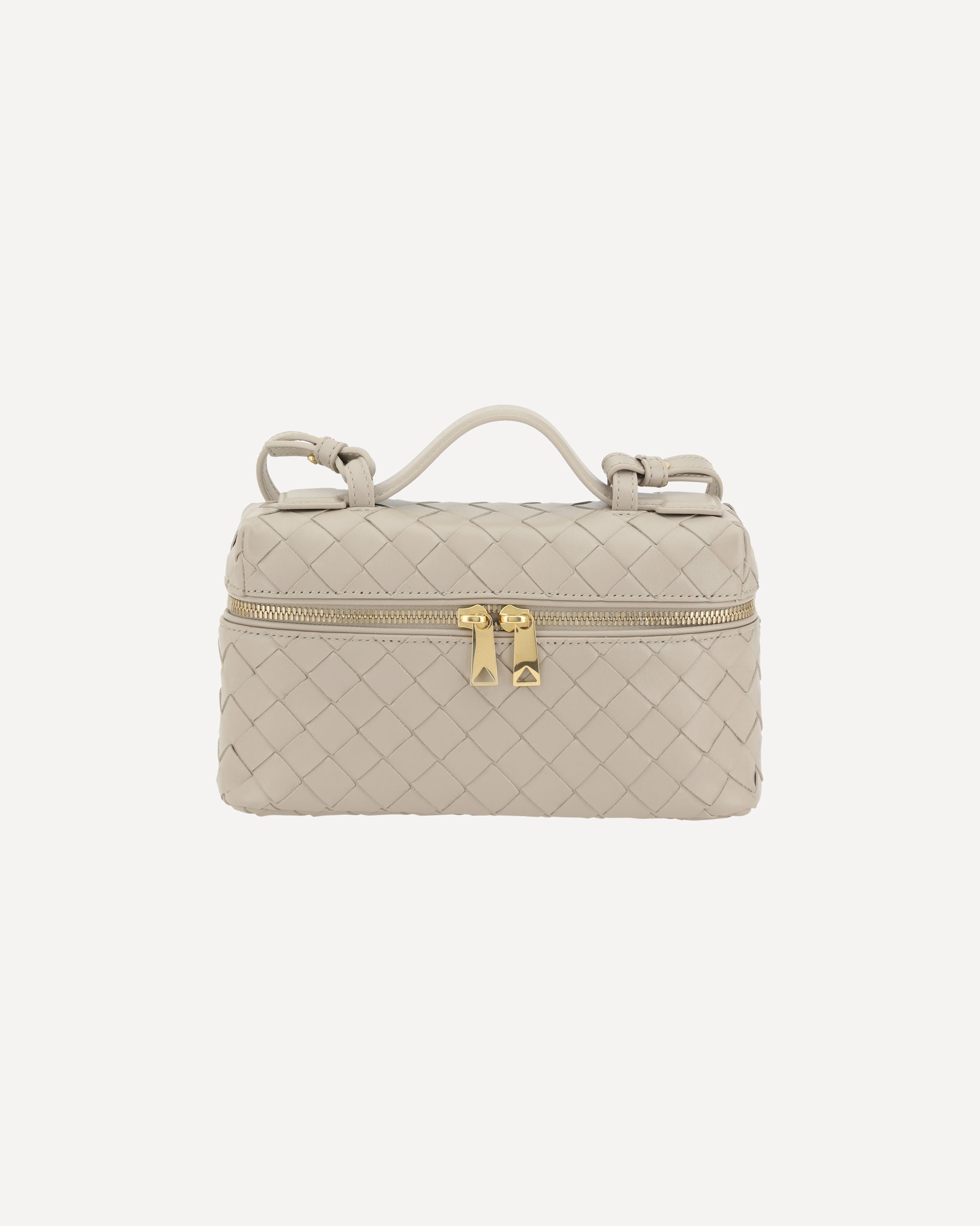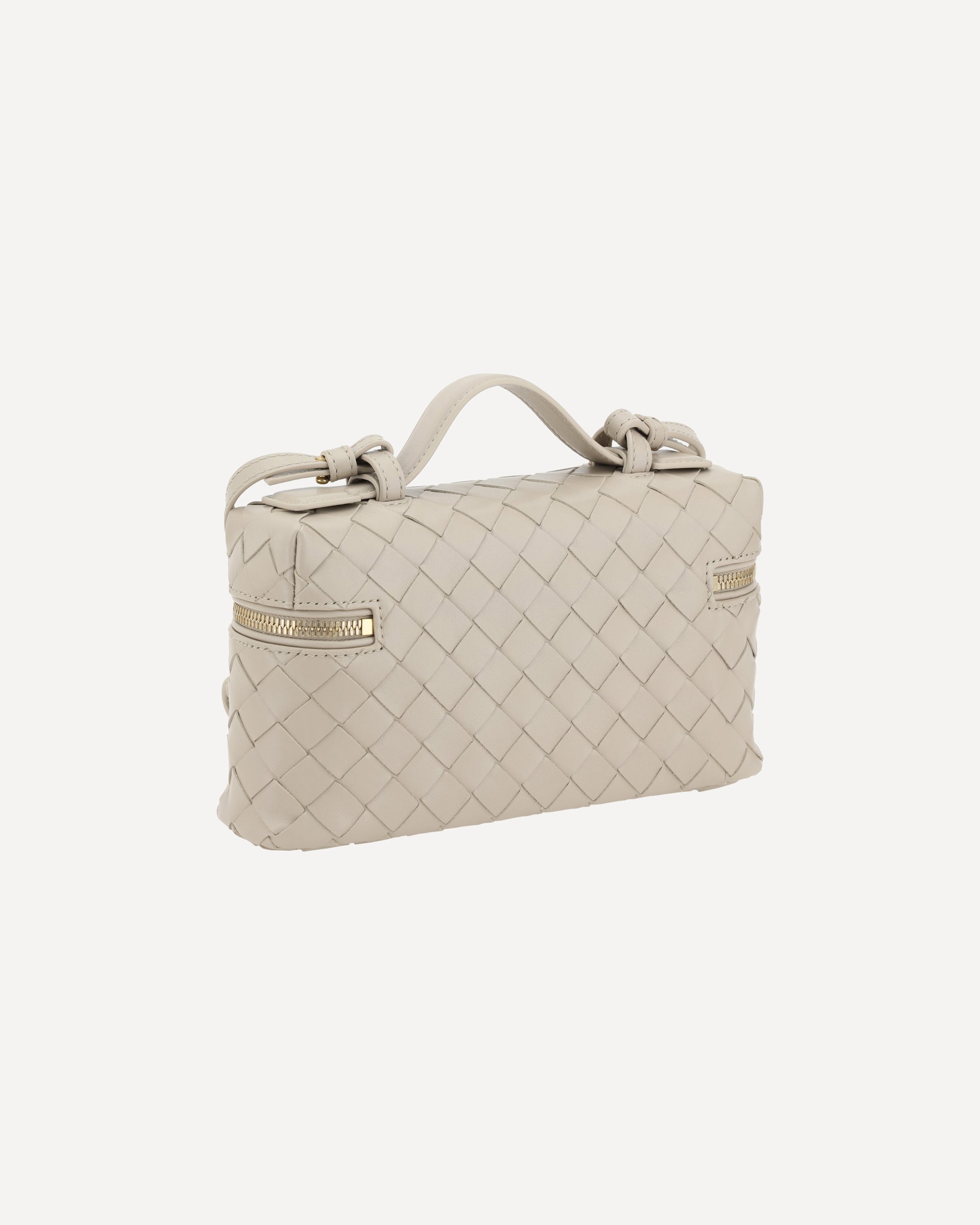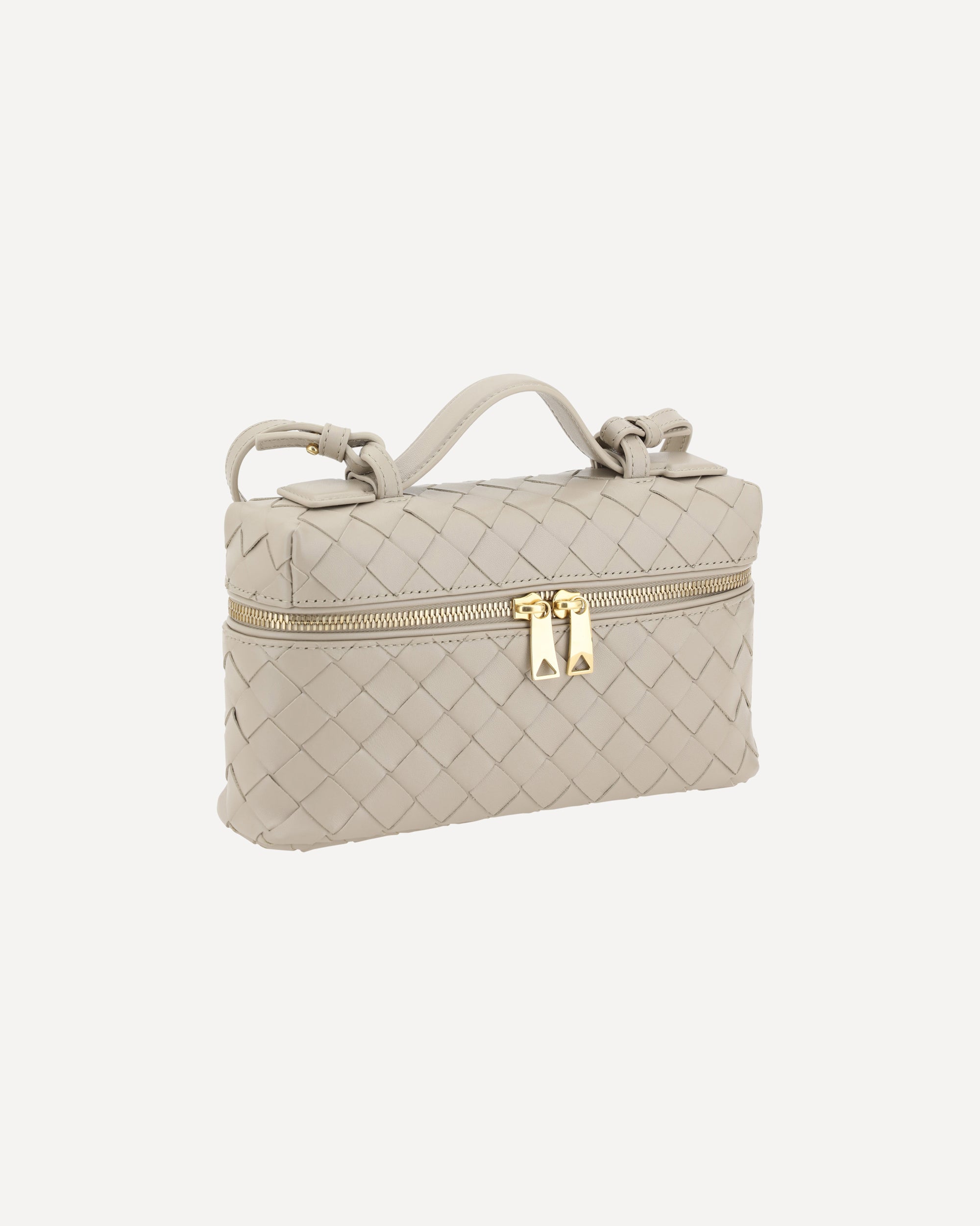 The Bang Bang leather Vanity Case Shoulder Bag by Bottega Veneta is an elegant and distinctive accessory perfect for adding a touch of luxury to any look. Made of high-quality leather, it features a long shoulder strap with a knotted detail at the base, offering both comfort and a unique design element. Its iconic Intrecciato design, typical of the brand, is applied all-over, giving the item a sophisticated and recognizable look. The top lap closure, via a double-slider zipper, provides convenience and security. Contrasting gold-plated hardware adds a touch of luxury, while the bag's rigid design makes it perfect for a structured and refined look.