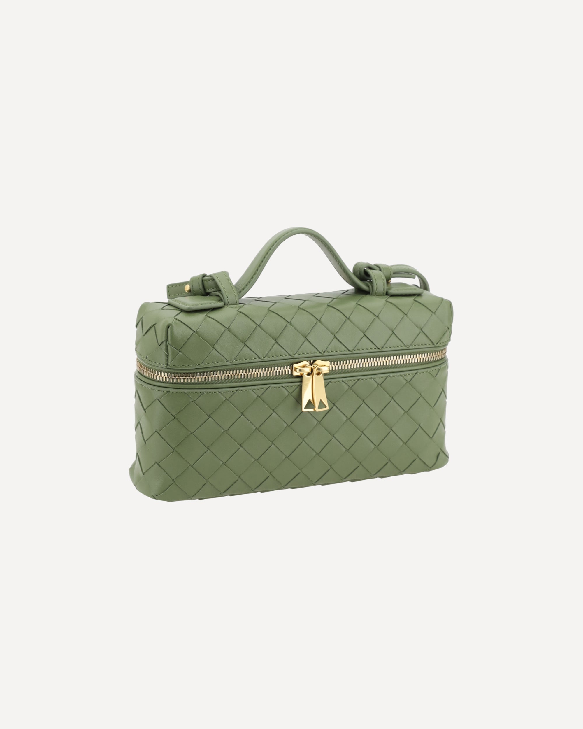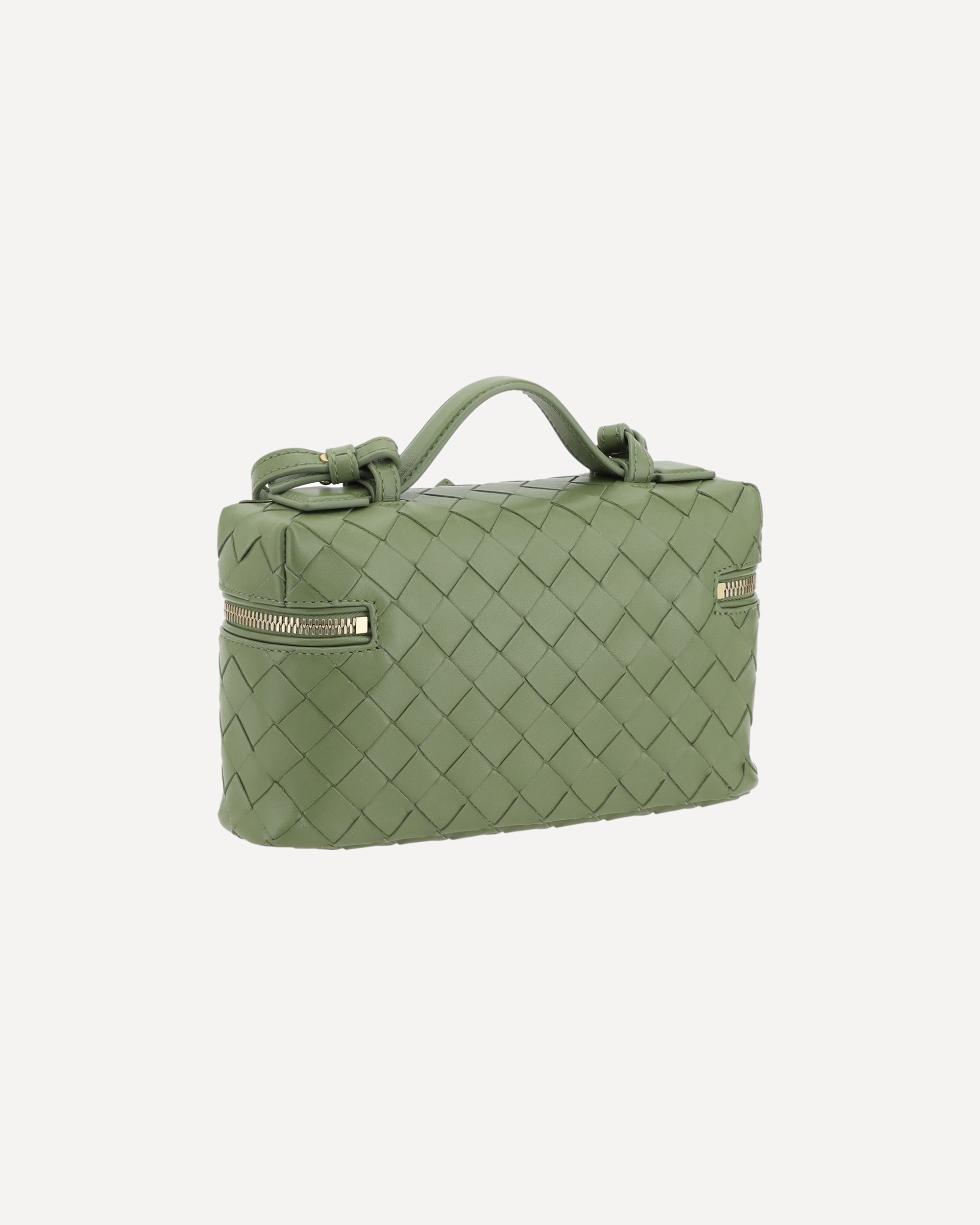 The Bang Bang leather Vanity Case Shoulder Bag by Bottega Veneta is an elegant and distinctive accessory perfect for adding a touch of luxury to any look. Made of high-quality leather, it features a long shoulder strap with a knotted detail at the base, offering both comfort and a unique design element. Its iconic Intrecciato design, typical of the brand, is applied all-over, giving the item a sophisticated and recognizable look. The top lap closure, via a double-slider zipper, provides convenience and security. Contrasting gold-plated hardware adds a touch of luxury, while the bag's rigid design makes it perfect for a structured and refined look.