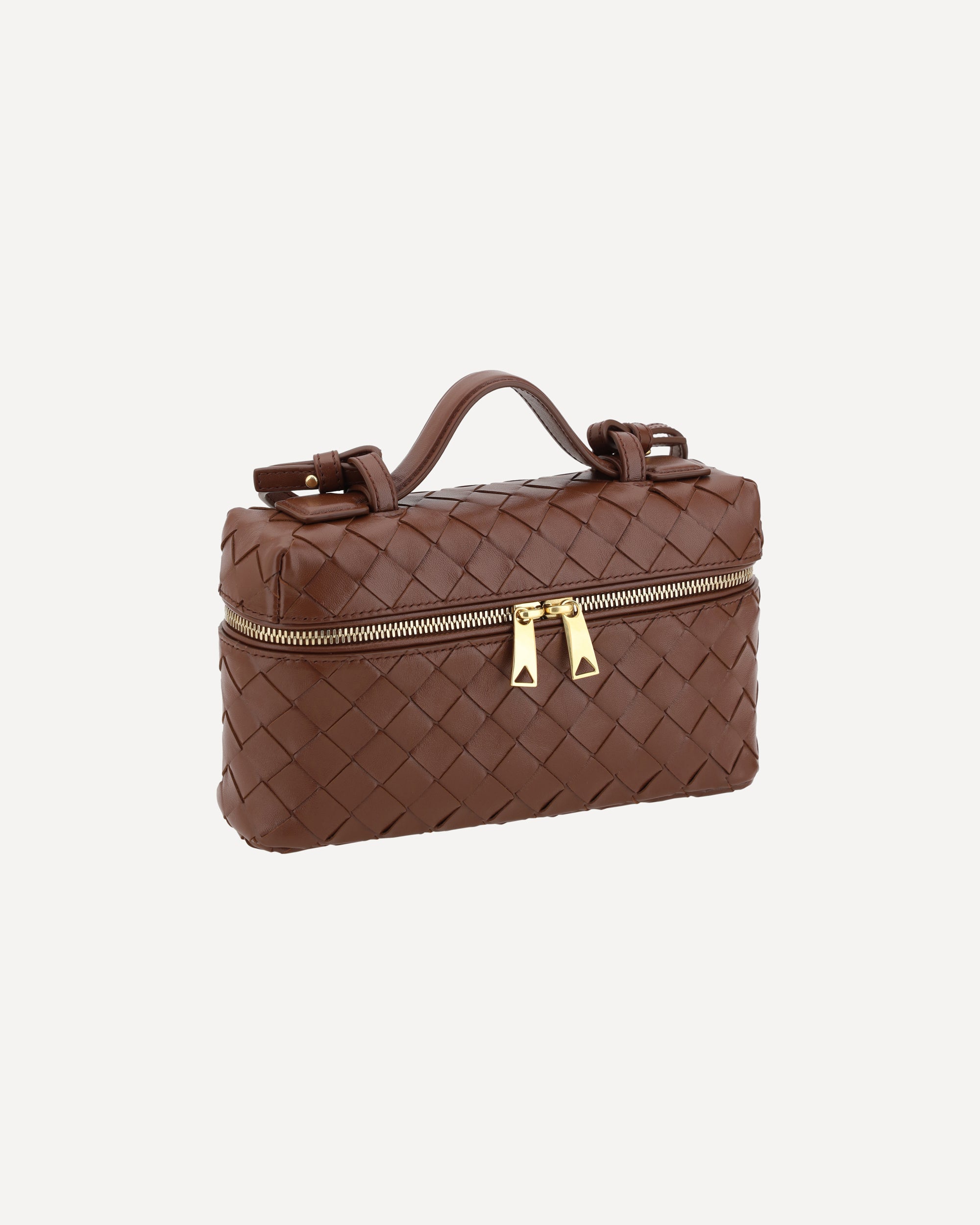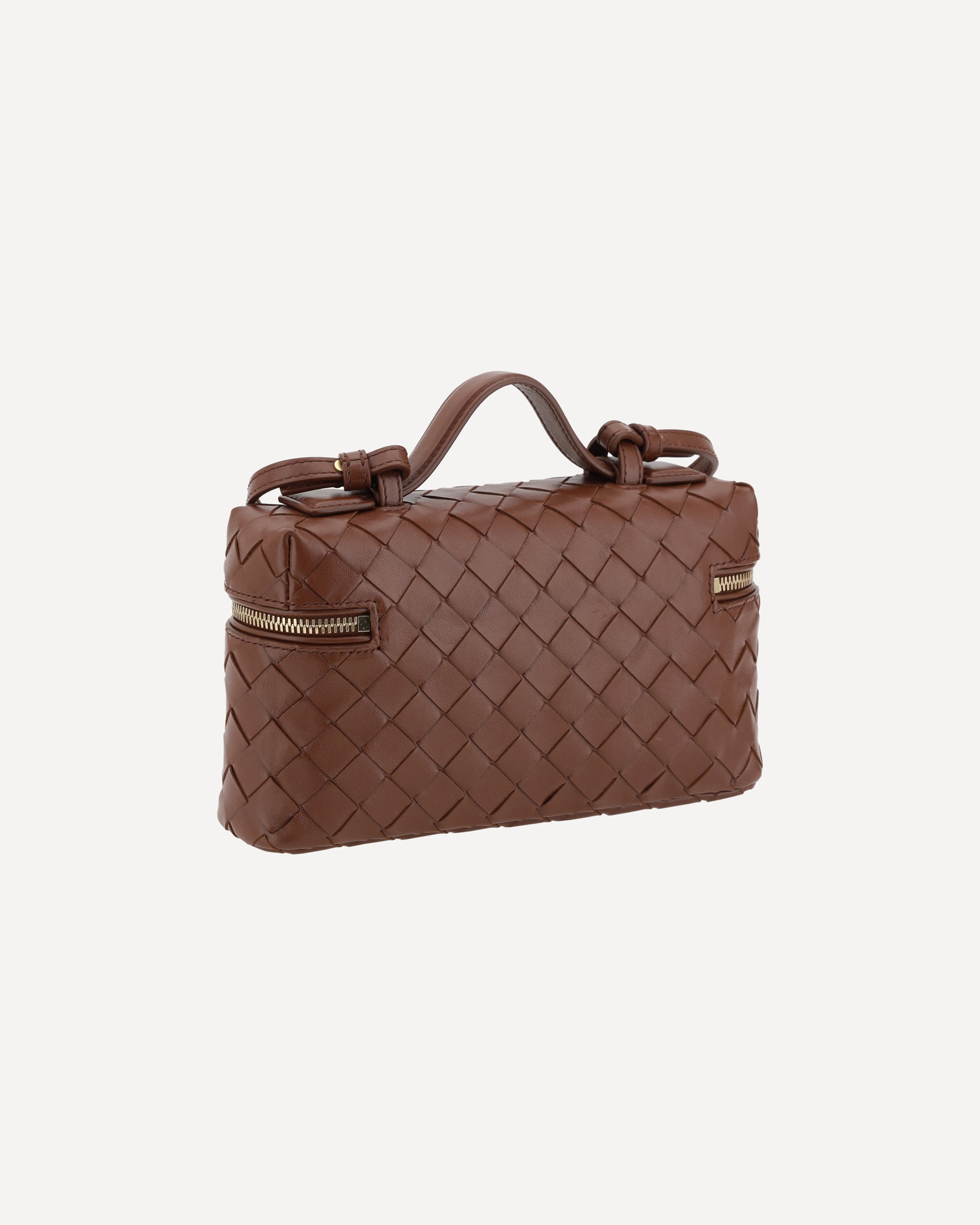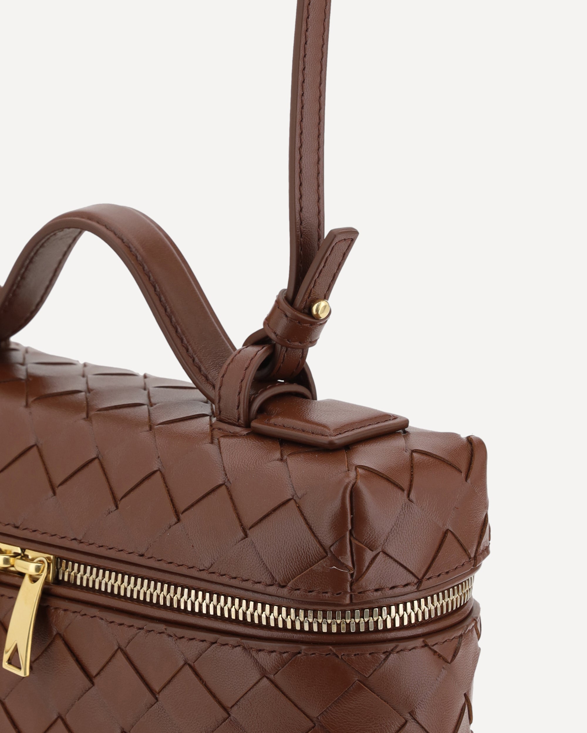The Bang Bang leather Vanity Case Shoulder Bag by Bottega Veneta is an elegant and distinctive accessory perfect for adding a touch of luxury to any look. Made of high-quality leather, it features a long shoulder strap with a knotted detail at the base, offering both comfort and a unique design element. Its iconic Intrecciato design, typical of the brand, is applied all-over, giving the item a sophisticated and recognizable look. The top lap closure, via a double-slider zipper, provides convenience and security. Contrasting gold-plated hardware adds a touch of luxury, while the bag's rigid design makes it perfect for a structured and refined look.