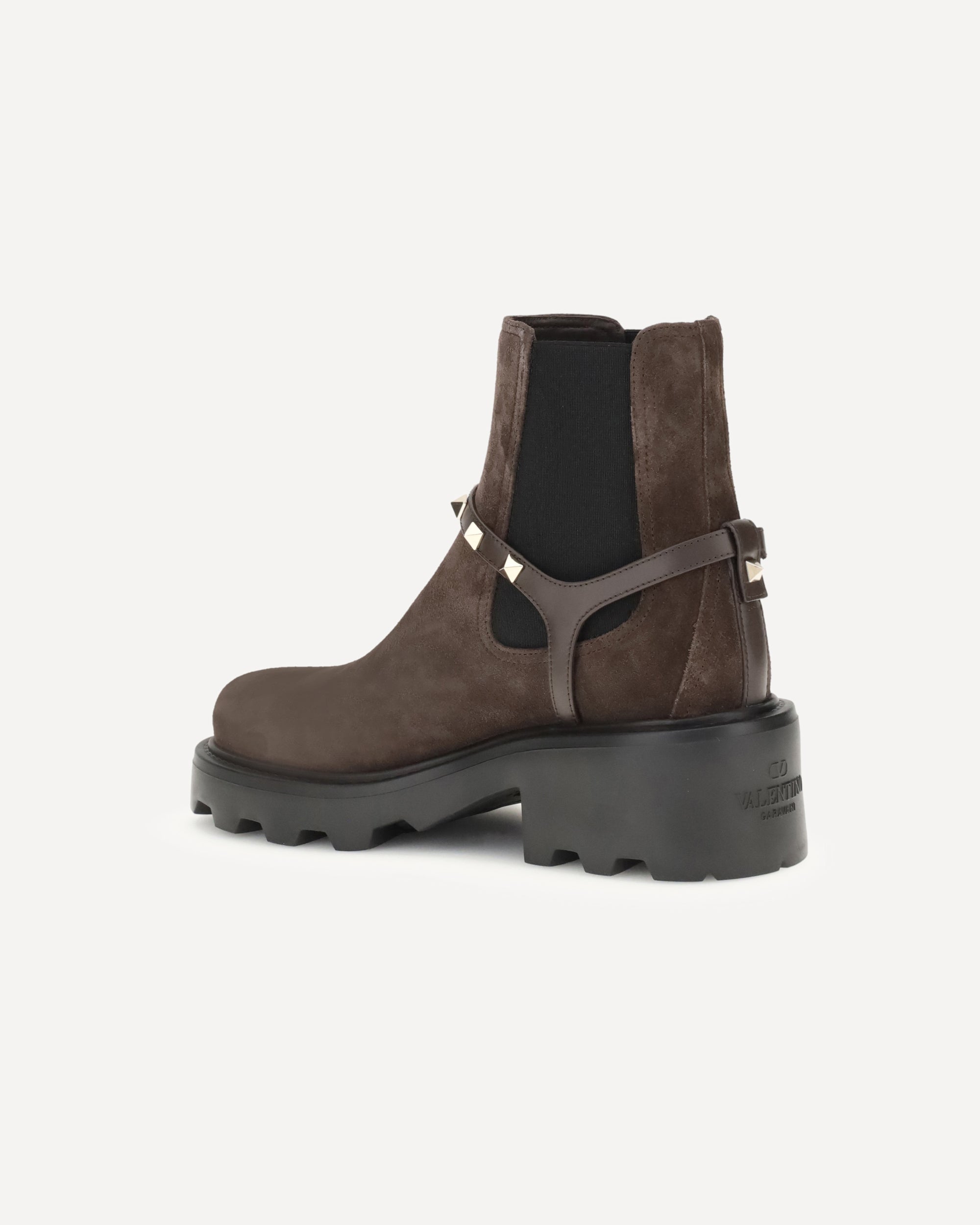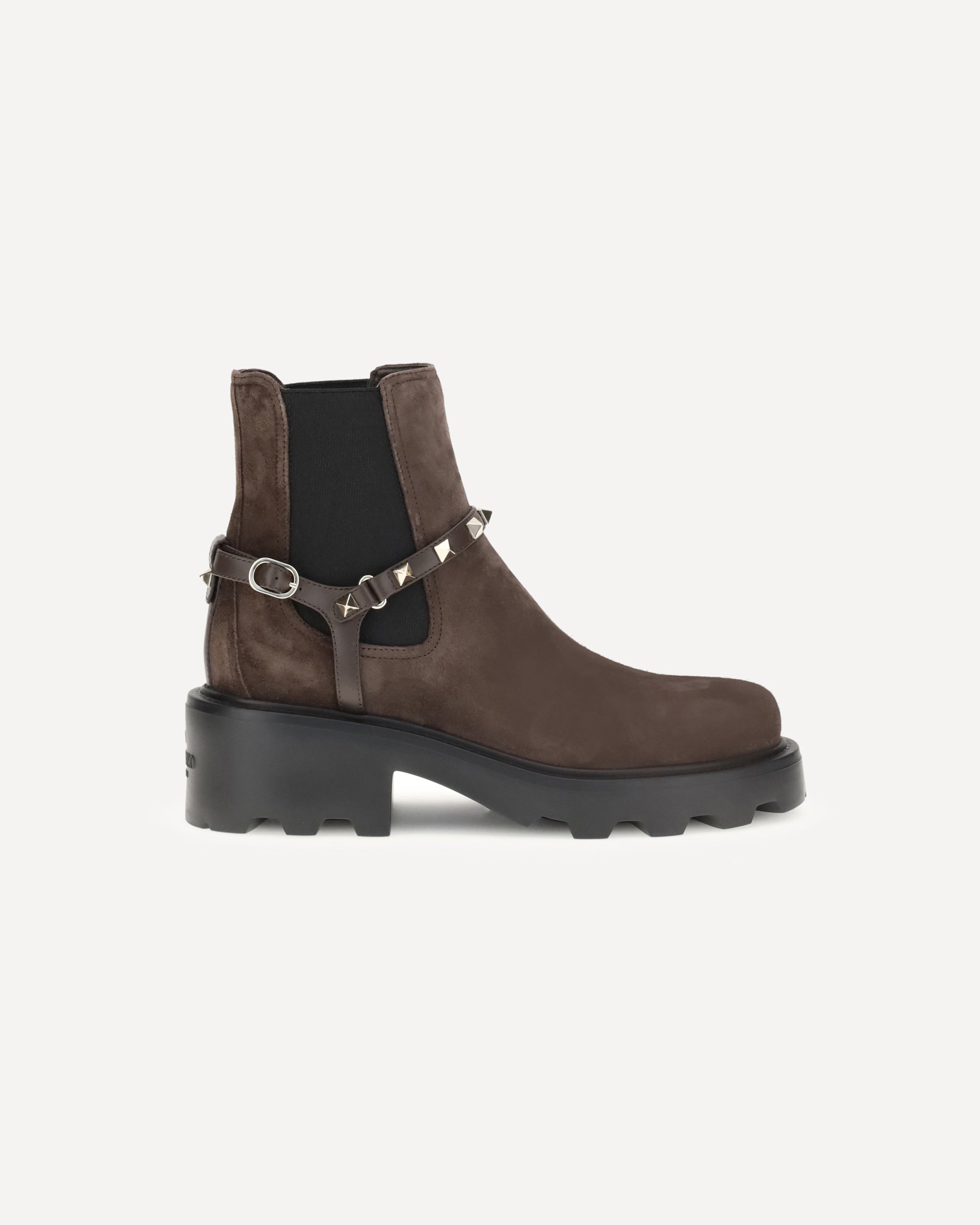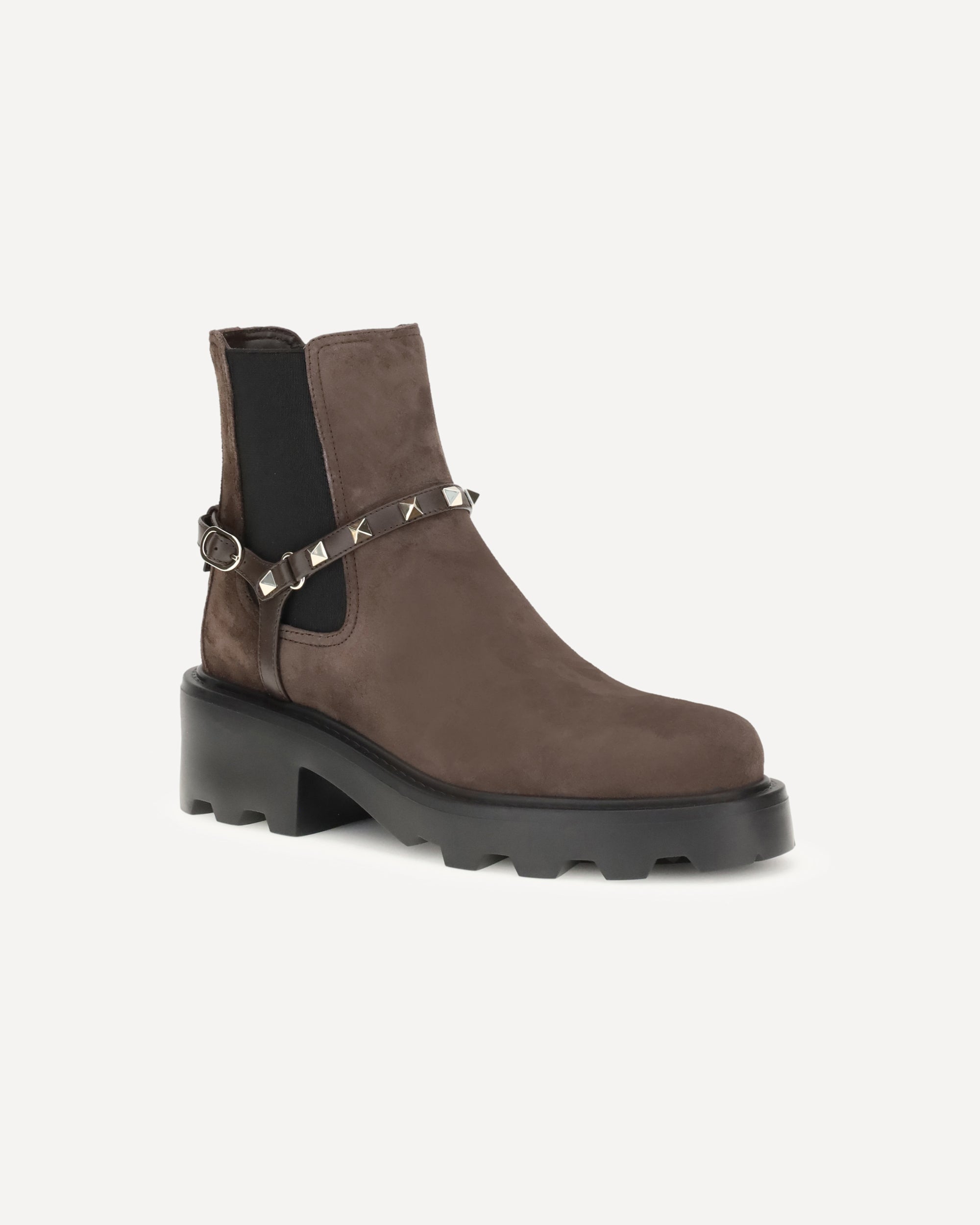 Valentino Garavani's Beatles Ankle Boots reinterpret a classic with a gritty, contemporary twist. Made of suede leather, they feature a rounded toe and a sturdy lug sole that lends character and grip. The adjustable strap with "V" buckle and iconic studs adds a distinctive detail, perfect for a bold yet sophisticated style.