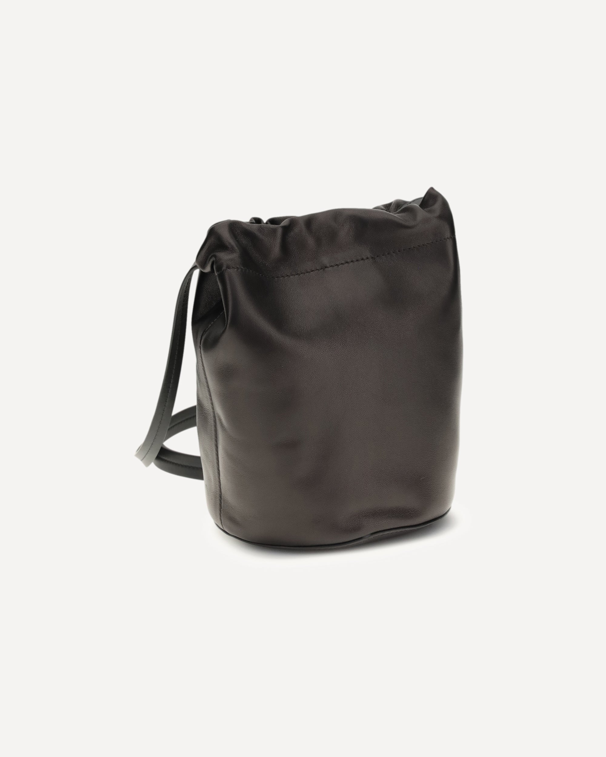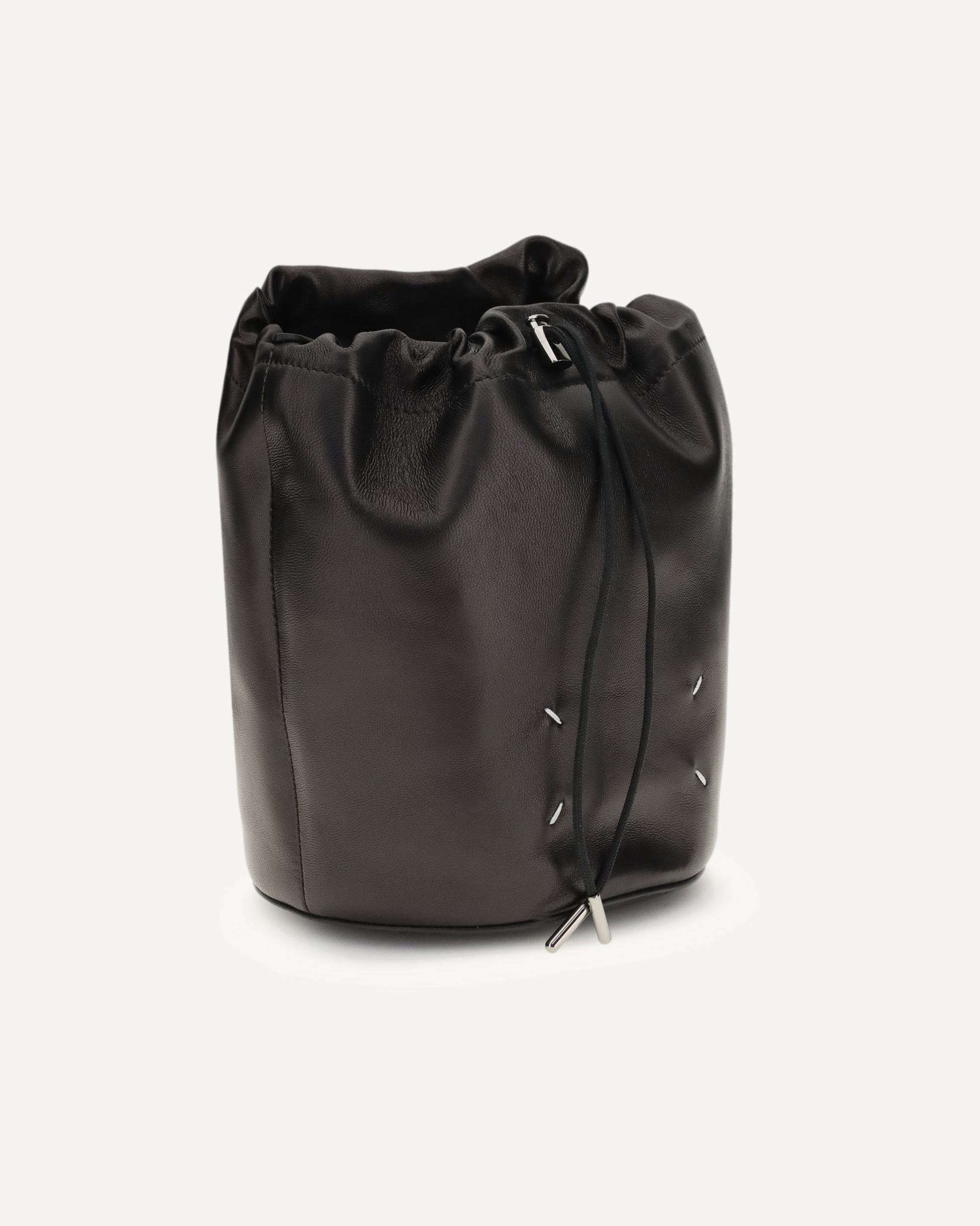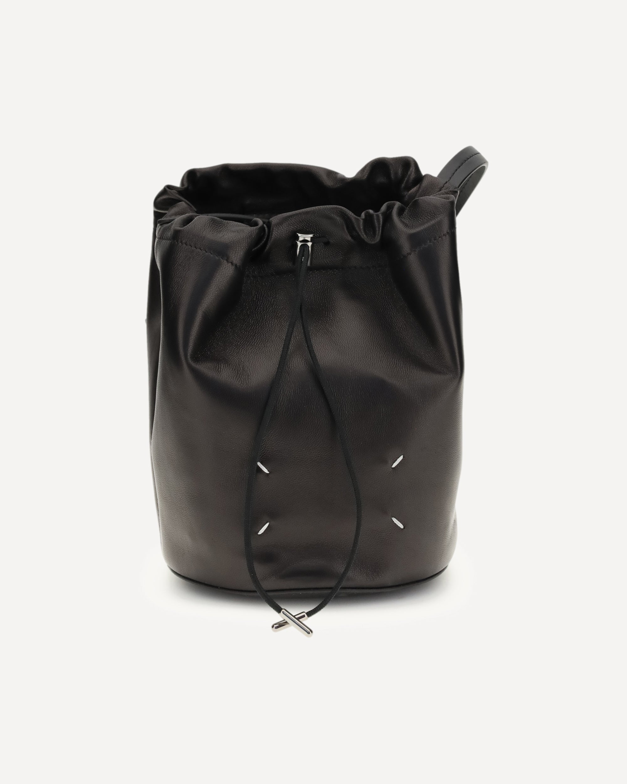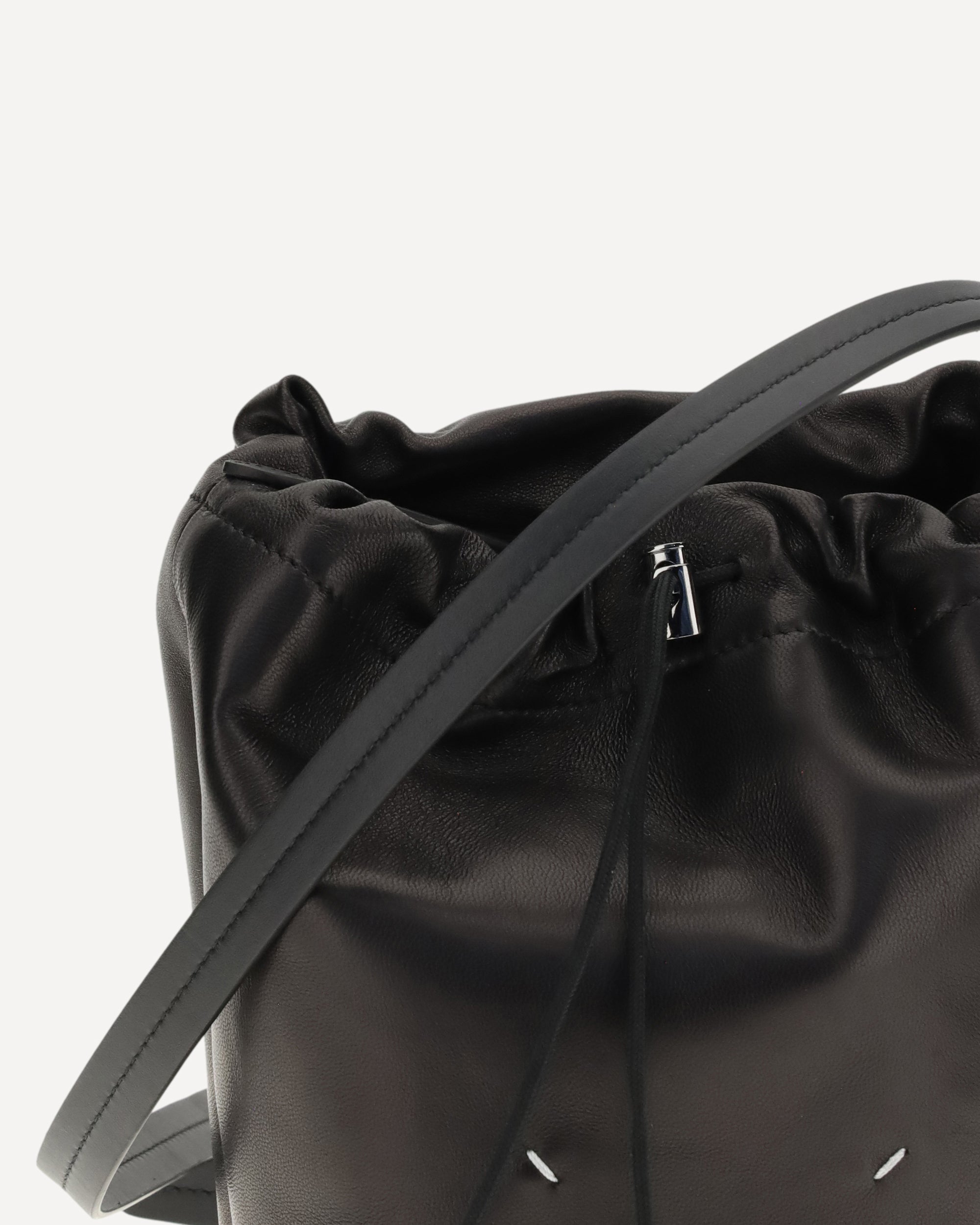 The leather Bucket Bag by Margiela combines minimal elegance with distinctive details. The drawstring closure and single shoulder strap ensure its practicality, while classic white stitching on the front adds an iconic and recognizable touch.
