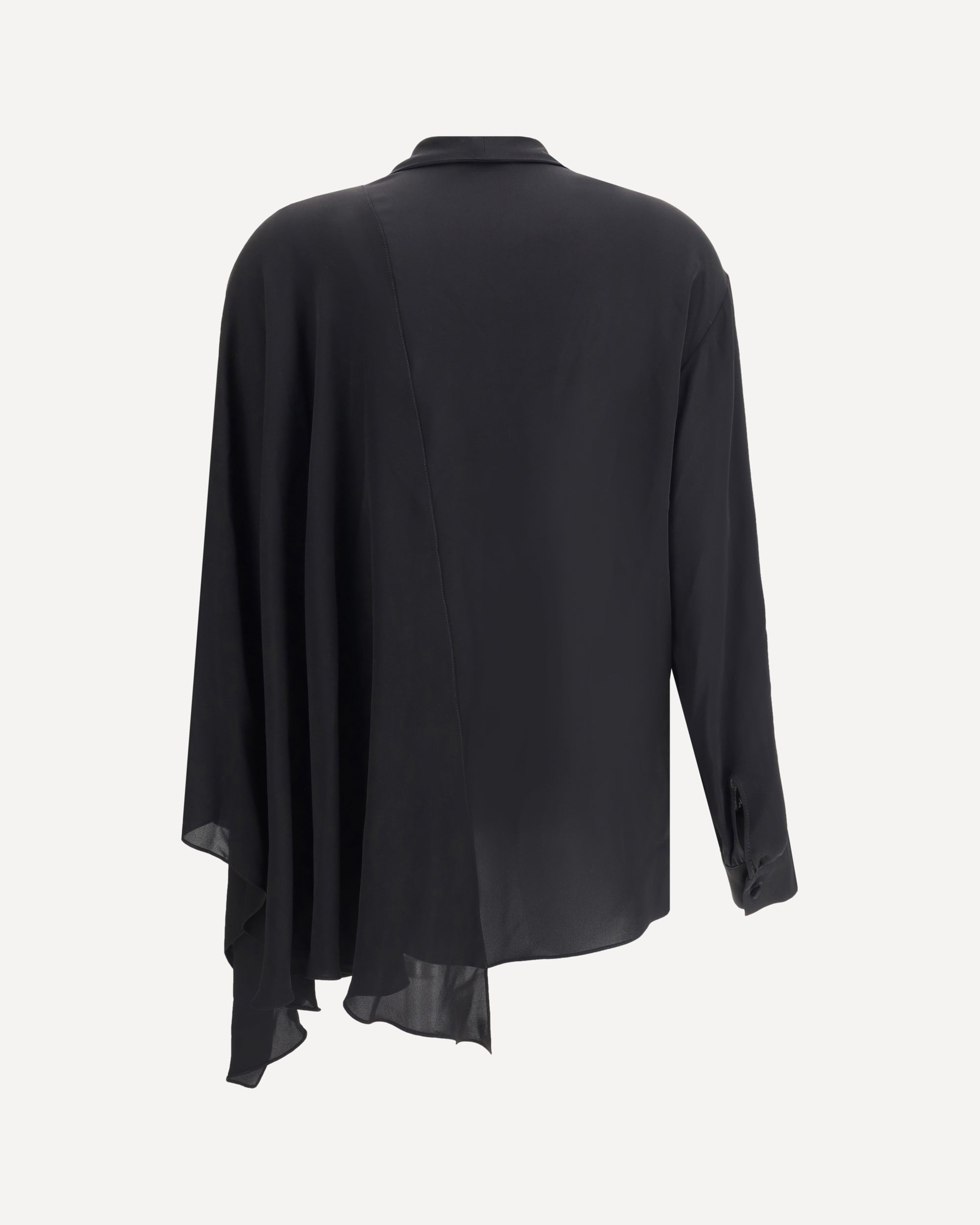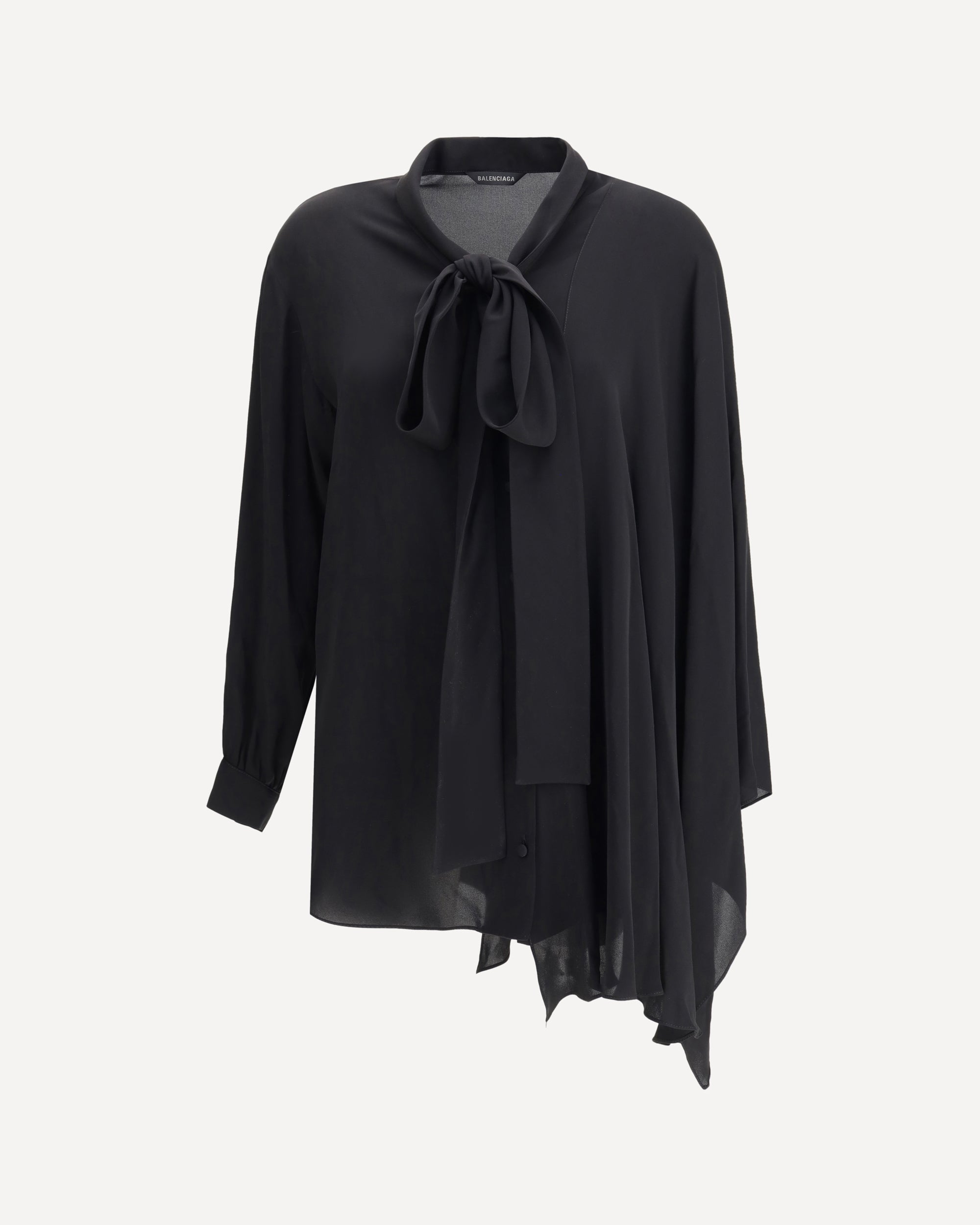 Balenciaga's asymmetrical Blouse is made of lightweight and fluid pure silk georgette. The sophisticated design is enriched with elegant ribbons to tie at the neck, a batwing sleeve and a long sleeve with a button-adjustable cuff. The front button closure completes the garment, while the loose fit ensures comfort and movement. A refined and striking pattern, perfect for feminine looks with contemporary style.