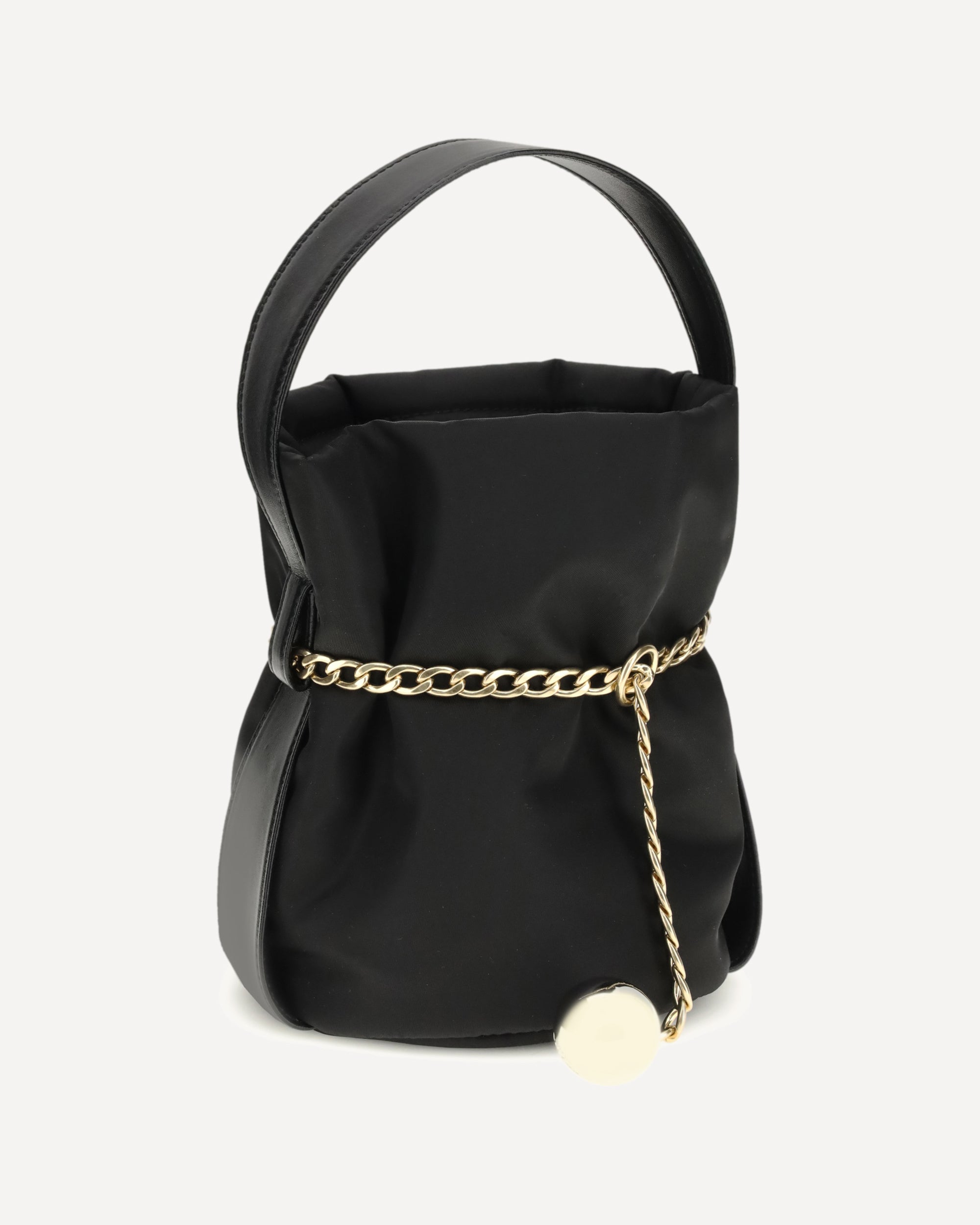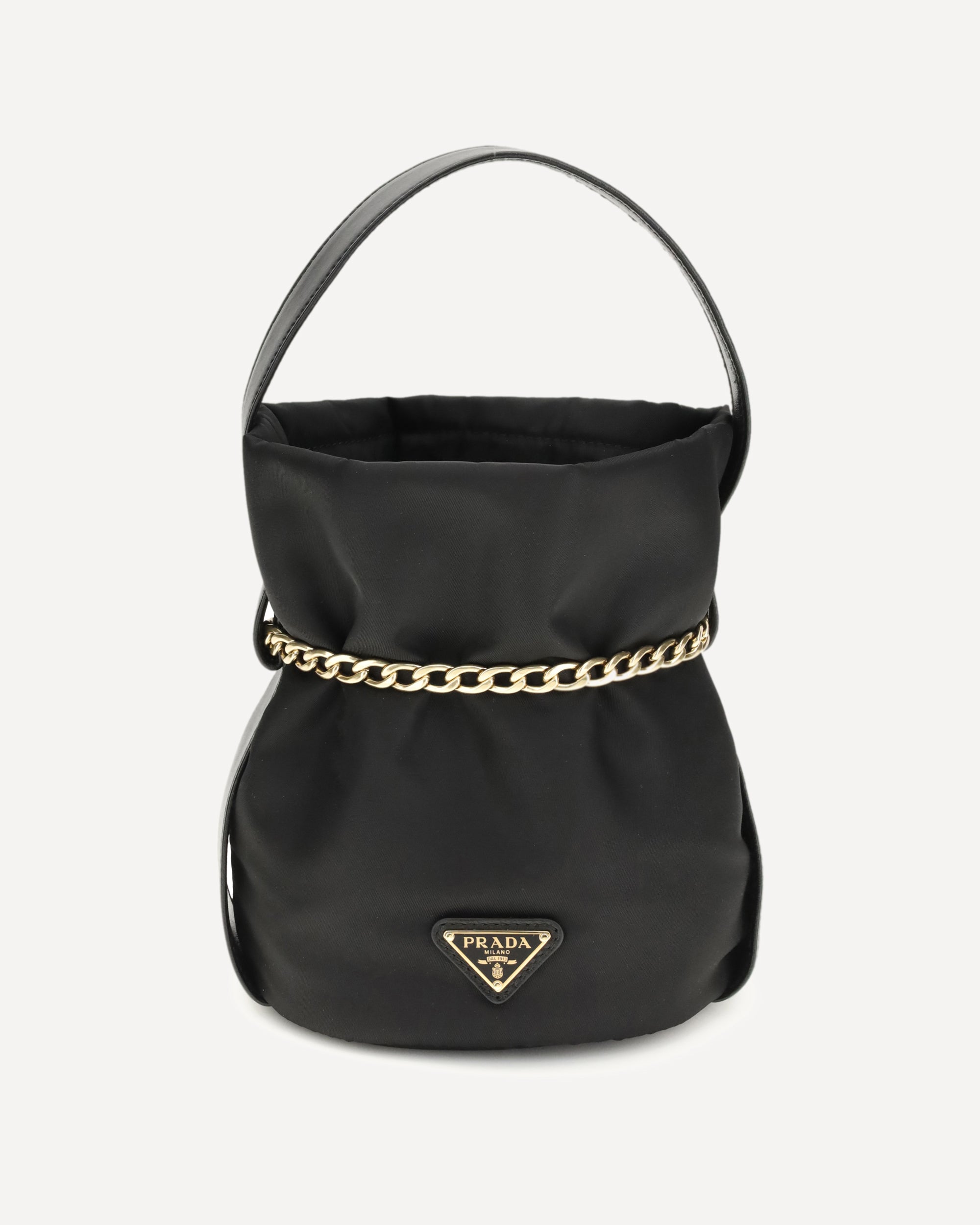 The Petit Sac Noir is a mini bucket Bag by Prada with a soft, modern silhouette crafted from Re-Nylon, Prada’s innovative material produced from recycled and purified ocean-collected plastics. It features a functional external pocket and the signature enameled triangle logo on the back. Designed for versatility, it can be carried by hand or worn crossbody thanks to its nappa leather handle and Saffiano leather shoulder strap. Lightly padded and finished with metal hardware, the bag closes with a chain fastening and is fully lined in Re-Nylon.