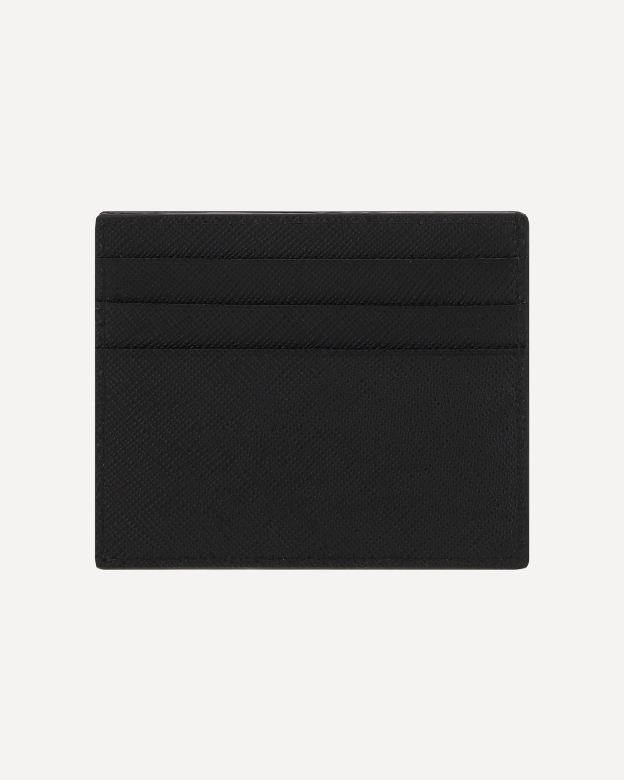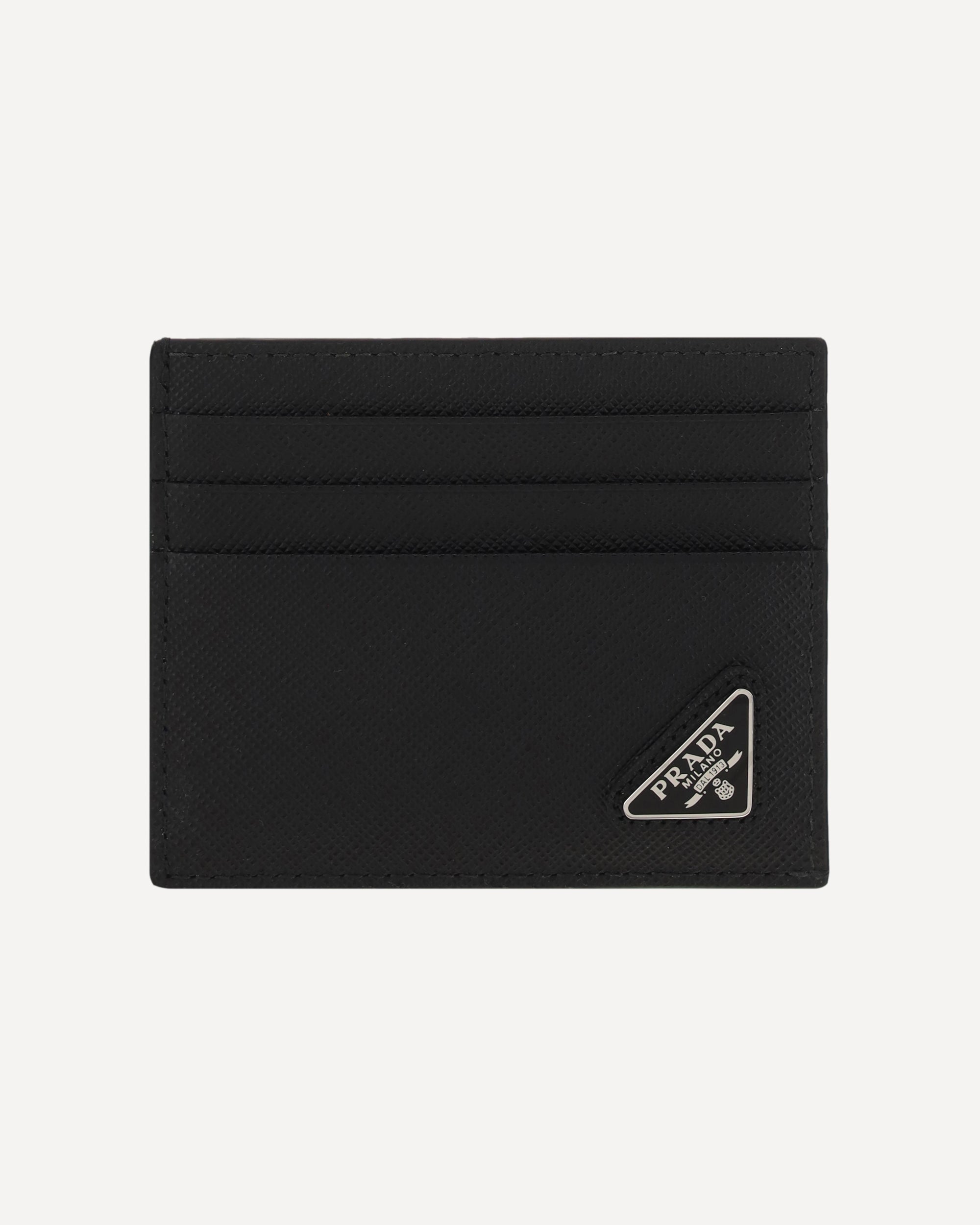 Calfskin Card Holder by Prada, card slots on front and back, iconic enameled triangular plaque with brand signature applied on front.