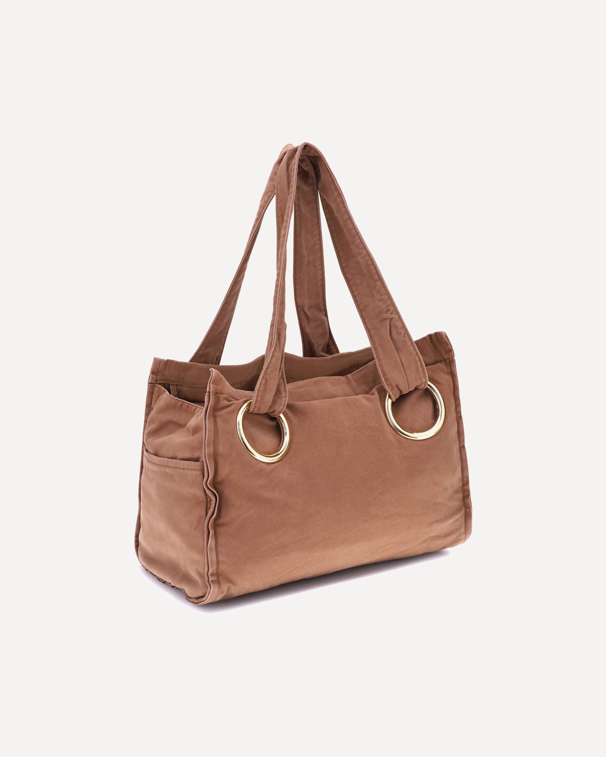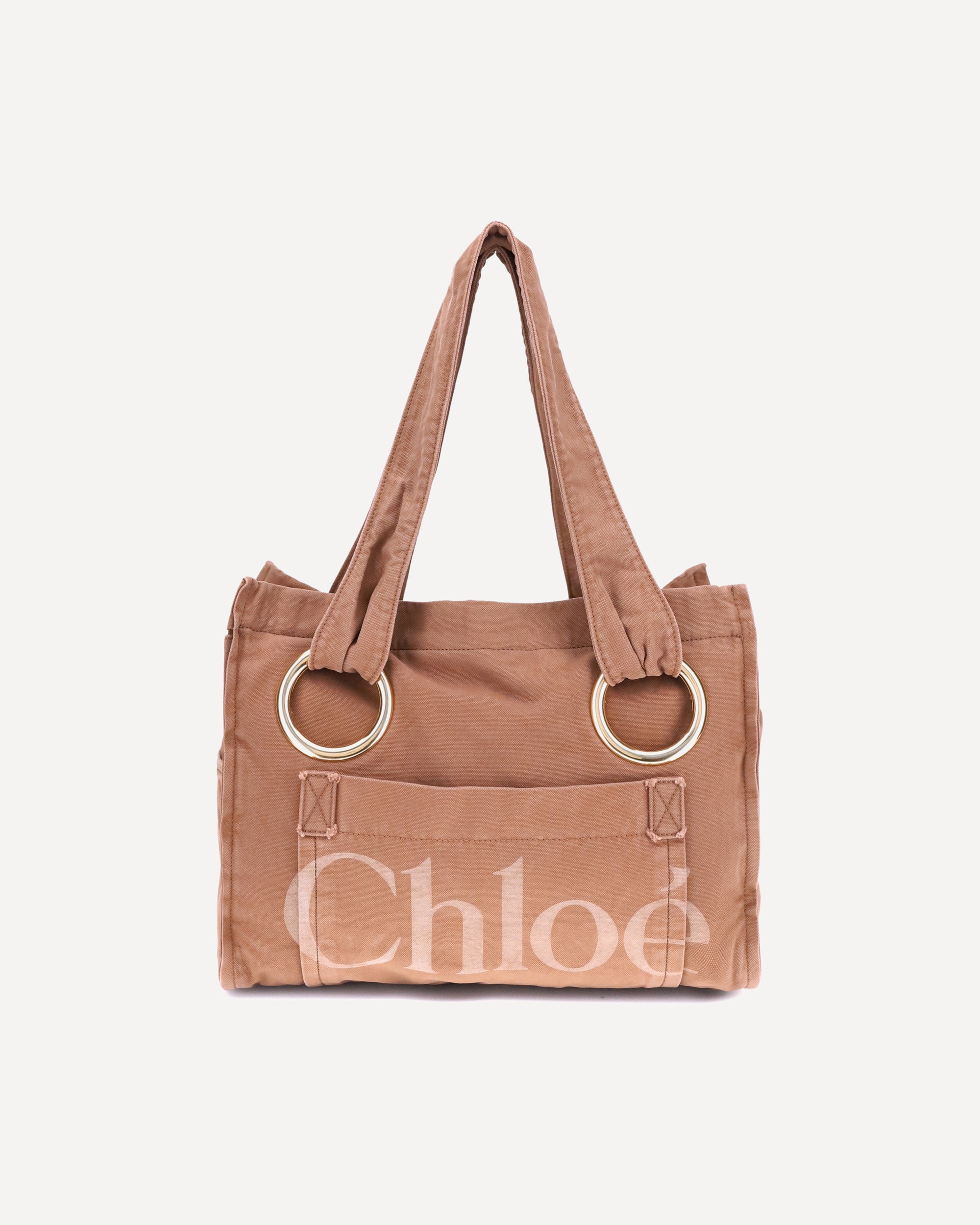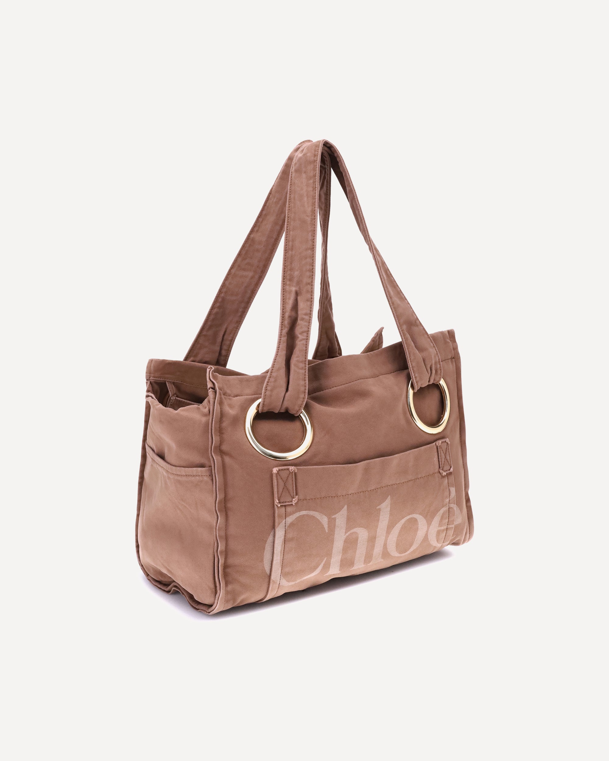 Cotton Plage Shoulder Bag by Chloé with two top handles and magnetic closure. It features two welt pockets on the side panels and a patch pocket on the front with the brand's iconic monogram. The interior consists of a single large compartment, perfect for organizing essentials in style and practicality.