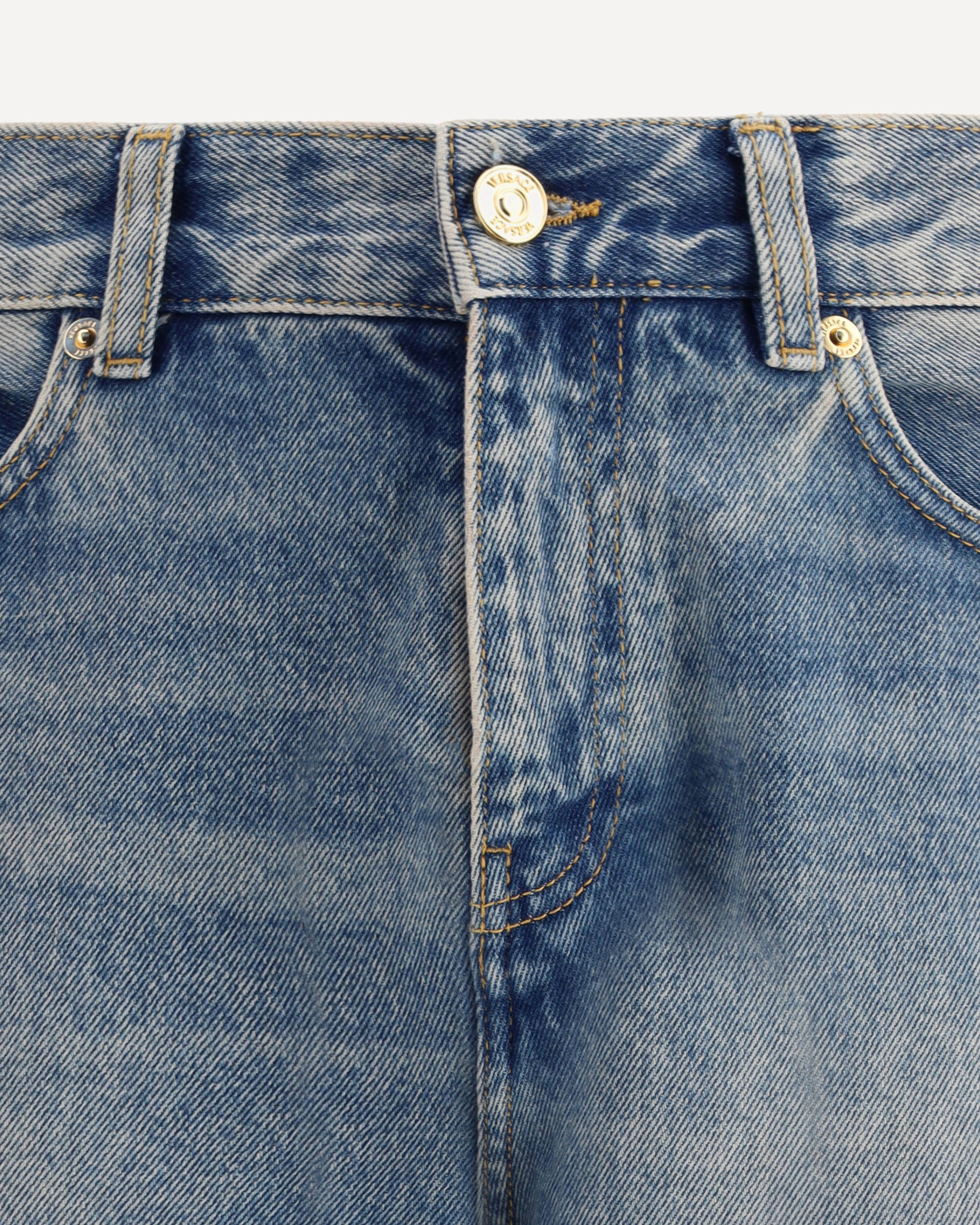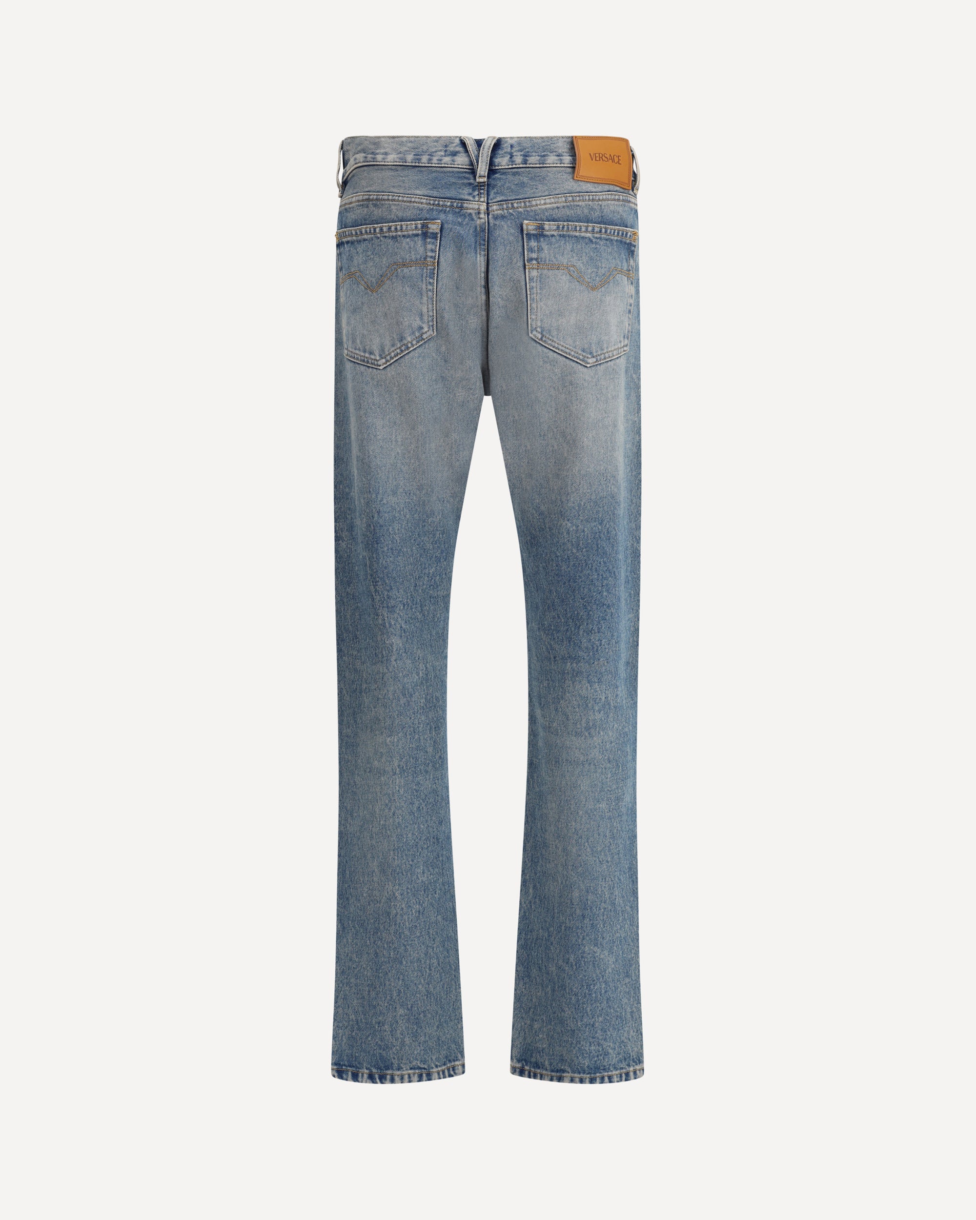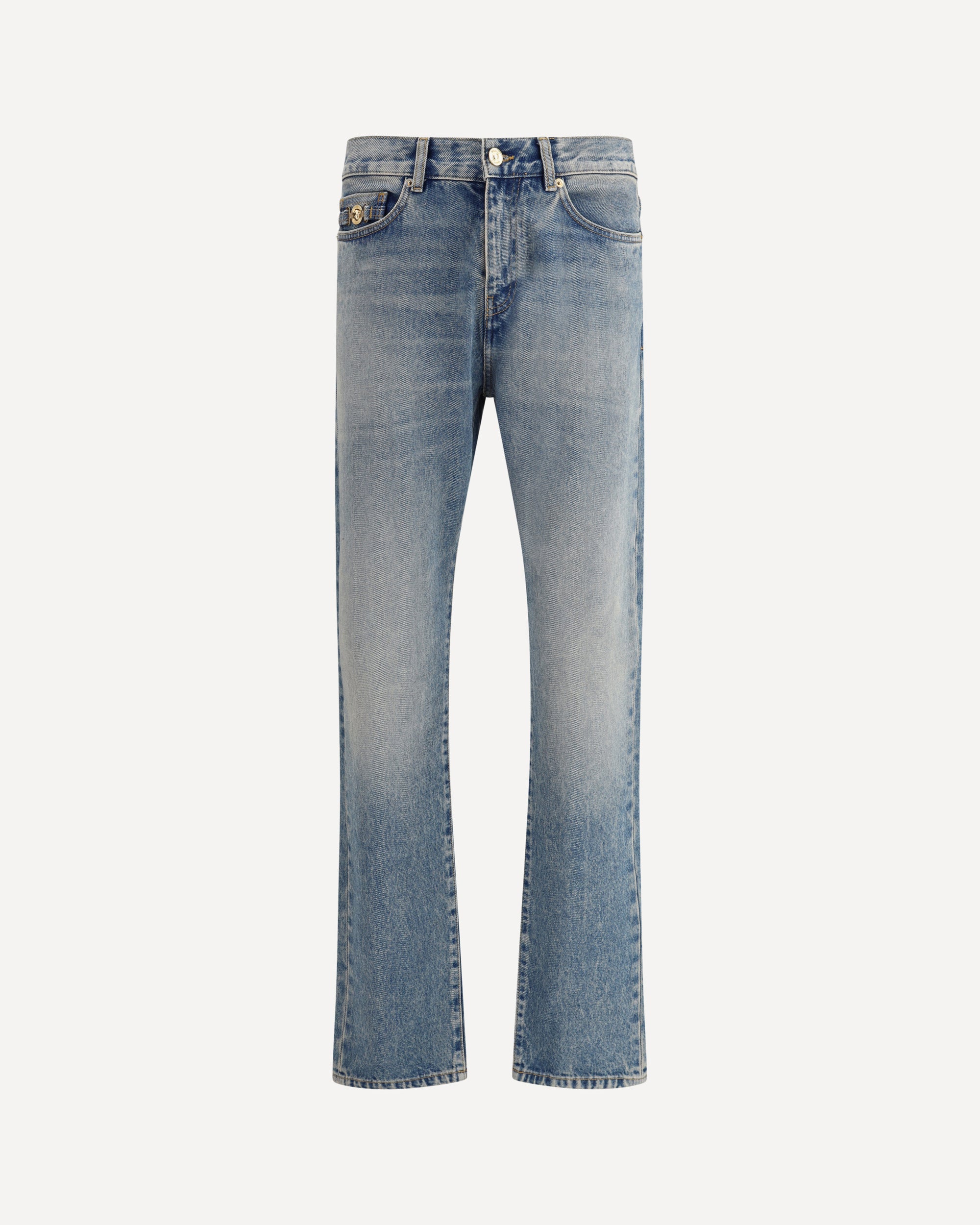 Versace's cotton Jeans combine classic design with the Maison's iconic codes. They feature a front zipper and button closure, belt loops at the waist and a traditional five-pocket pattern. On the front, a metallic detail with the Medusa head, the brand's distinctive symbol, stands out on the breast pocket, while a logoed leather patch is applied on the back. A garment with a strong character, perfect for elevating everyday looks with a touch of bold luxury.