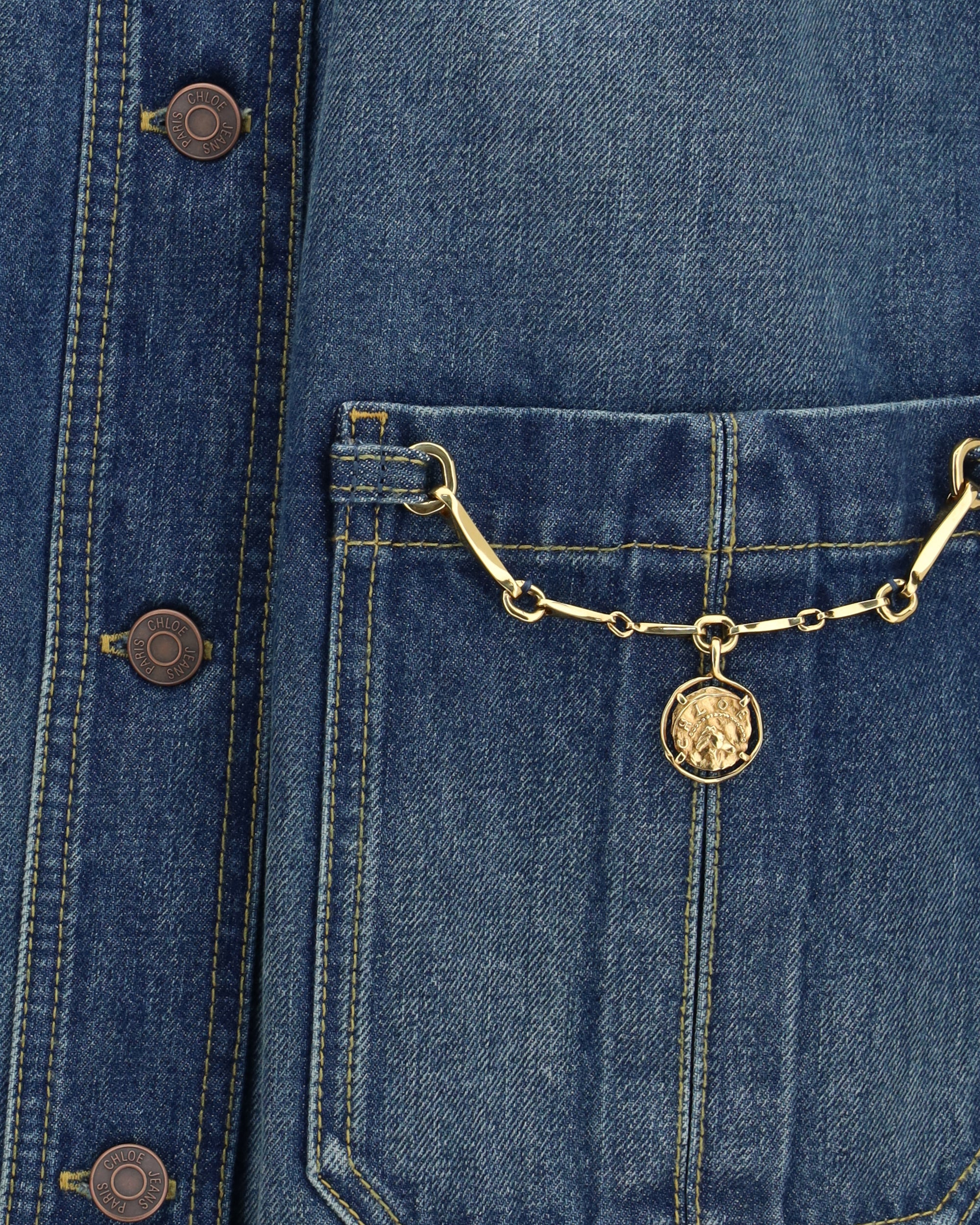 The gathered high-neck Jacket by Chloé expresses a romantic yet contemporary aesthetic through soft volumes and signature details. Crafted from cotton denim, it features puff sleeves that enhance the silhouette and patch pockets embellished with chains and Horse medallions, a distinctive brand hallmark. Engraved button fastening completes the design, resulting in a bold and editorial outerwear piece.