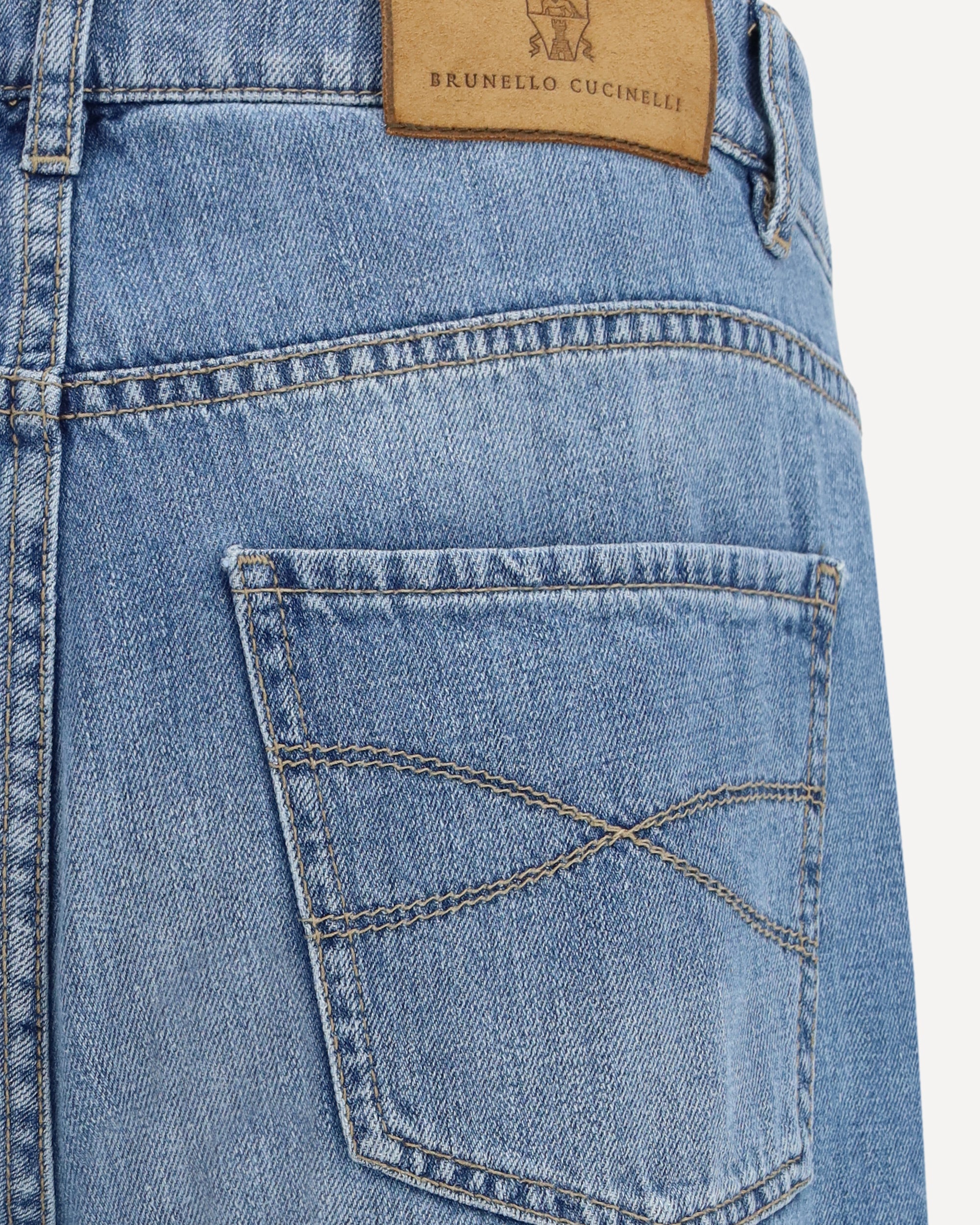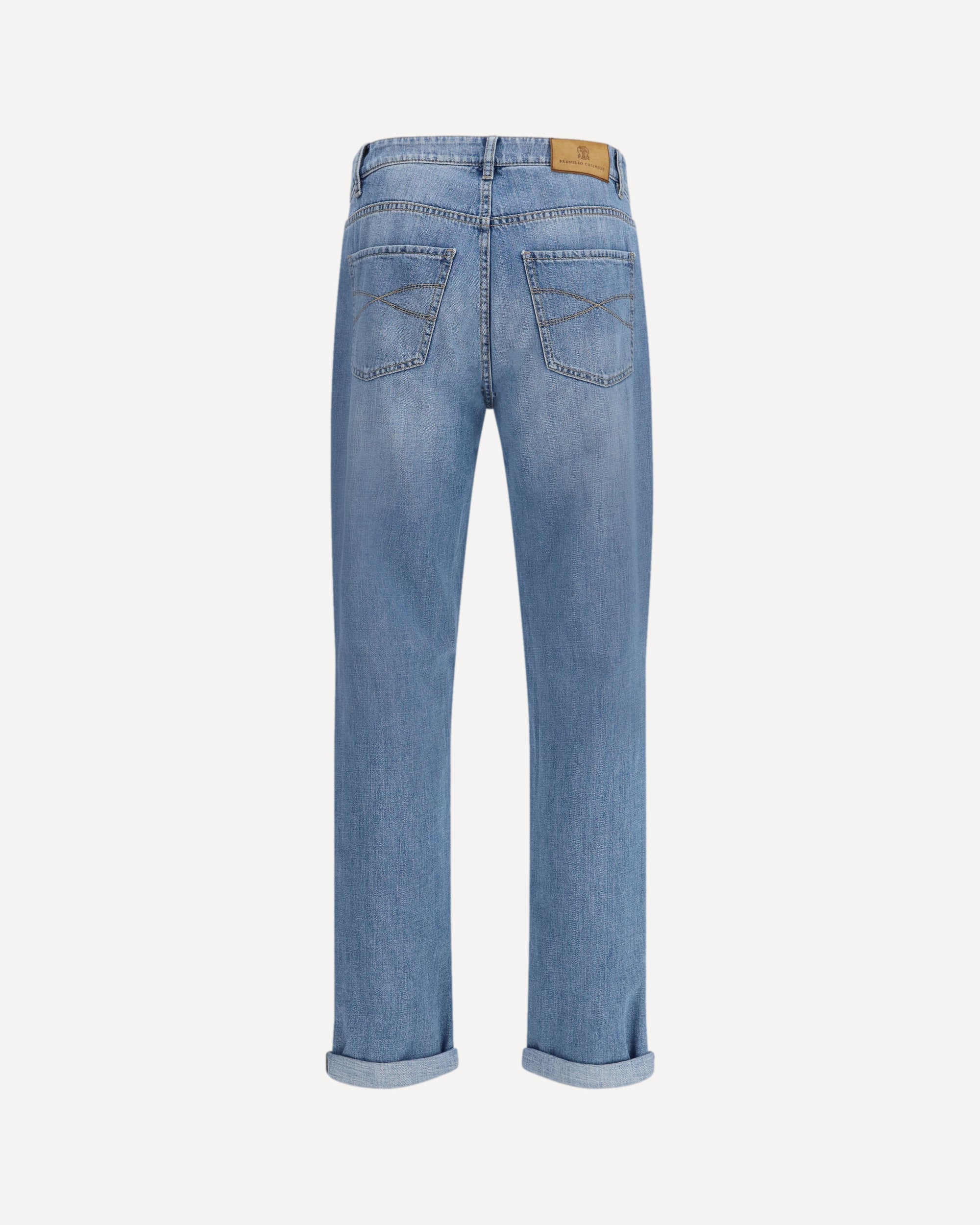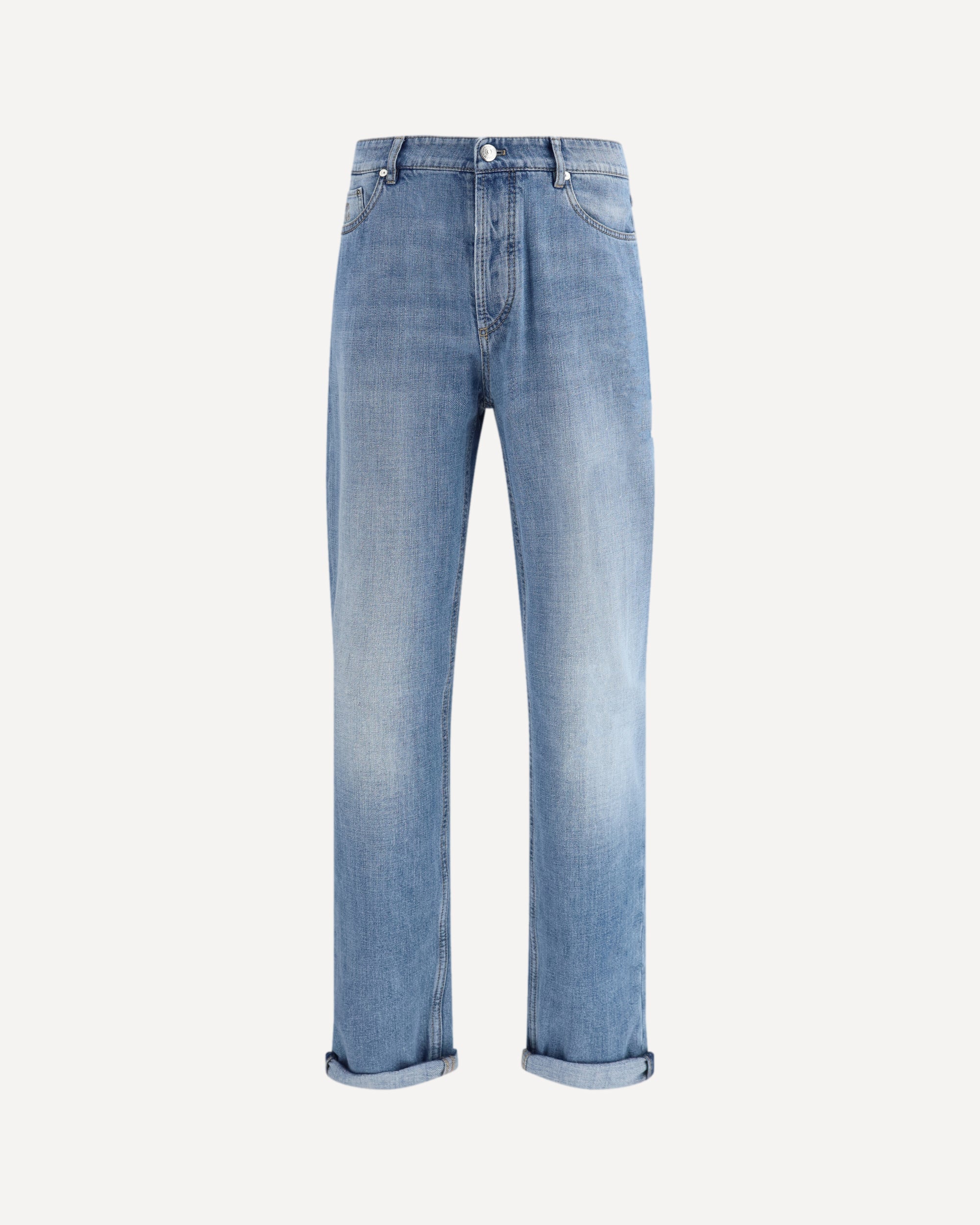 The cotton Jeans by Brunello Cucinelli are a casual yet refined style, perfect for a versatile, contemporary look. The front button closure adds a touch of originality, while the straight five-pocket style offers a comfortable fit and classic design. Belt loops on the waistband allow you to customize the fit. A leather patch with the brand's iconic pressure-printed signature is applied to the back, adding a distinctive, high-quality detail. The turn-up hem adds a touch of elegance to the design, making these jeans ideal for those seeking a garment that is both luxurious and practical.