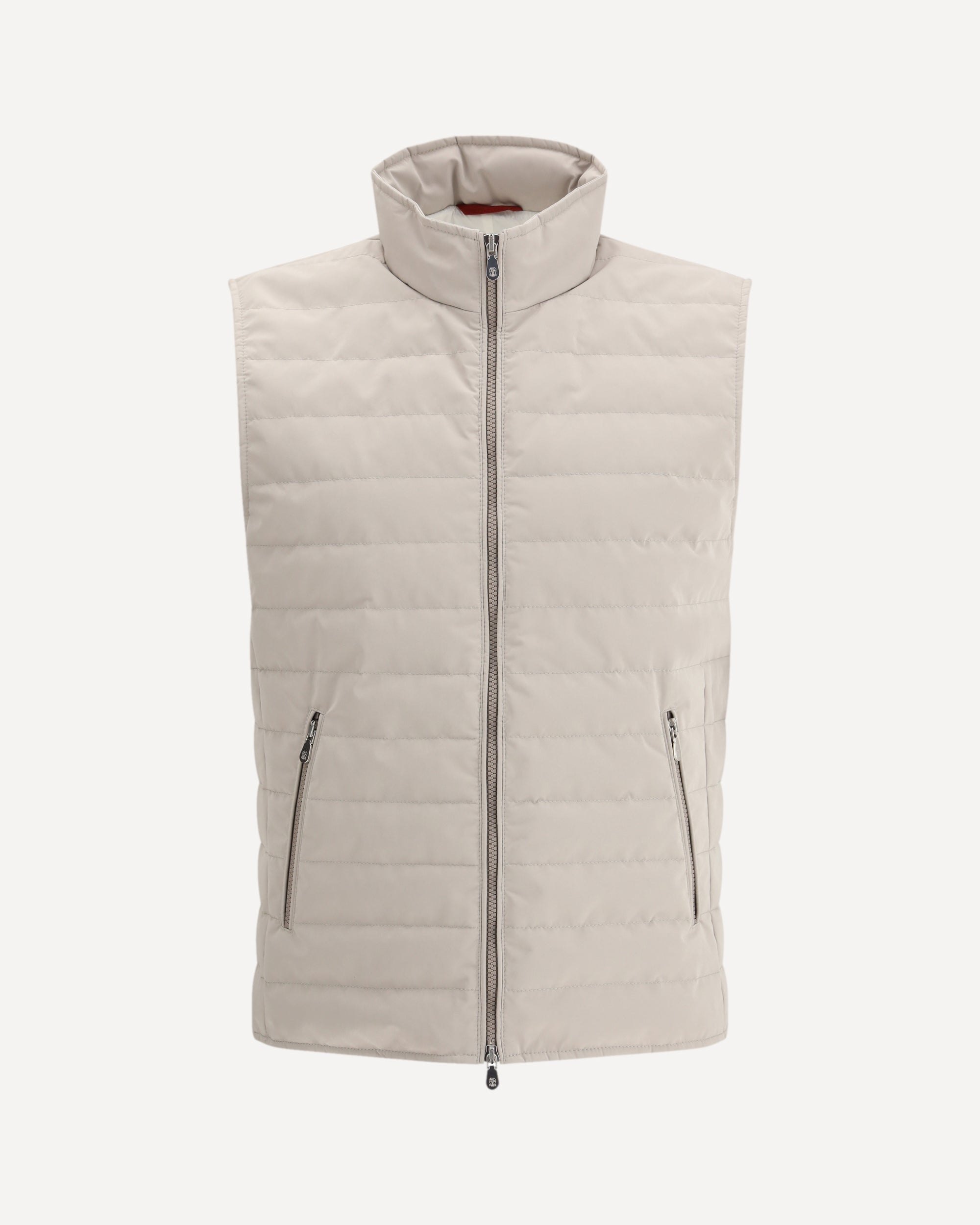The quilted Vest Jacket by Brunello Cucinelli features refined padding that offers both lightness and warmth. The design includes a front closure with a two-way zipper, two welt pockets on the front, and a slightly raised collar that adds elegance and protection. A versatile and sophisticated piece, ideal for completing both casual and more polished looks.