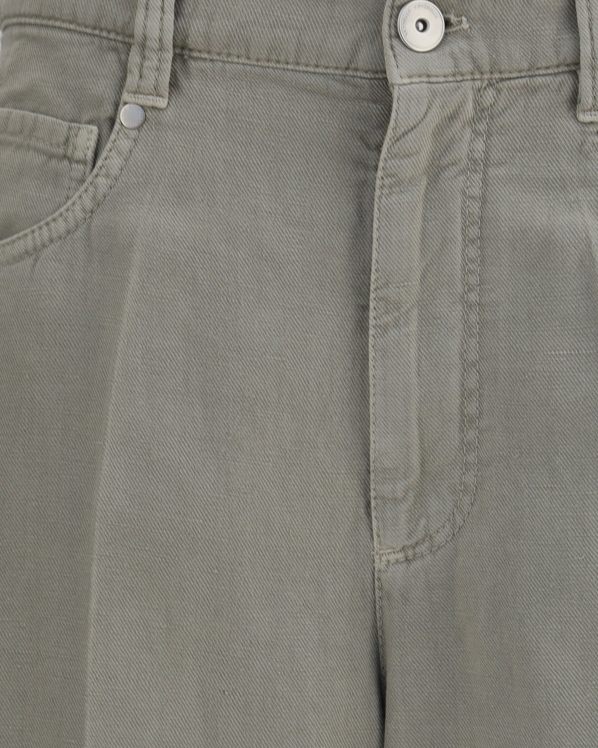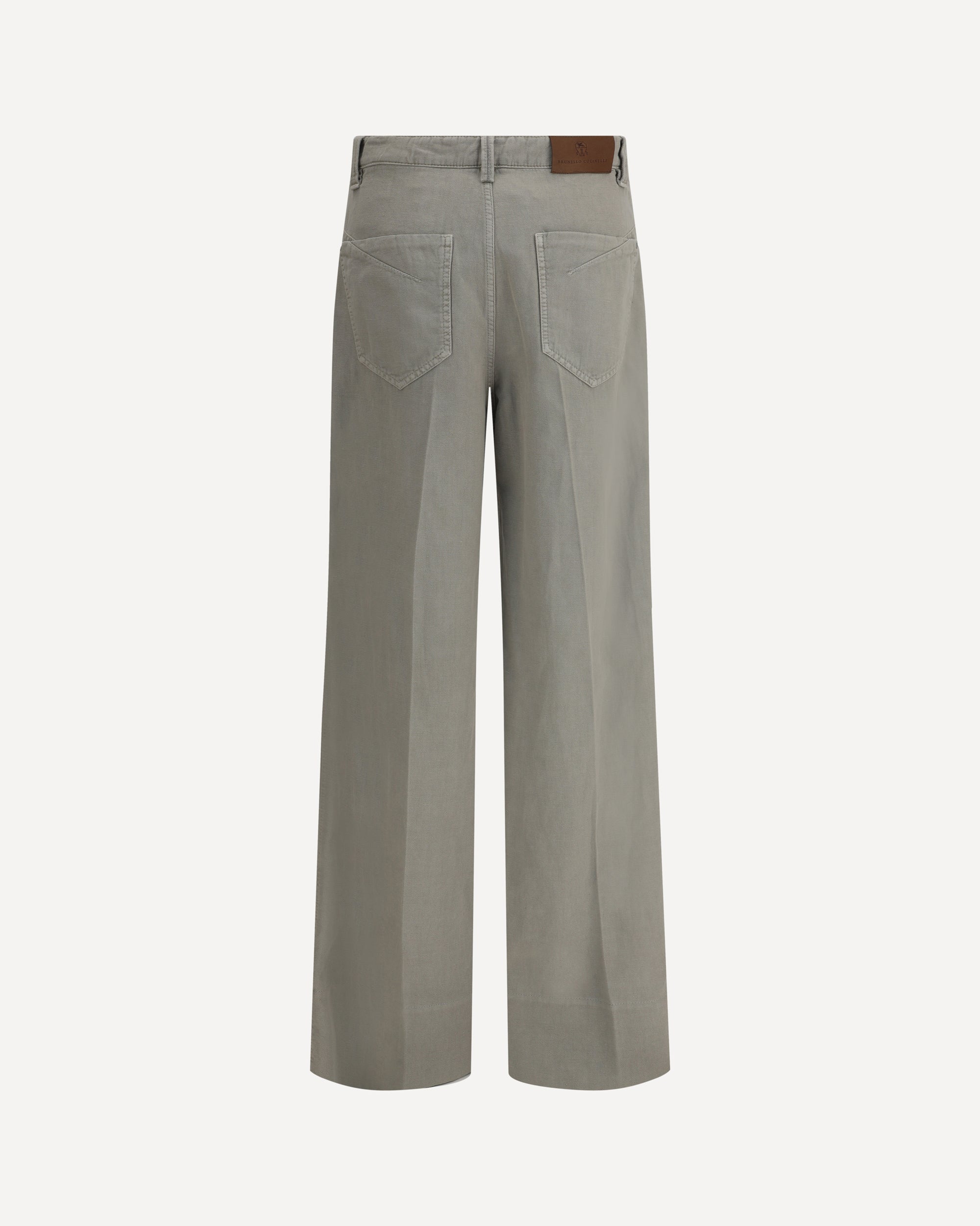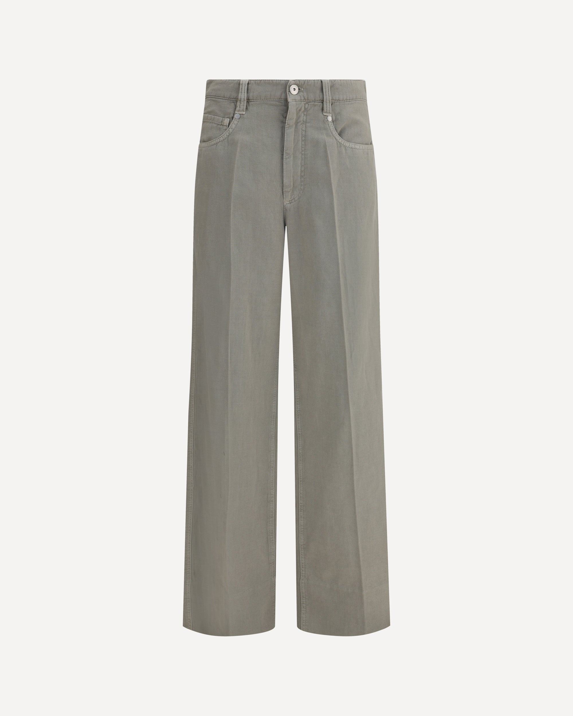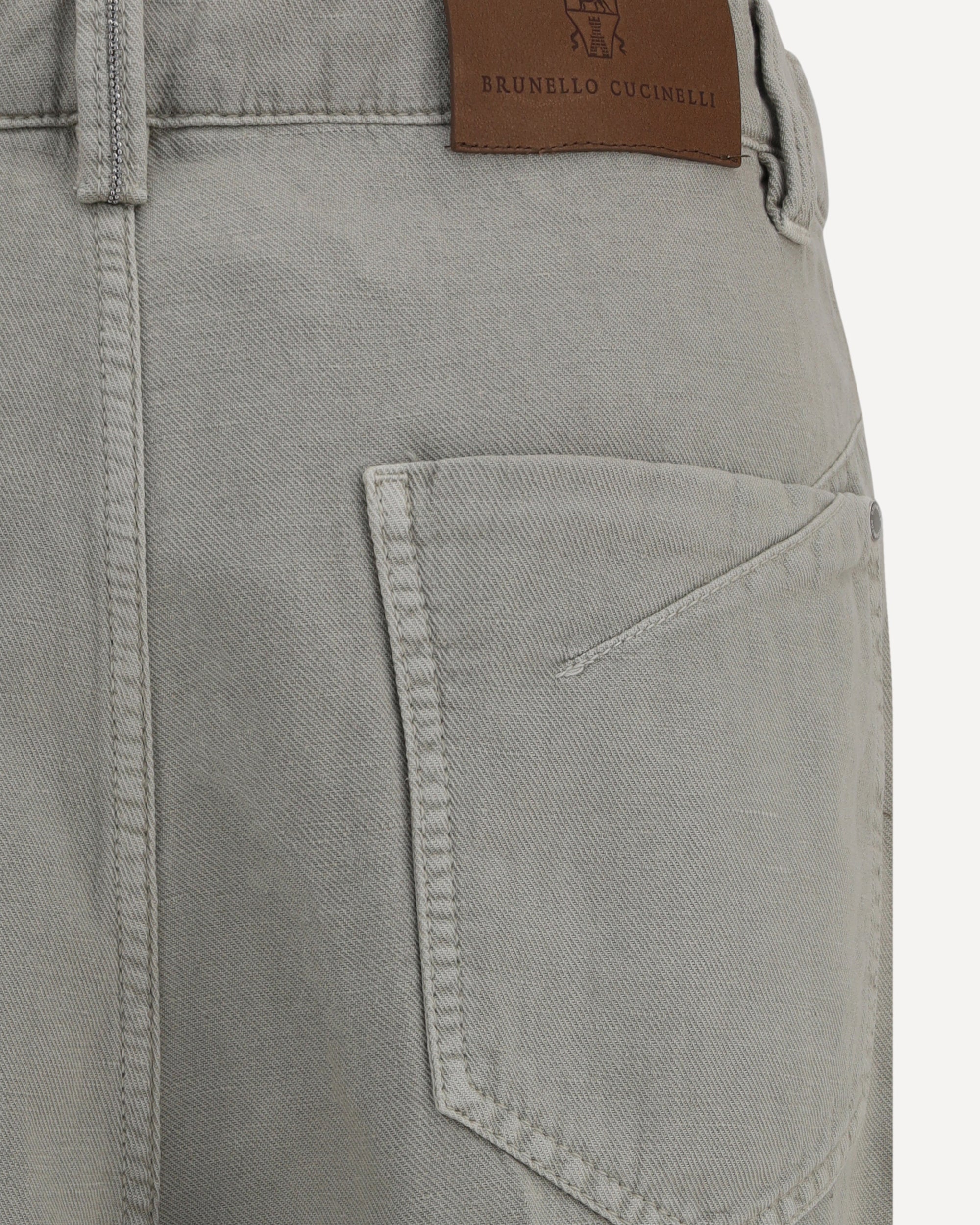 Brunello Cucinelli's cotton linen Jeans feature a mid-rise, five-pocket style perfect for a stylish and versatile look. The front zipper closure adds practicality, while the wide-leg design offers a comfortable, modern fit. Belt loops at the waistband are embellished with iconic appliquéd shiny jewels, adding a touch of sophistication. Applied logo leather patch on the back adds a distinctive and classy detail.