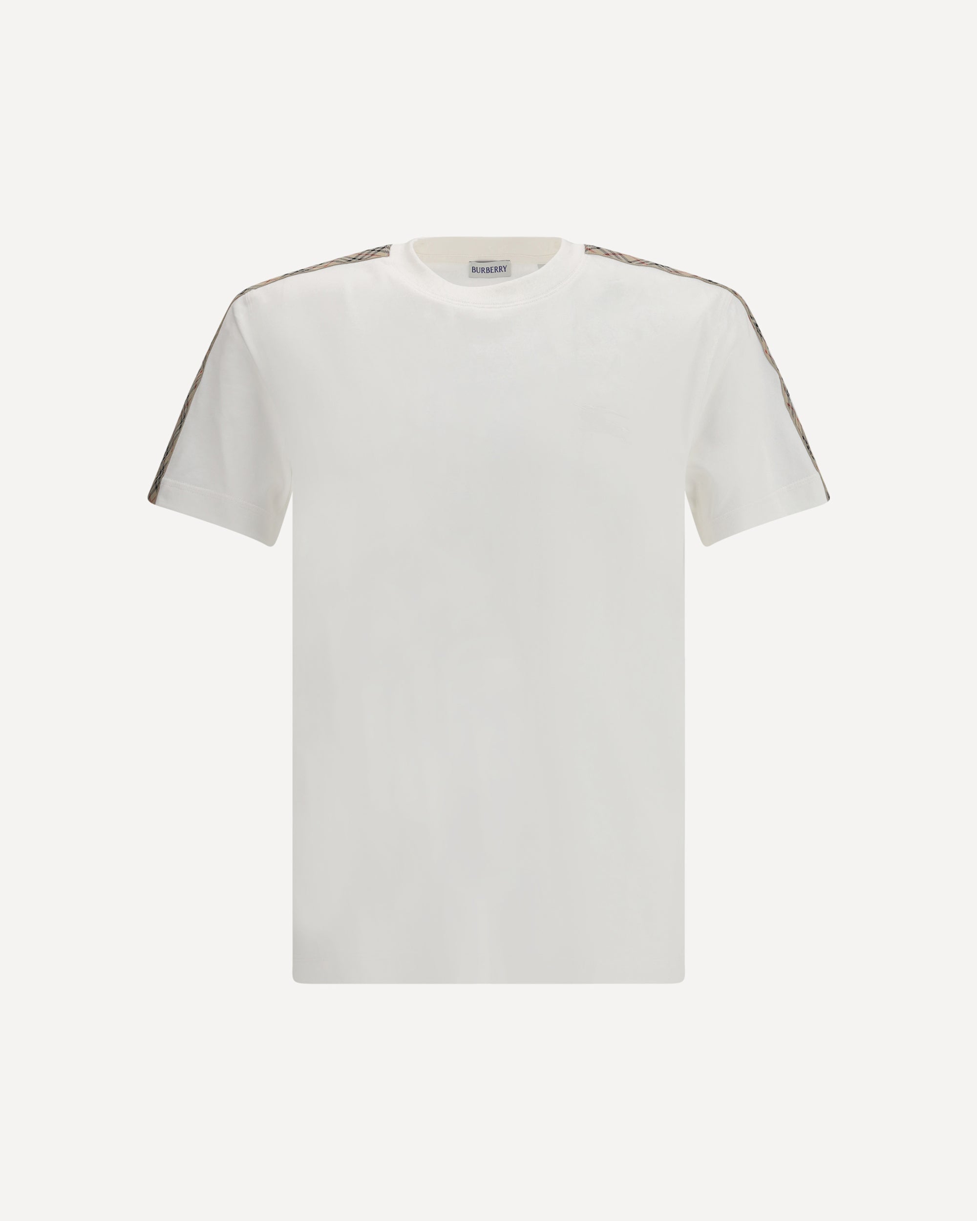 Burberry's cotton T-Shirt is a stylish and distinctive garment made from high-quality cotton for comfort and coolness. It features a ribbed crew neck, which adds a classic touch to the design. Appliqué shoulder bands in an Archivio Check pattern recall one of Burberry's most iconic motifs, giving the sweater a distinctive, modern look. The Equestrian Knight logo embroidered on the front represents the brand's historic symbol, giving the garment a touch of sophistication and tradition.