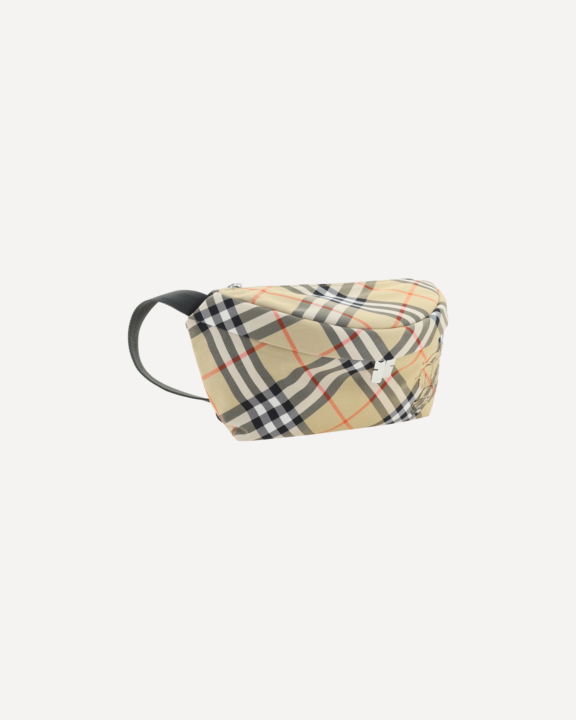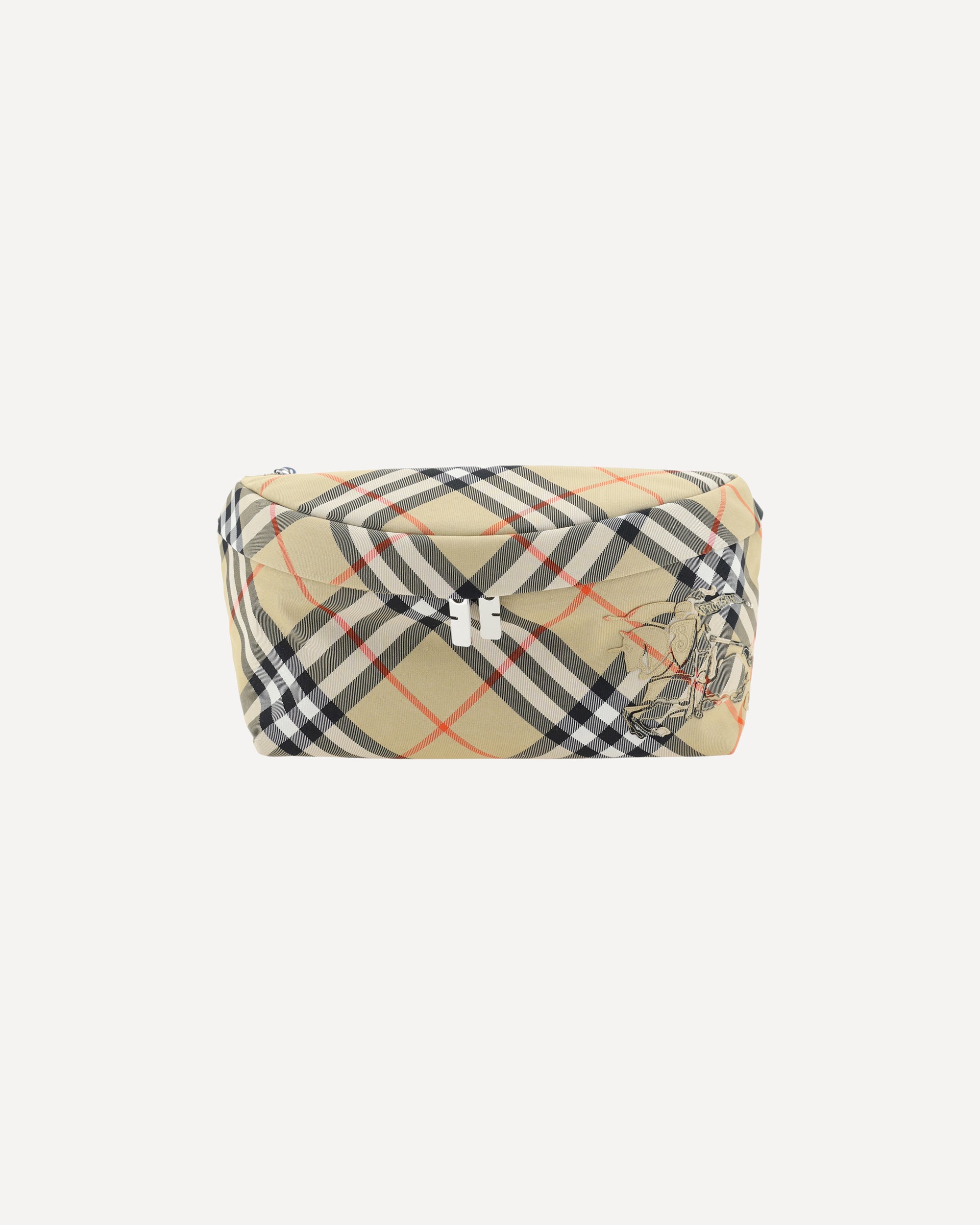 Fanny Pack by Burberry, iconic all-over Check pattern, adjustable waistband with clip closure, concealed front zipper closure.