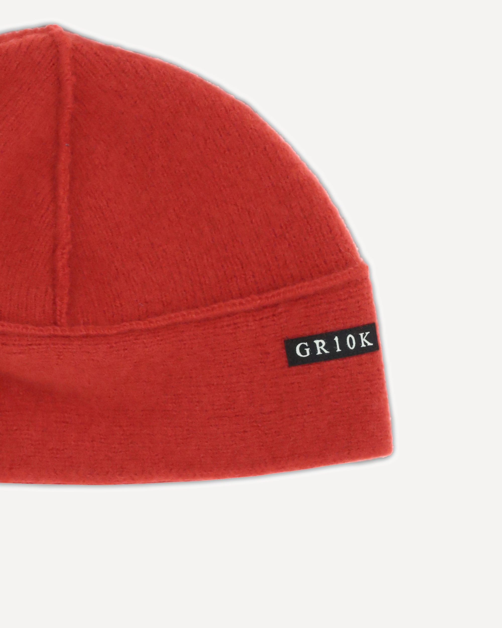 Beanie Hat by GR10K expresses the brand's signature industrial and experimental aesthetic. Made of 100% felted wool, it features raw edges and an inverted construction that enhances its raw and contemporary attitude. On the back, a pad-printed Hypalon label with GR10K logo adds a technical and distinctive detail, completing an accessory designed for those looking for unconventional style and refined materials.