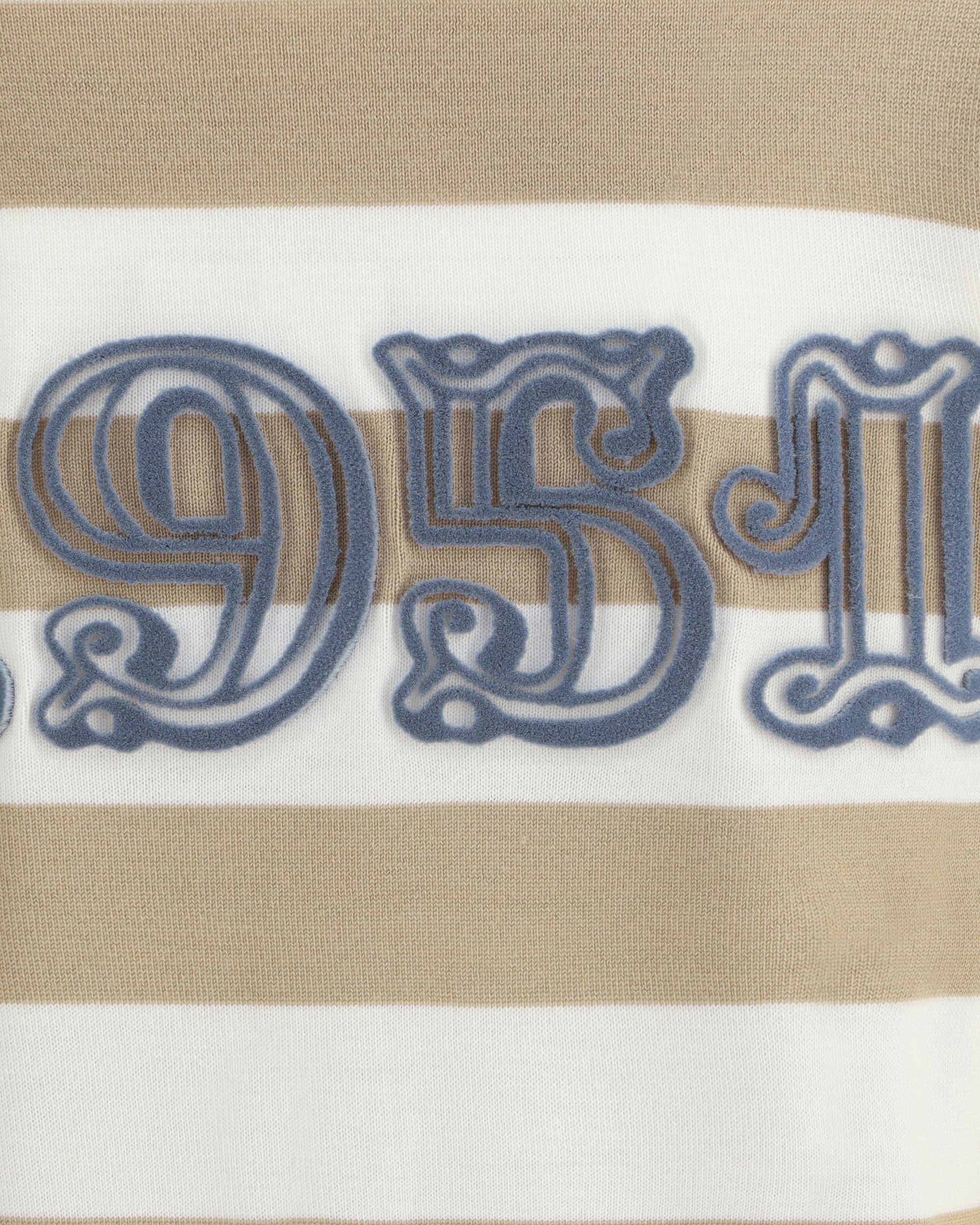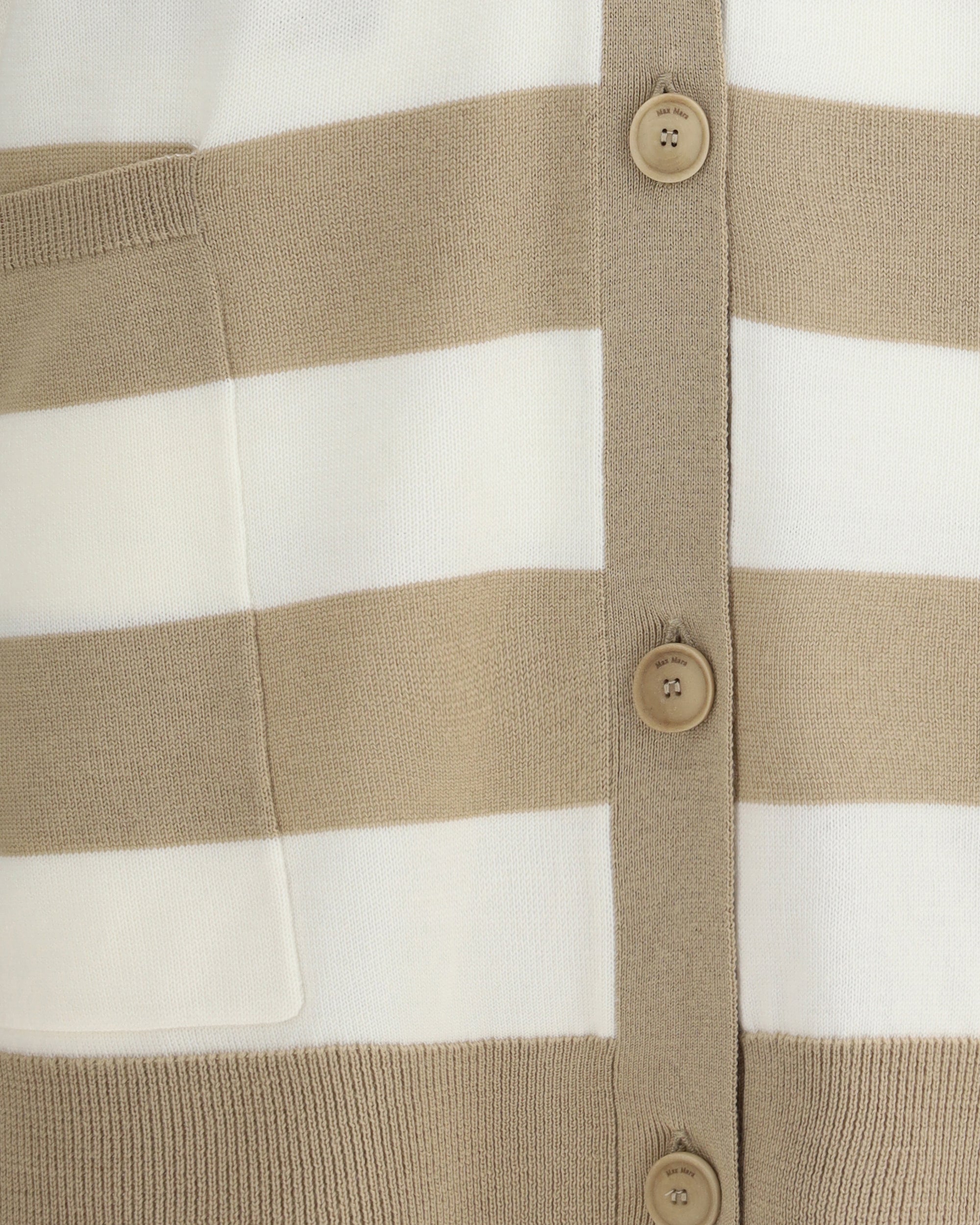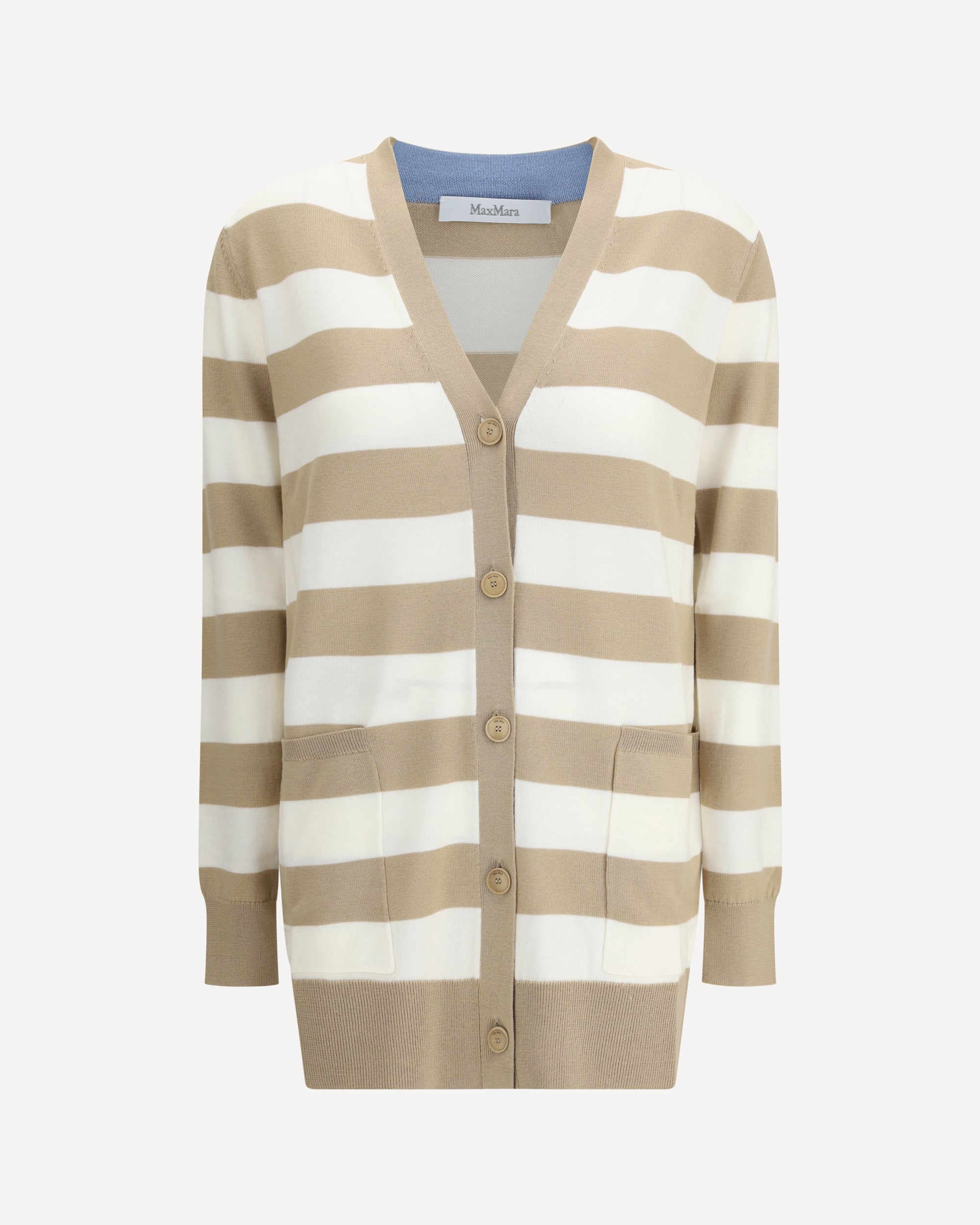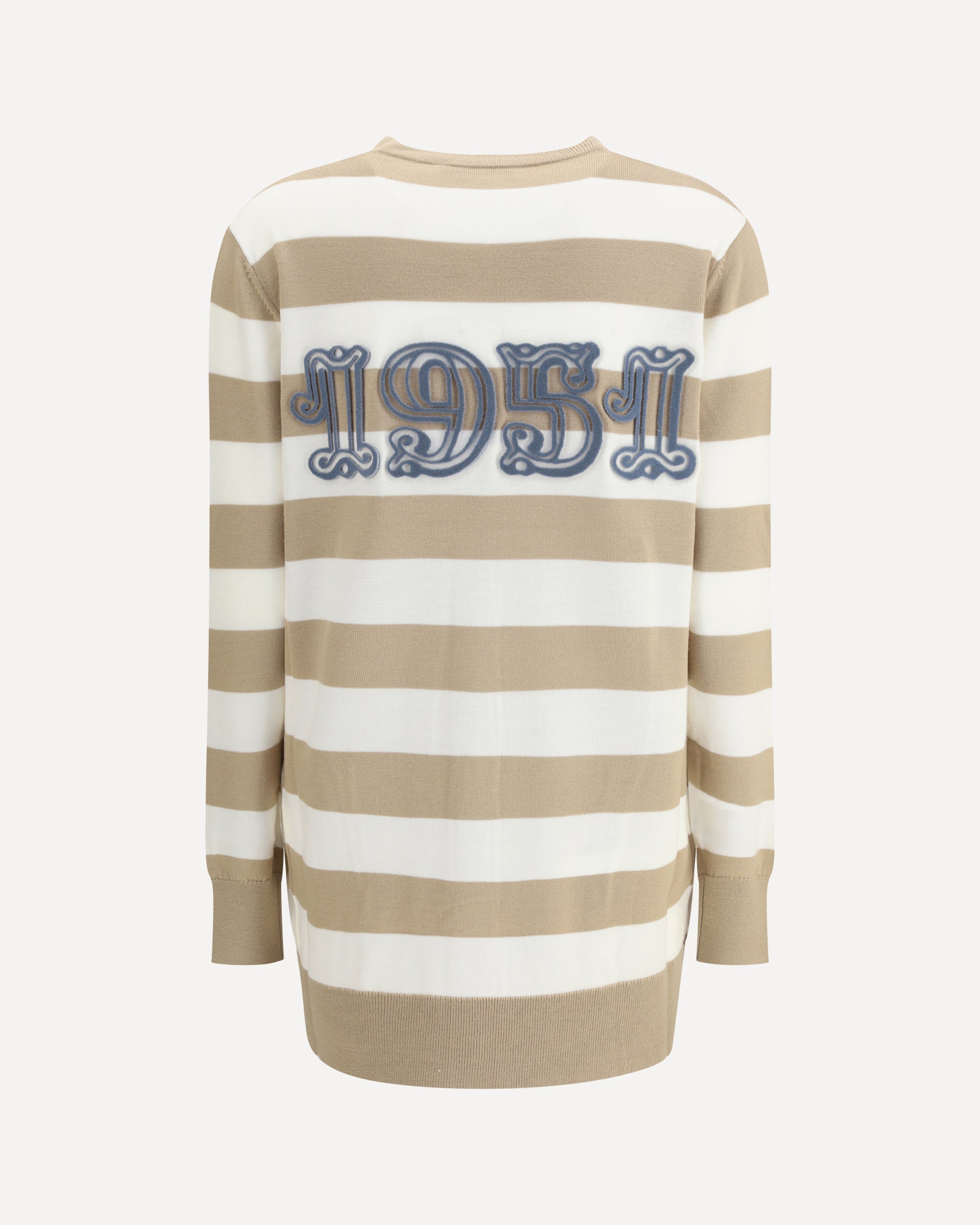 Max Mara's Fiemme Cardigan is made of pure virgin wool yarn and features a striped pattern that lends dynamism and character to the design. With long sleeves, it is enriched on the back by a flocked decoration with the "1951" motif, a tribute to the brand's tradition. A warm and distinctive garment, ideal for a casual yet sophisticated style.