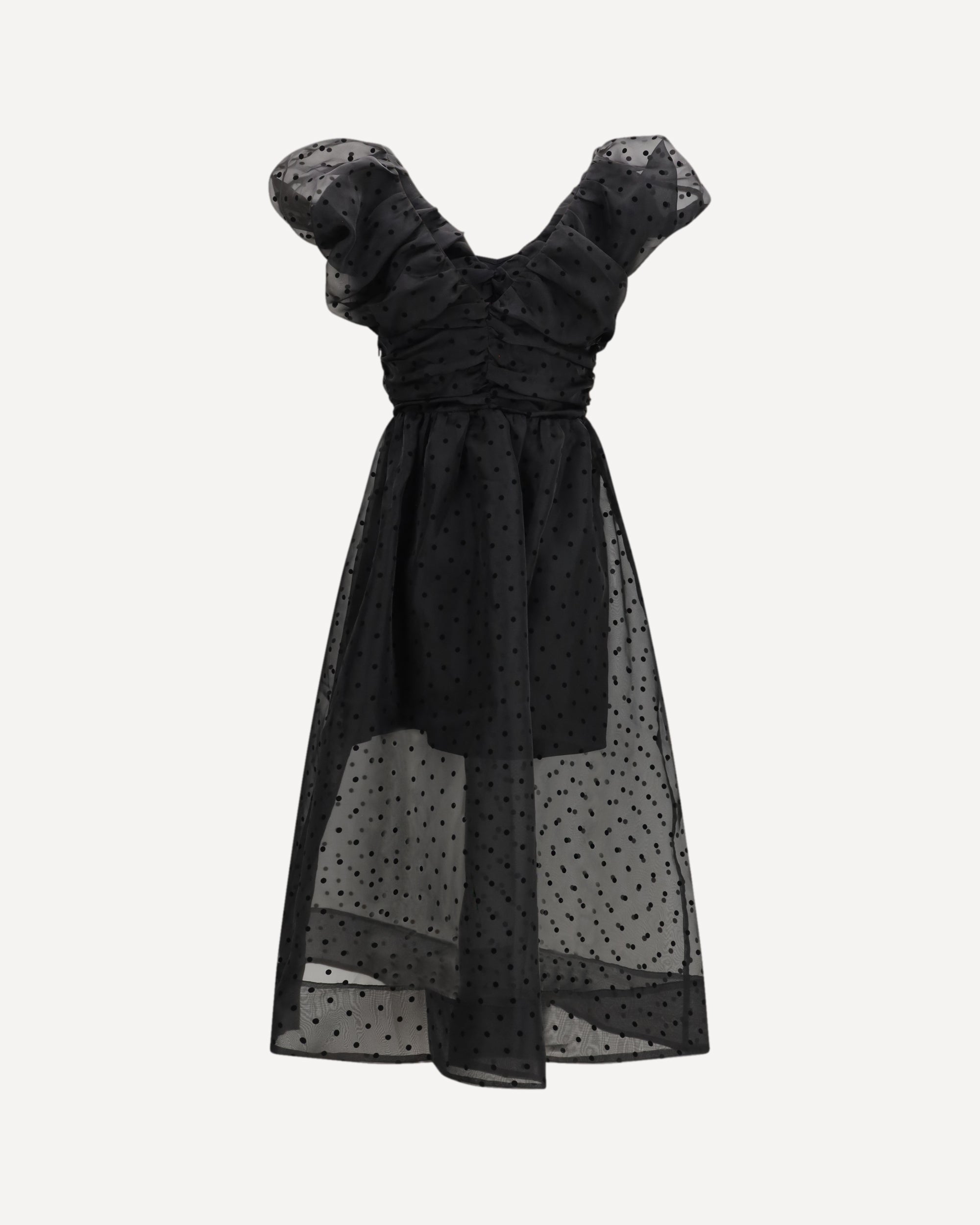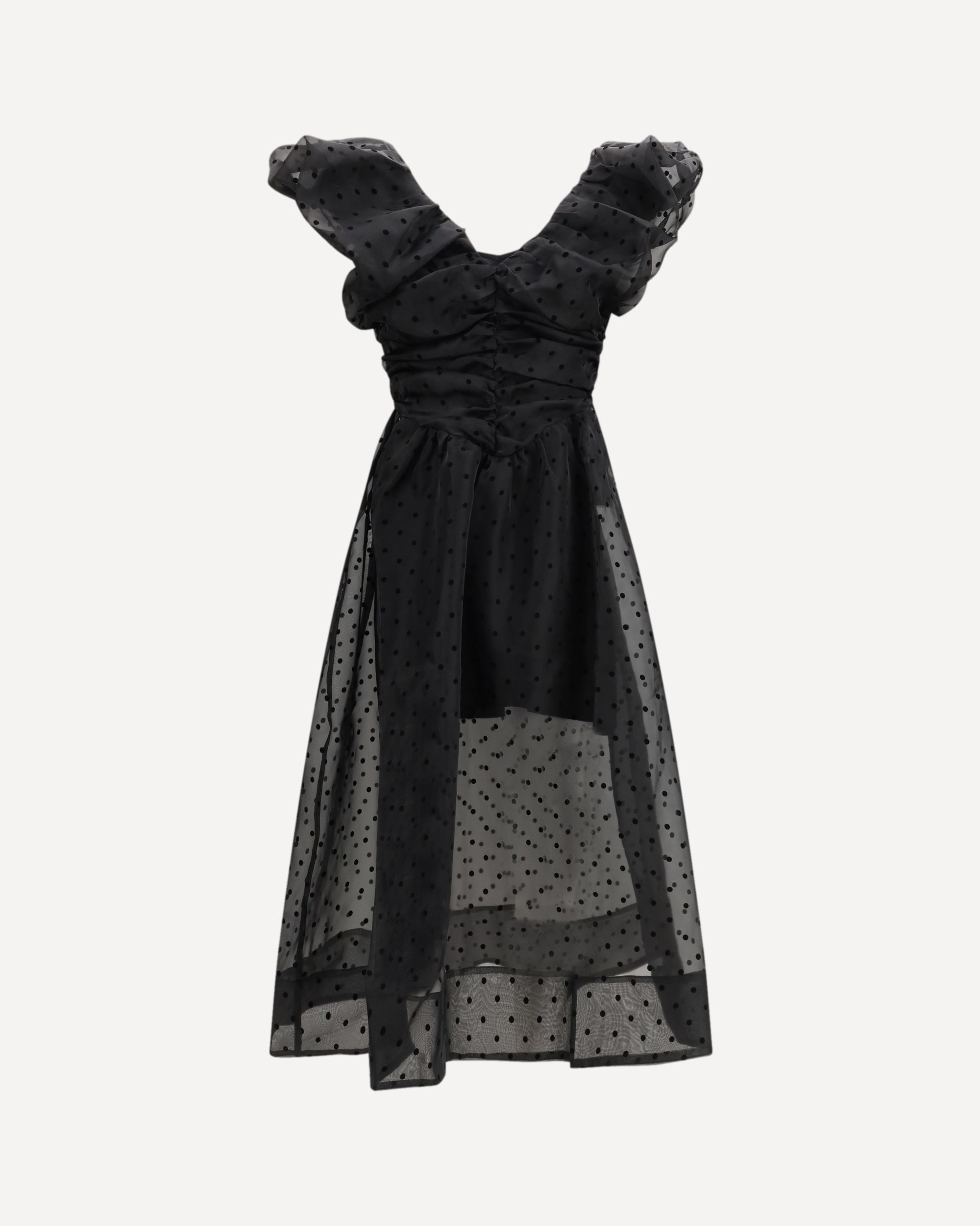 The long organza Dress by Acne Studios is a masterpiece of elegance and femininity, featuring a refined polka dot pattern. The V-neckline adds a sensual yet sophisticated touch, while the puff sleeves give the look a romantic and original feel. The gathered bodice flatters the figure, while the zipper closure ensures a perfect fit. The wide hem detail completes the dress with a touch of dynamism, making it ideal for special occasions where elegance and comfort meet.