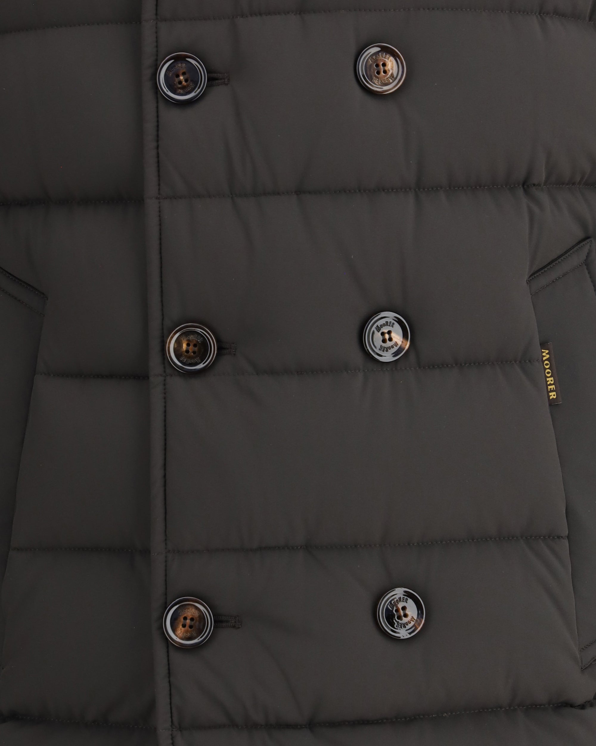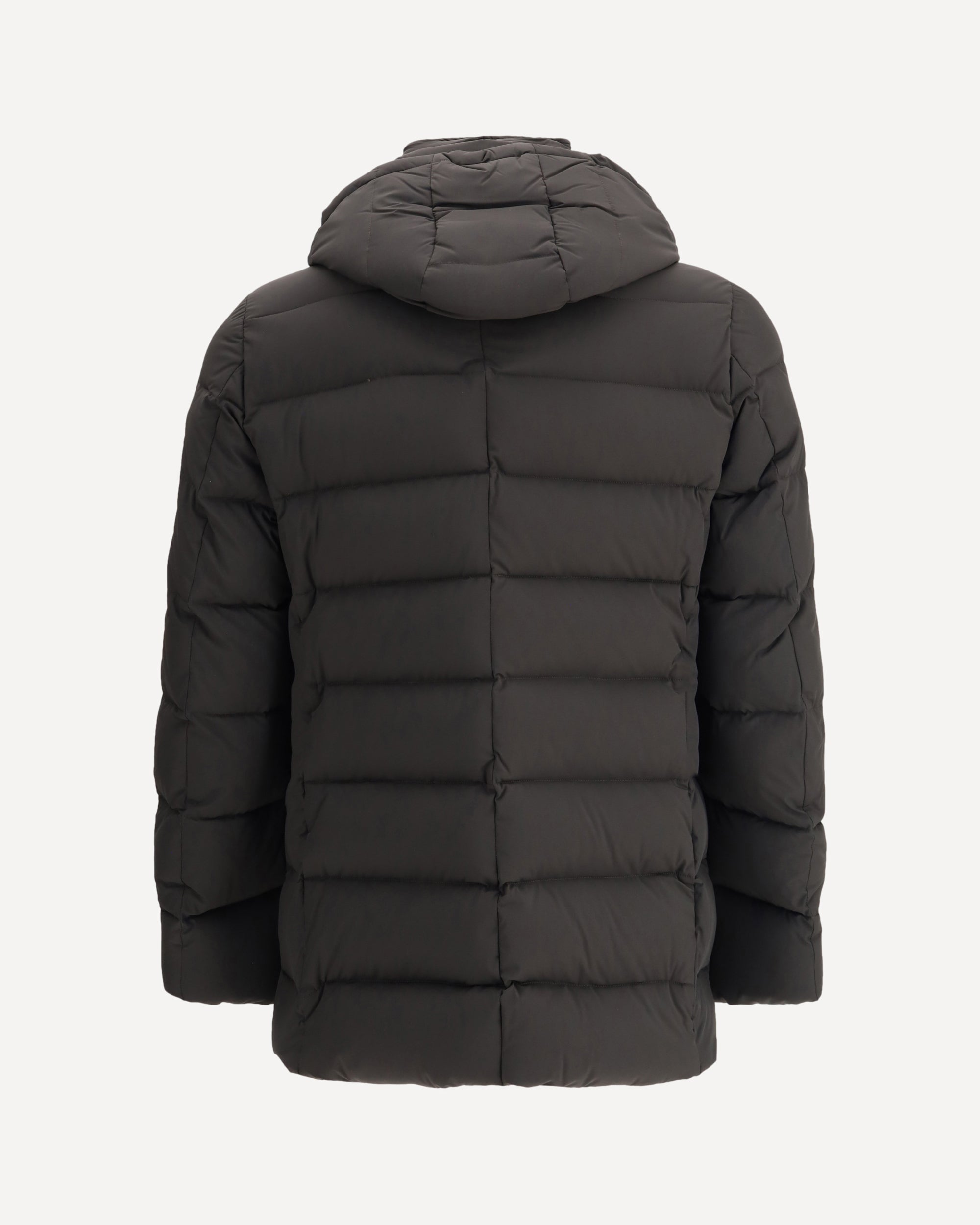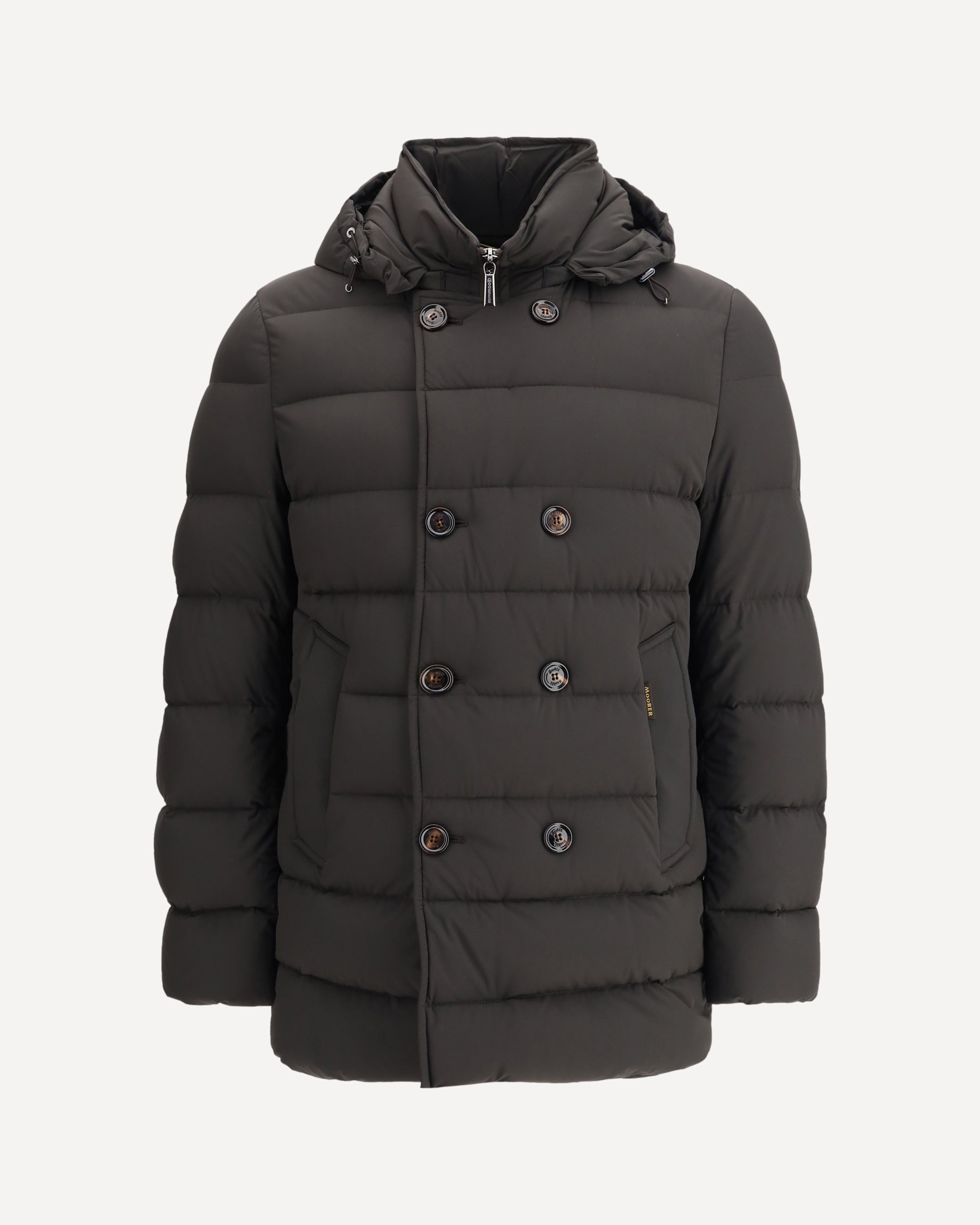 Moorer's Florio Down Jacket is a straight-cut, double-breasted jacket made of water-repellent, compact and durable bi-elastic resin-coated fabric. Filled with goose down and boudin quilted, it offers warmth and lightness. Equipped with a removable hood, double horn button closure and metal zipper, it features side welt pockets and two inside valuables pockets.