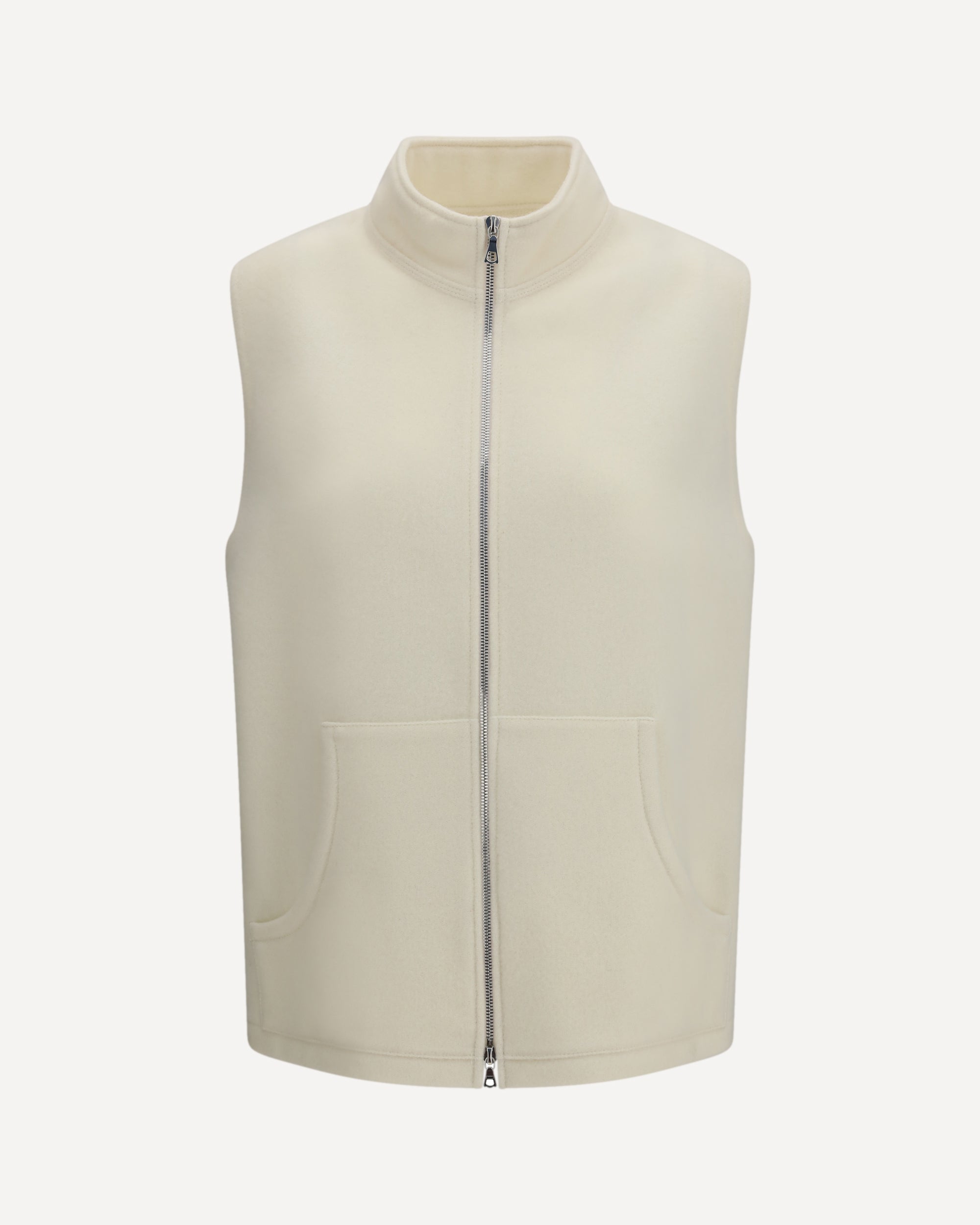 The virgin wool Vest by Rier combines elegance and practicality. Featuring a stand-up collar, zip closure, and two front pockets, it offers warmth and comfort, making it a versatile piece to complete casual or more sophisticated looks.