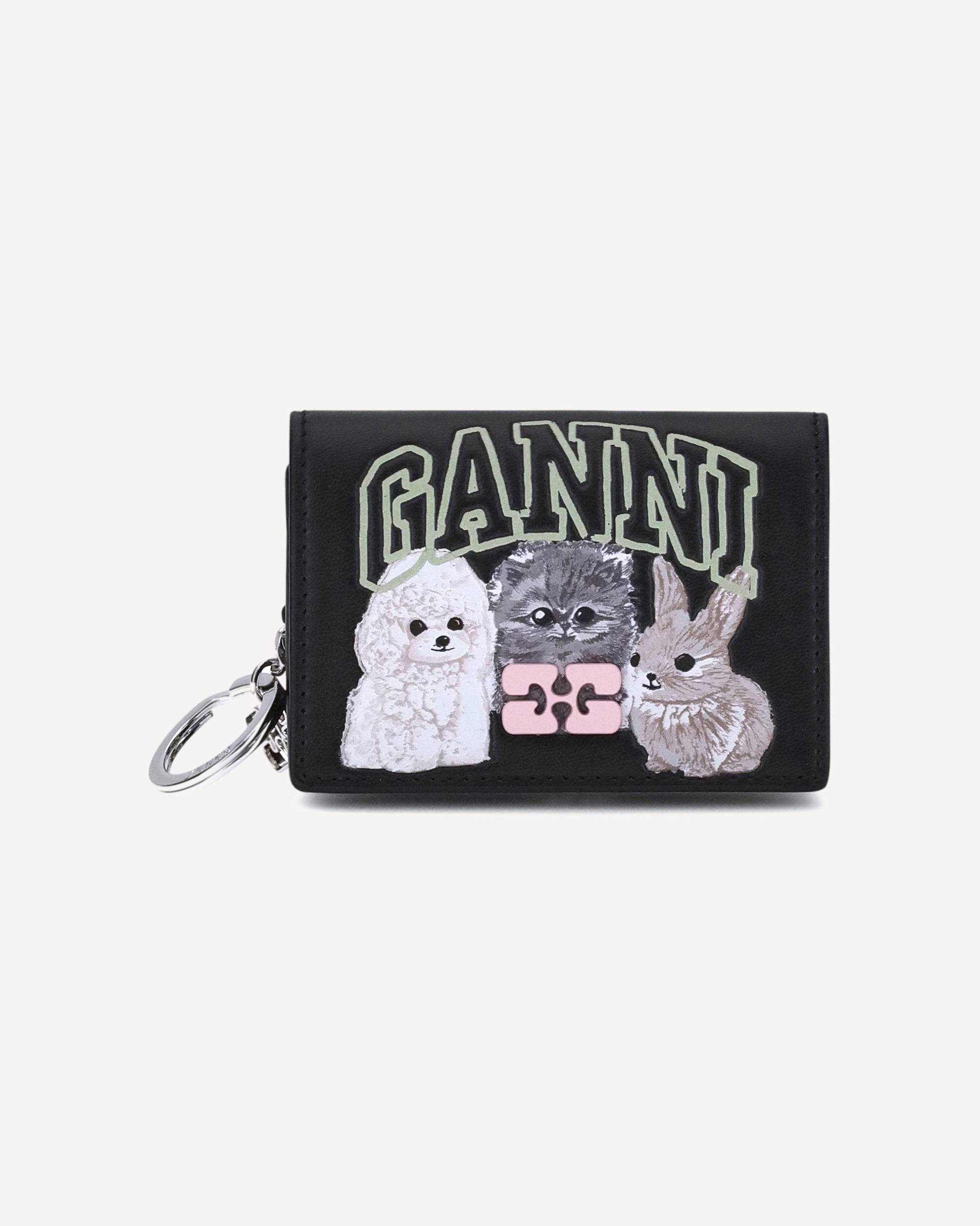 Ganni's Bou Card Holder is a fun and original accessory perfect for adding a touch of personality to everyday life. Made with a vibrant print depicting a dog, cat and rabbit, it combines practicality and playful style. Featuring multiple card compartments, it allows you to better organize your essentials, while the gold-colored key ring adds a functional and decorative detail. Compact and lightweight, it is ideal to carry in your purse or use as a small daytime wallet.