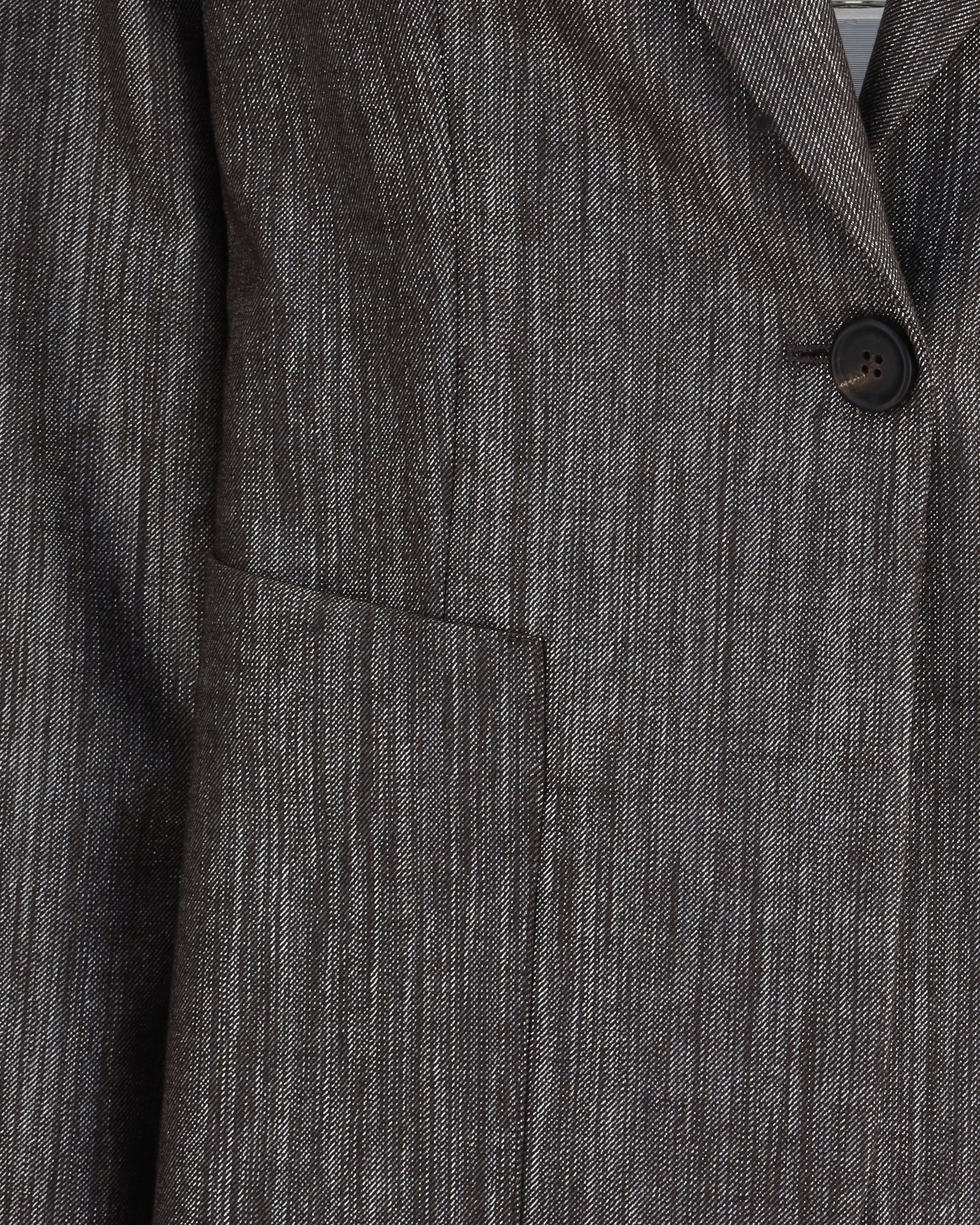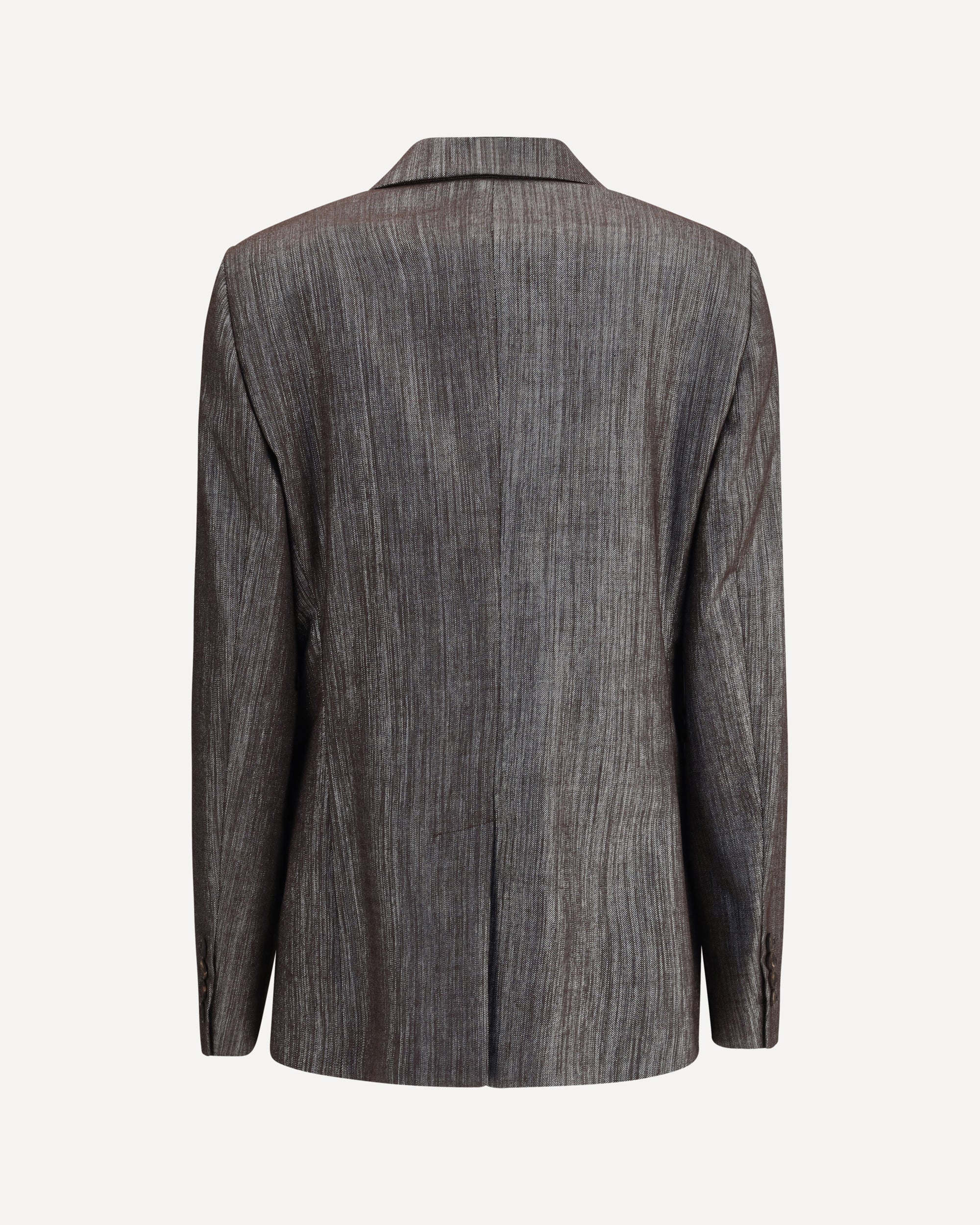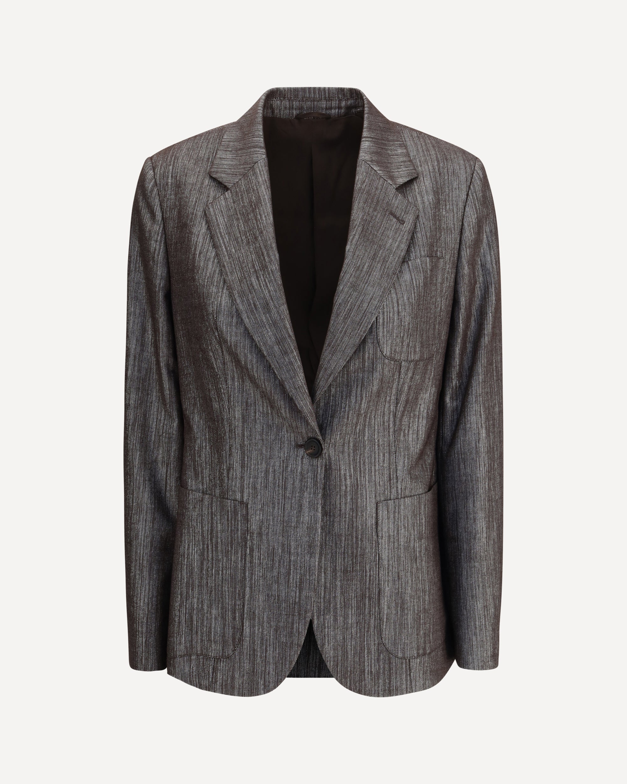 Brunello Cucinelli's Blazer is a refined garment that combines traditional tailoring with a touch of contemporary flare. Made of lurex fabric, it brings discreet and sophisticated shine to the look. It features a button closure, classic lapels, a chest pocket and two patch pockets on the front. The back slit ensures comfort in movement, while the partially lined construction maintains its lightness. Perfect for completing both formal and casual-chic outfits with elegance.