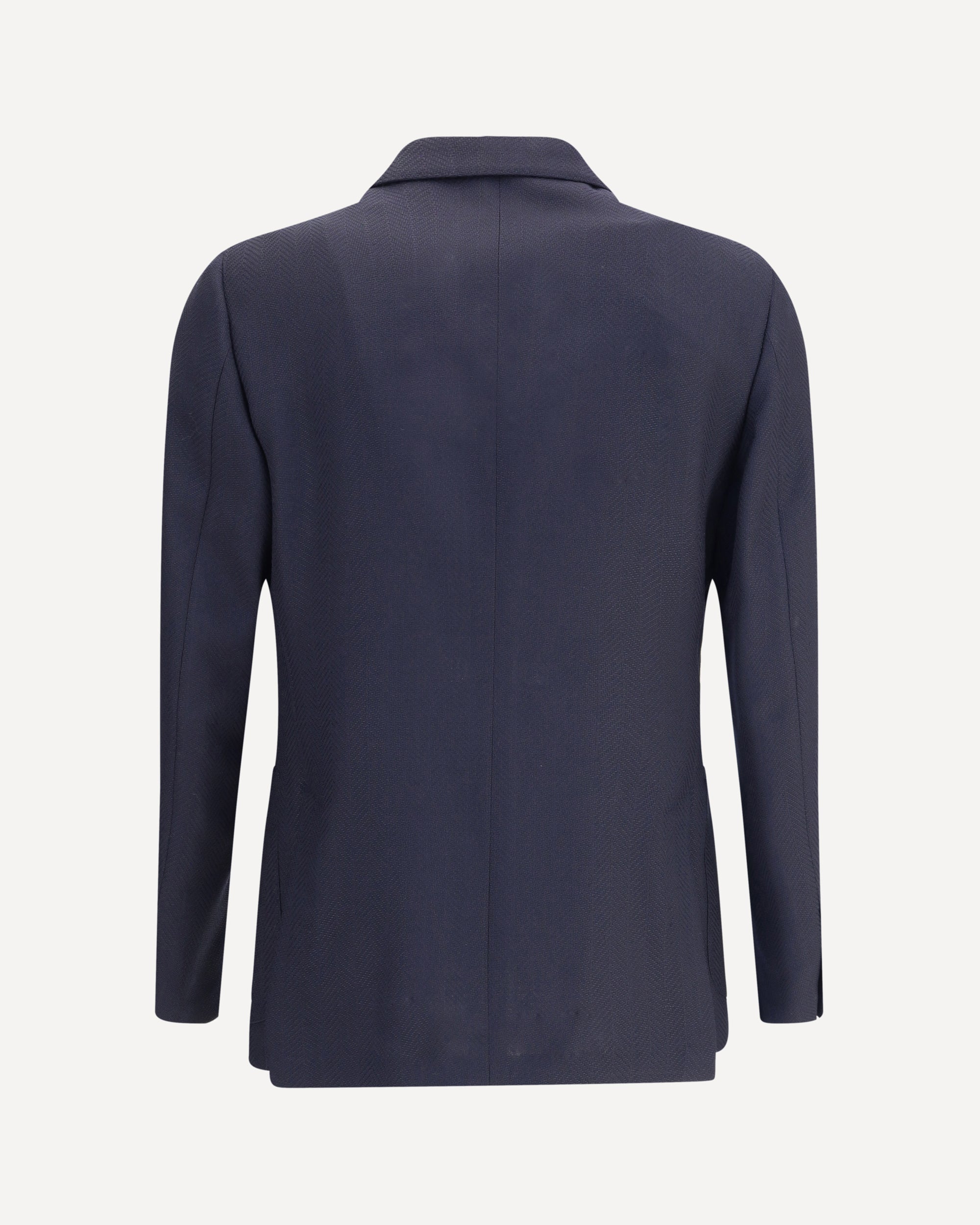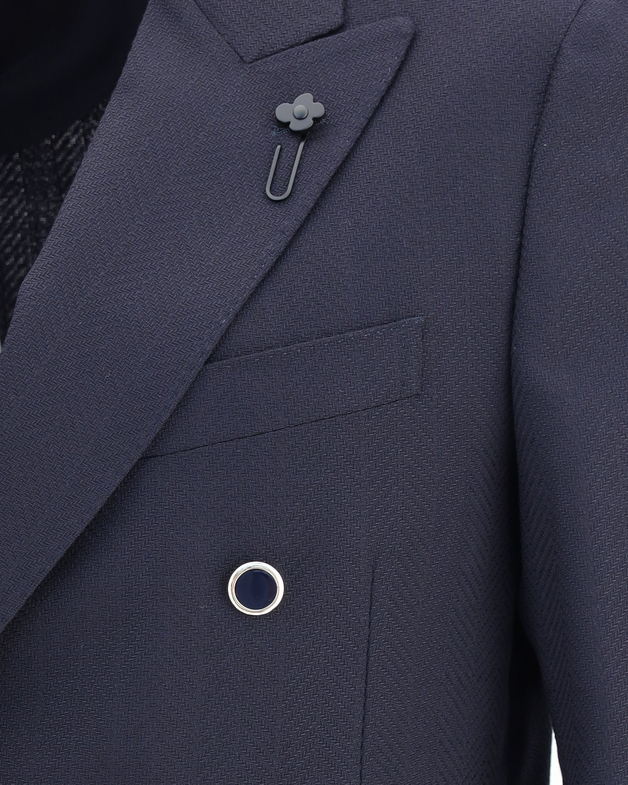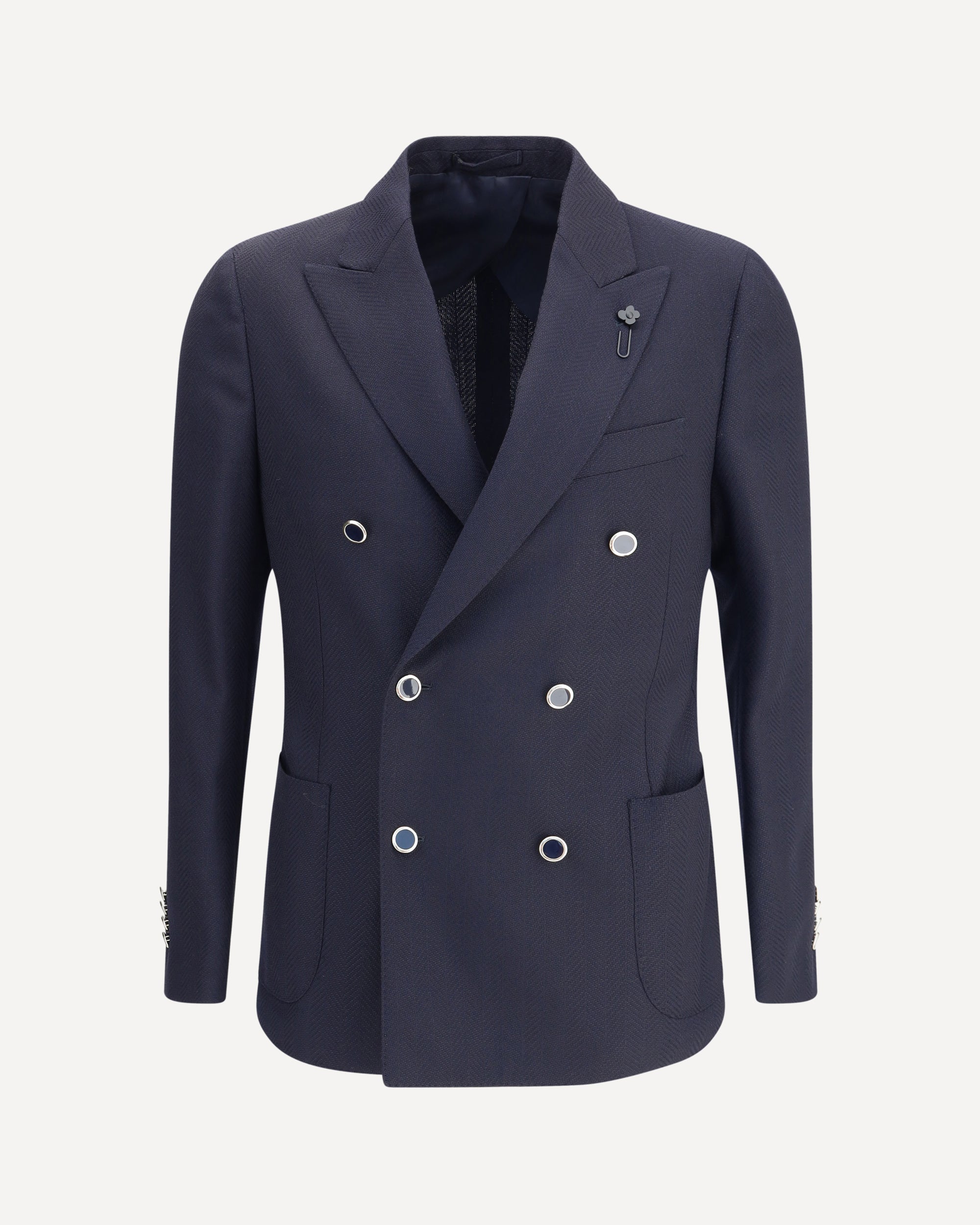 The signature virgin wool double-breasted Blazer by Lardini features six buttons, spear lapels and patch pockets. At the back, two slits ensure freedom of movement. The refined herringbone pattern enhances the brand's distinctive elegance. The straight, structured silhouette is paired with a classic shoulder, creating a bold, contemporary look. Completing the design is the brand's iconic pin on the lapel.