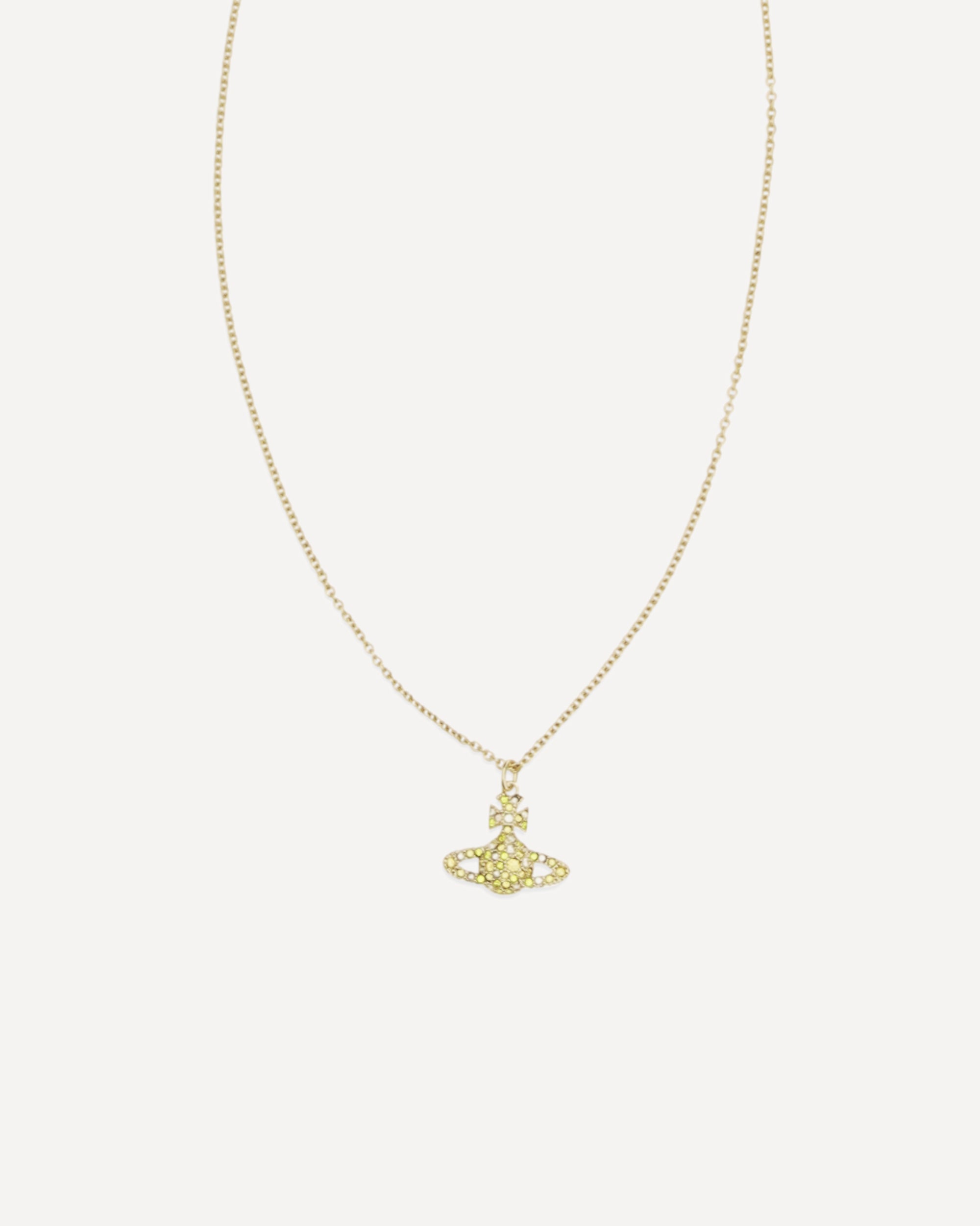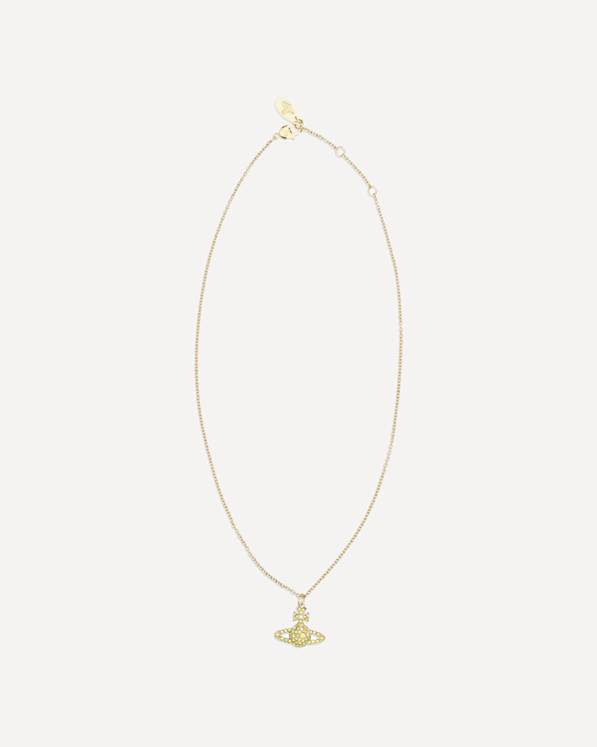 The Grace Bas Relief Necklace by Vivienne Westwood features gold plating and a polished finish, with a slim, extendable chain for a versatile fit. The orb-shaped pendant, enriched with colorful crystals, adds a dazzling touch, while the lobster clasp and engraved tag complete the design with refined, distinctive details.