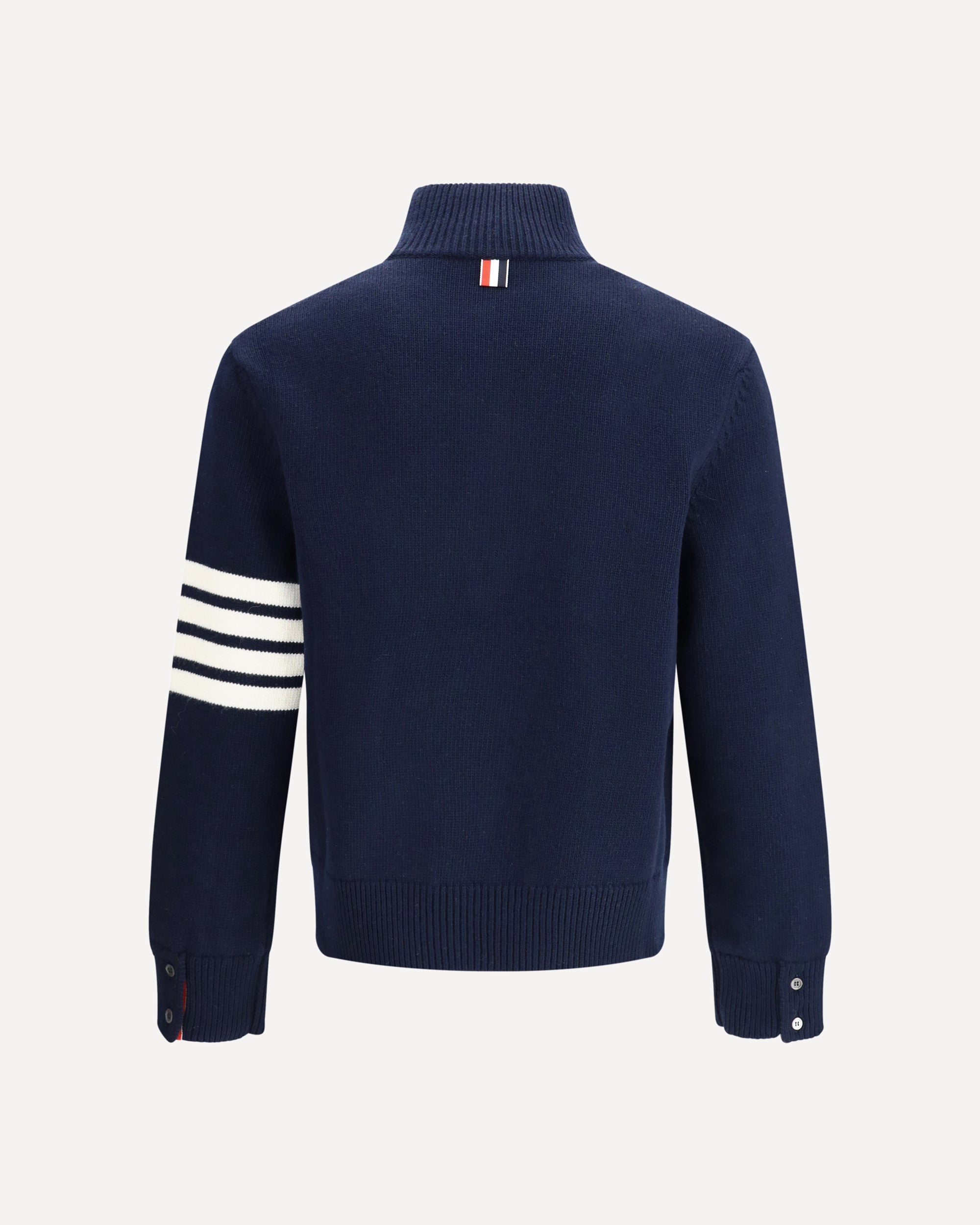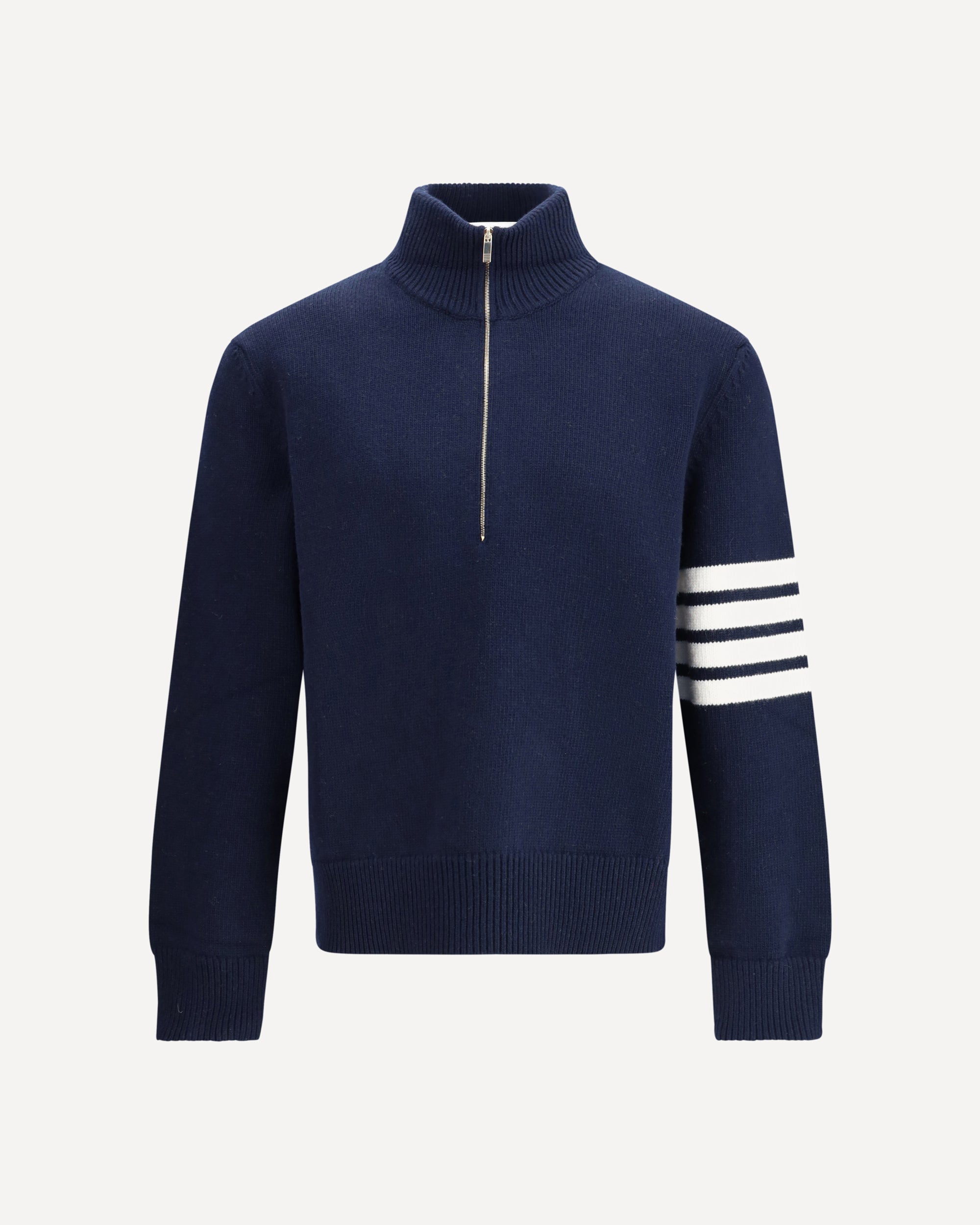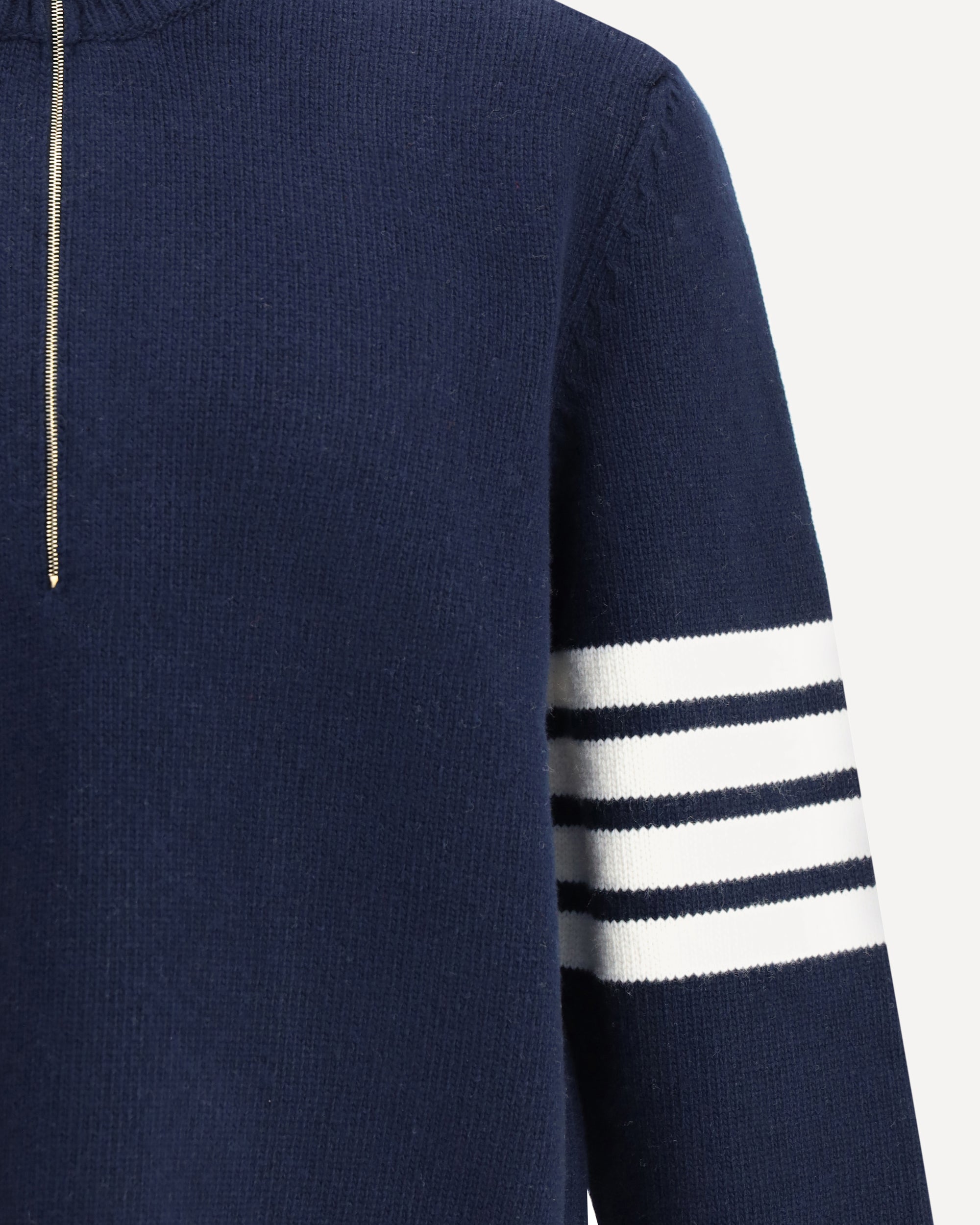 The Sweater by Thom Browne features a contrasting 4-Bar intarsia, combining elegance with a contemporary edge. Designed with refined detailing, it includes a half-zip collar that adds a sporty and versatile touch. A distinctive piece blending comfort with the brand’s signature sophistication.