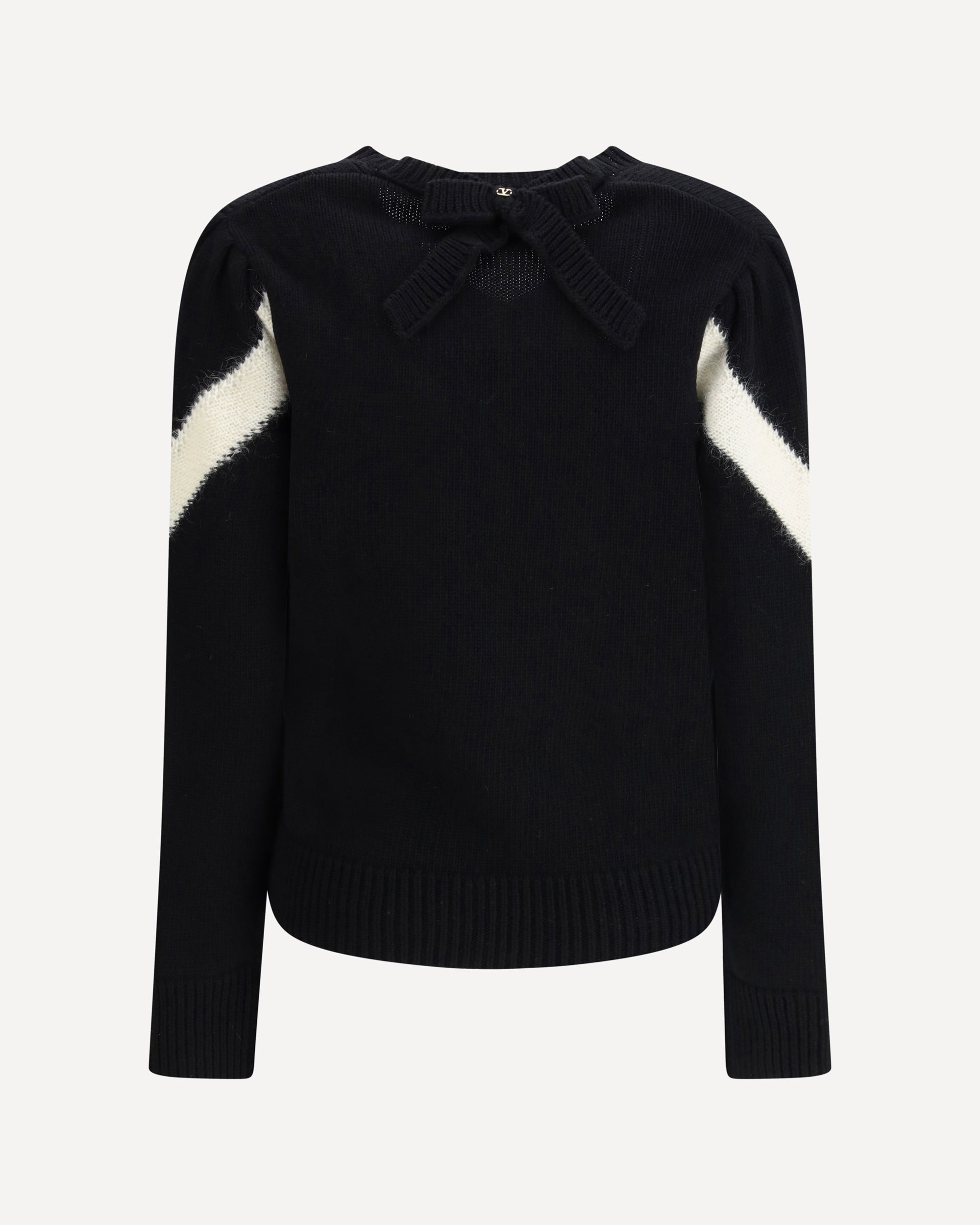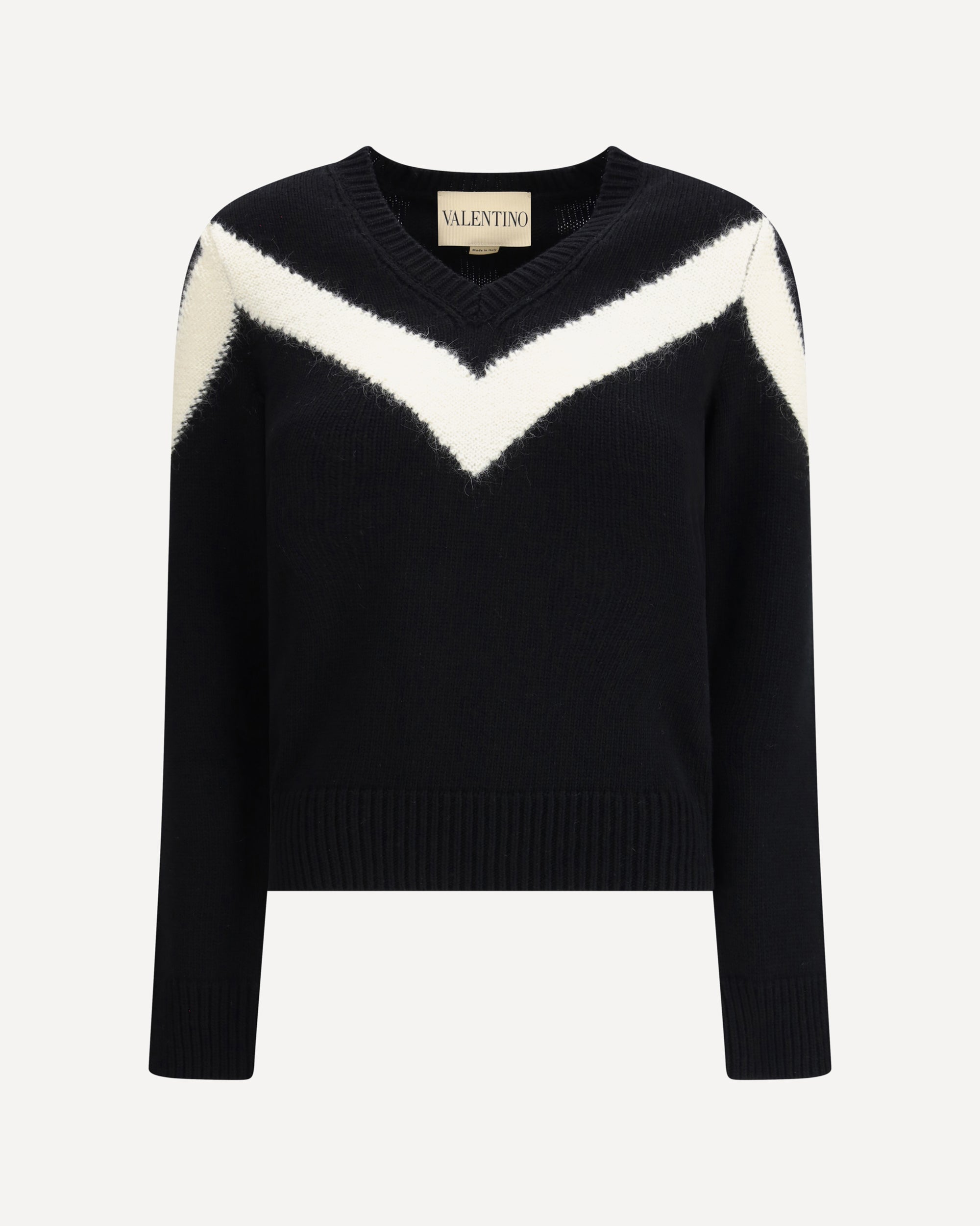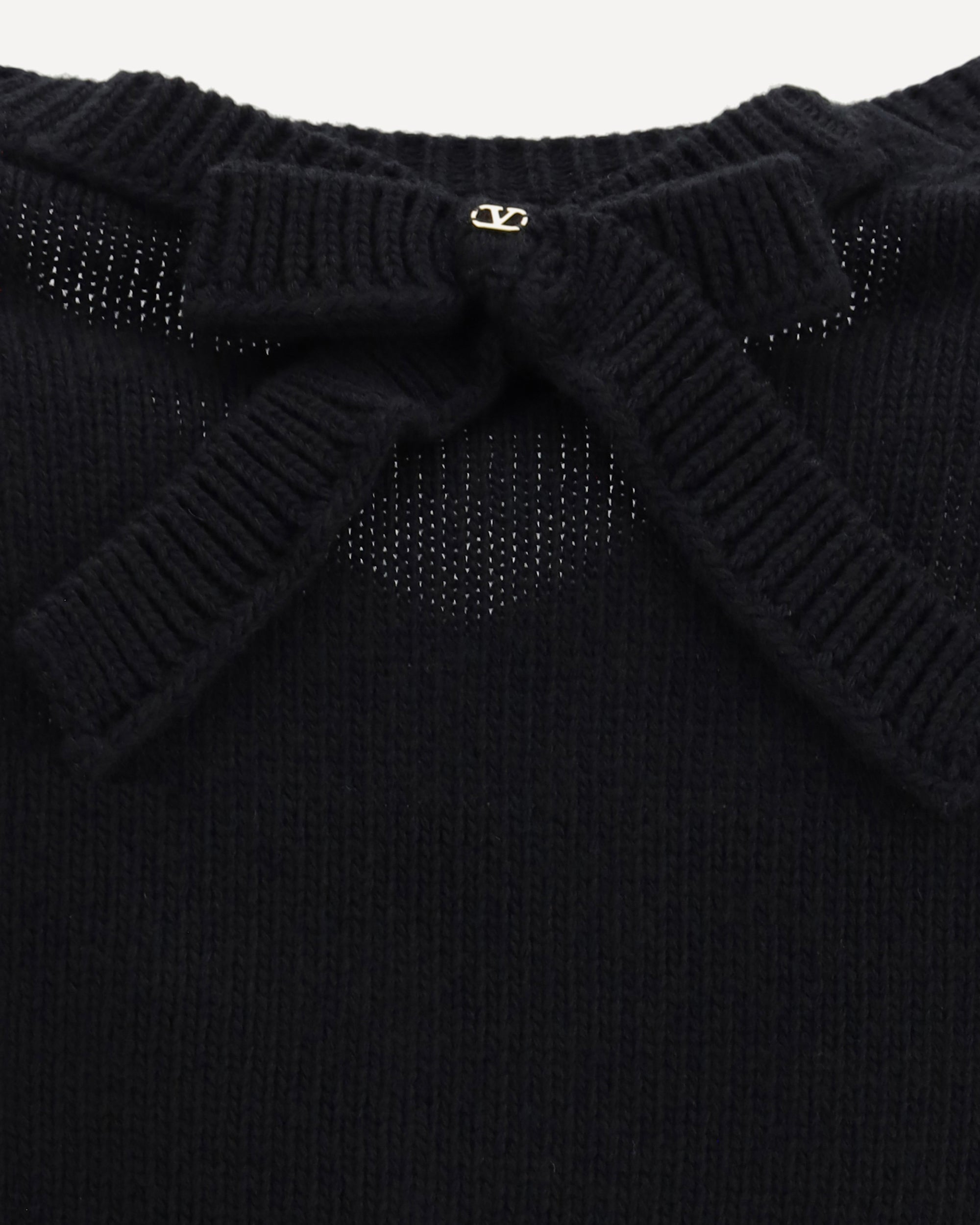 The Valentino Garavani Wool Sweater combines essential lines with couture-inspired details. Featuring a refined V-neckline, the design is elevated by a statement bow at the back, adding a feminine touch to the silhouette. Finished with cuffed sleeves and a metallic V Logo detail, this sweater blends minimal elegance with iconic sophistication.