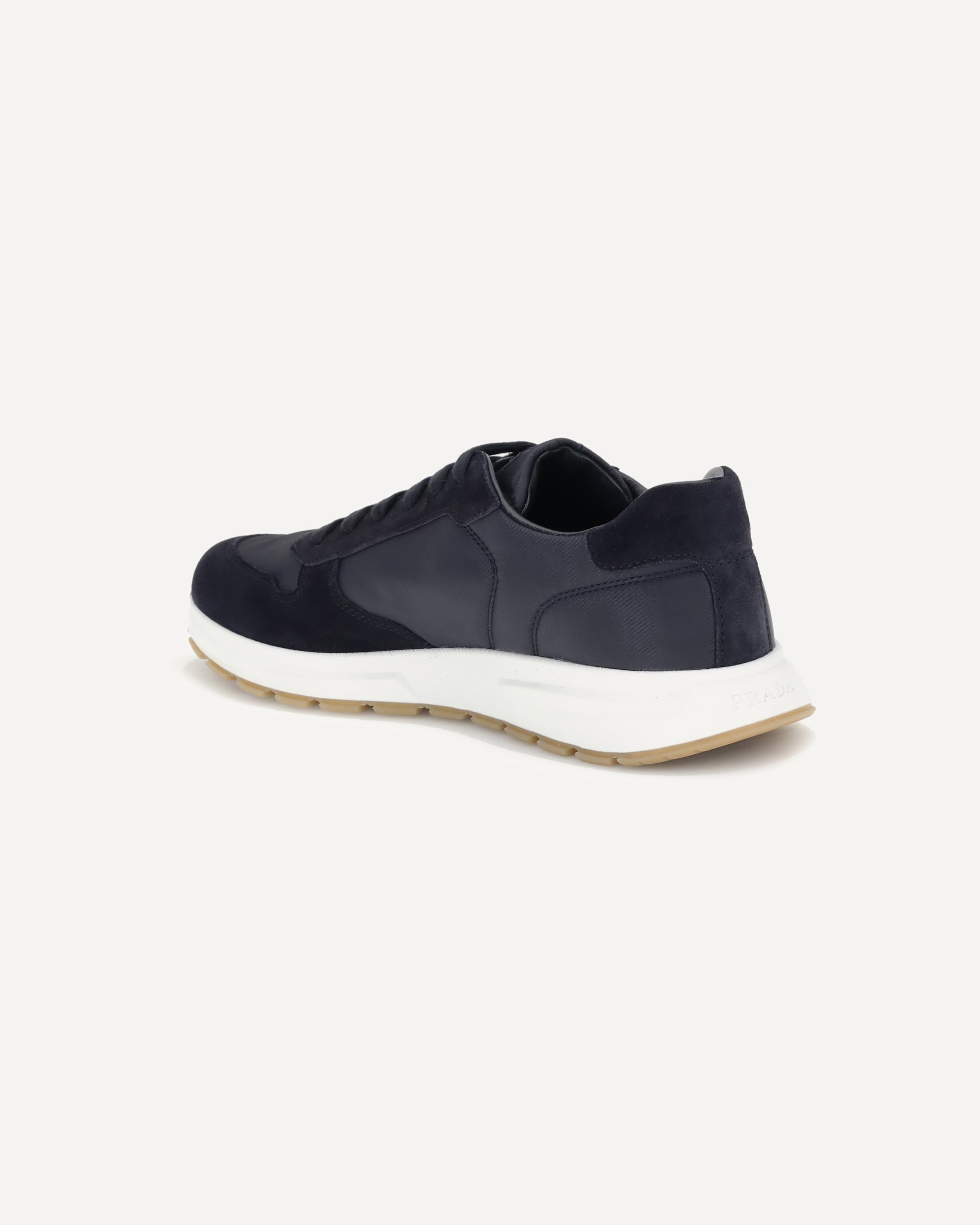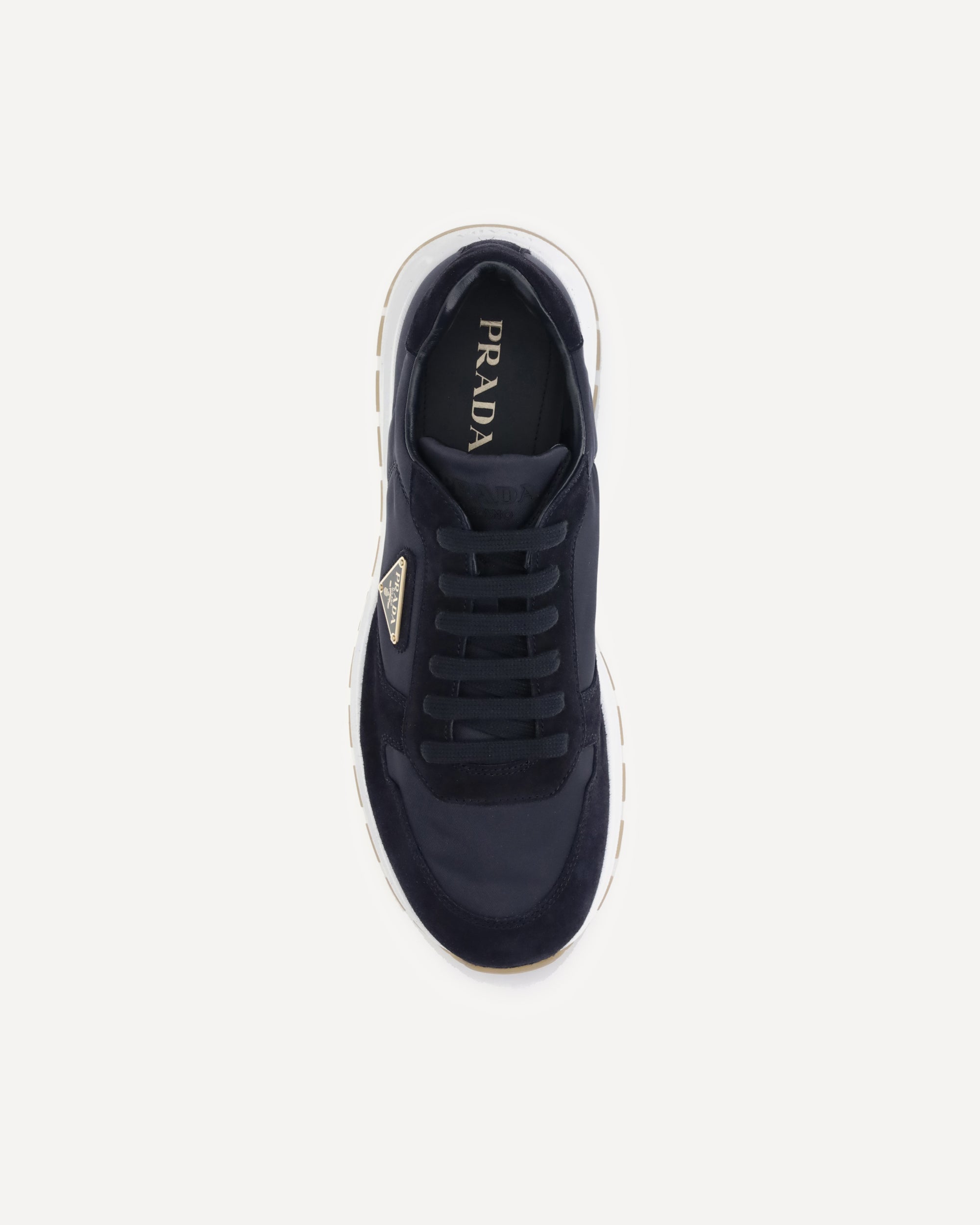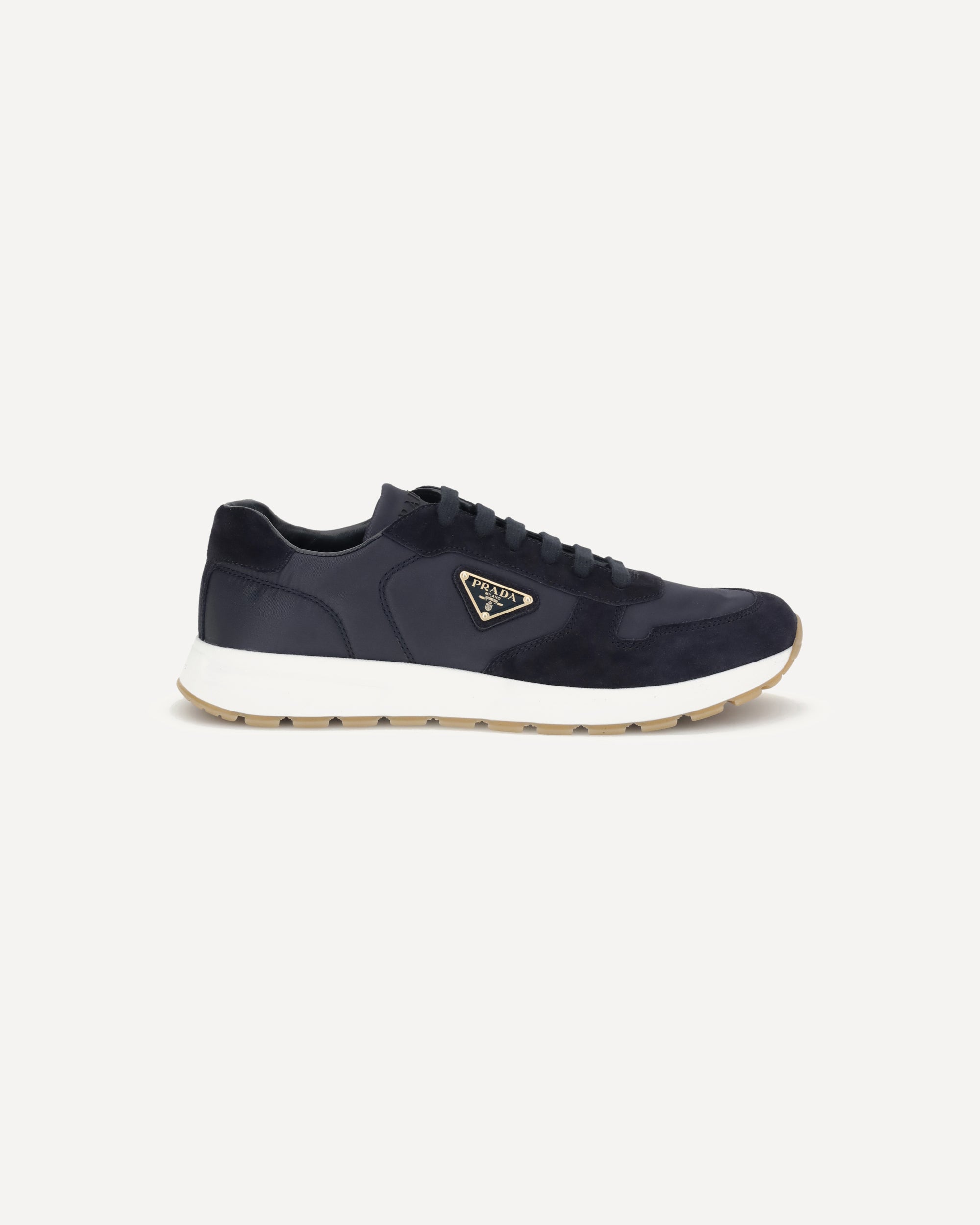 Prax 01 re-nylon Sneakers by Prada blend contemporary aesthetics and innovative materials. The upper with nylon lace loops lends a technical, modern look, enhanced by the enameled metal triangle logo and screen-printed lettering on the tongue. The lightweight foam sole with toothed tread provides comfort and grip, while the removable leather-covered footbed ensures a comfortable fit with refined details.