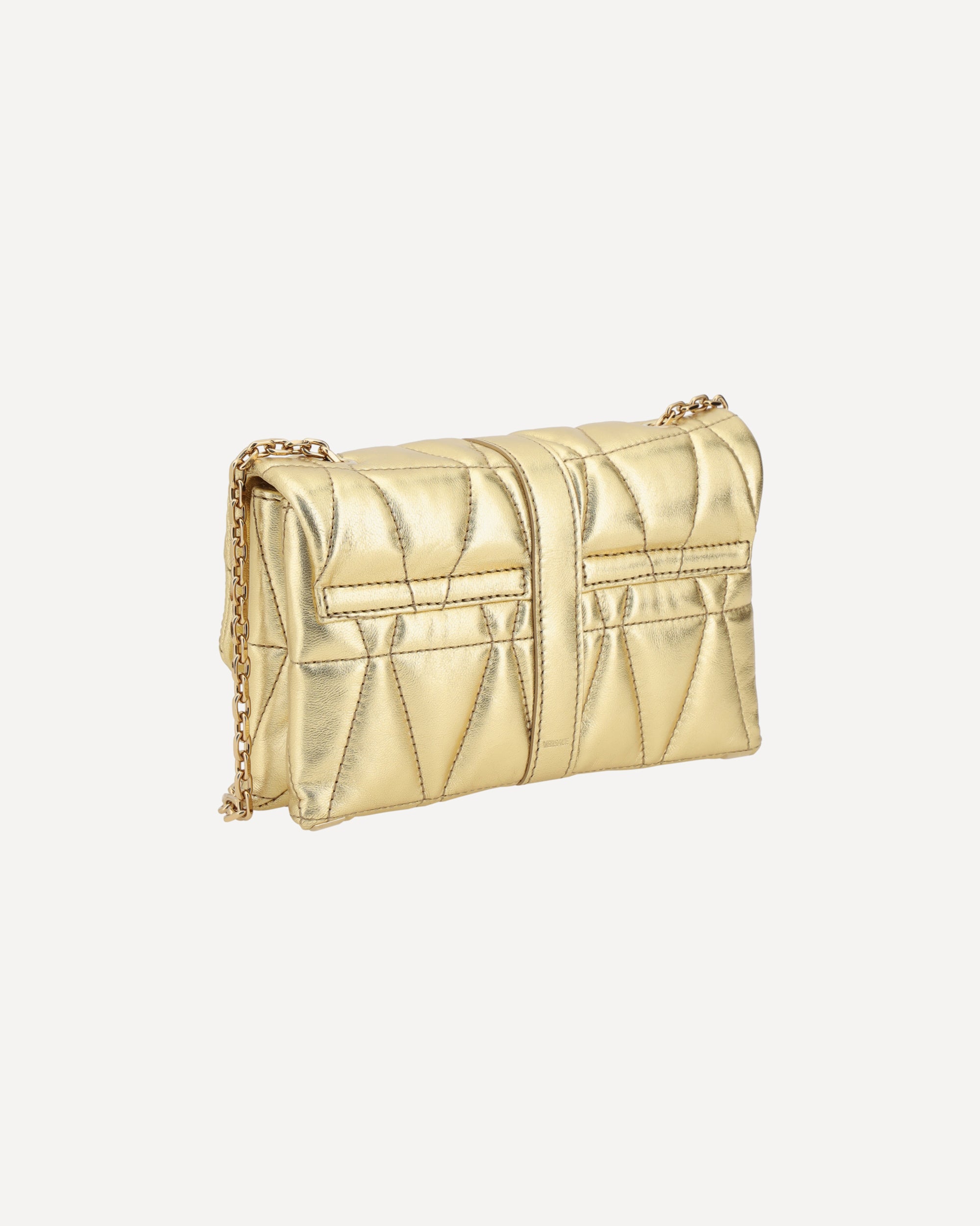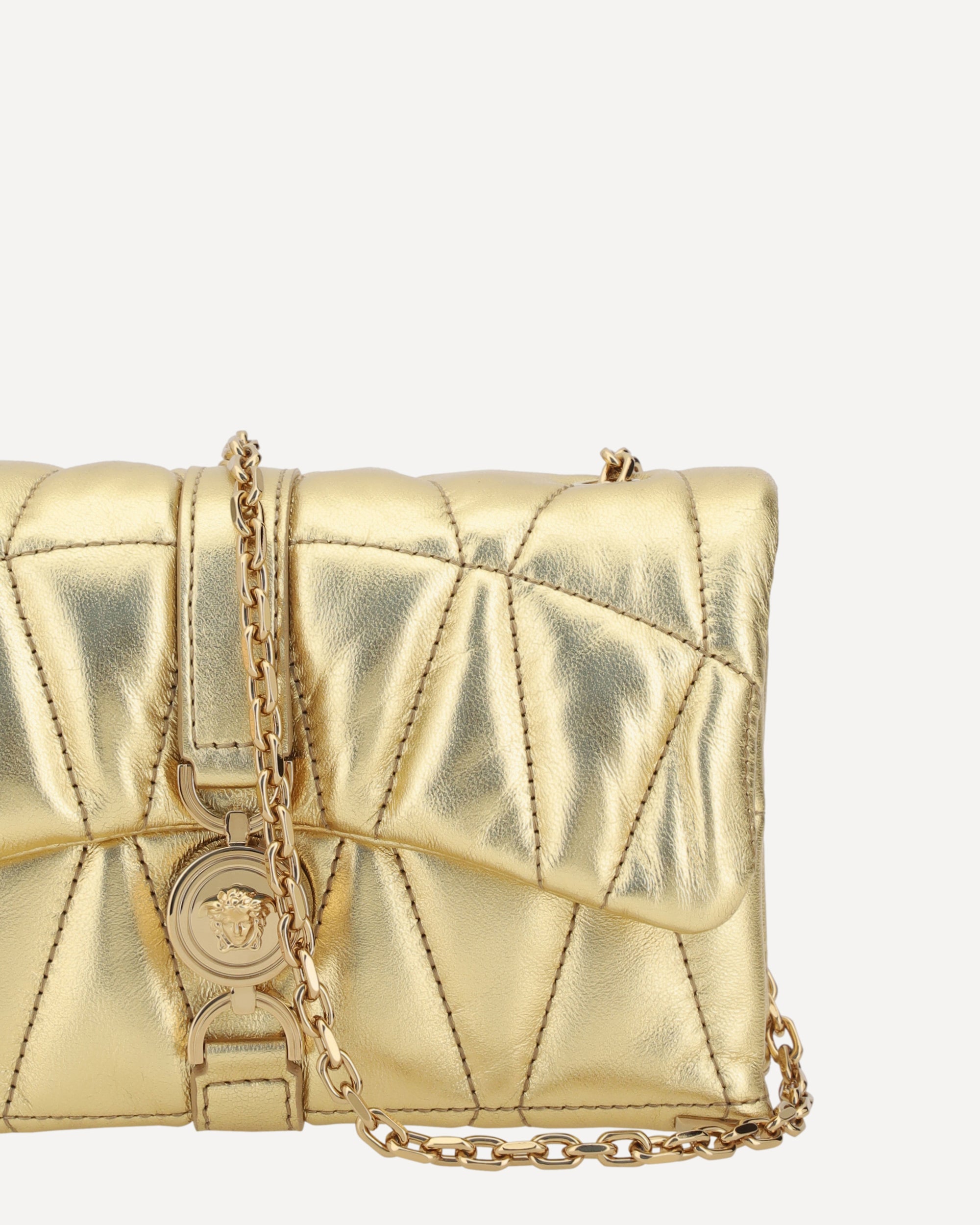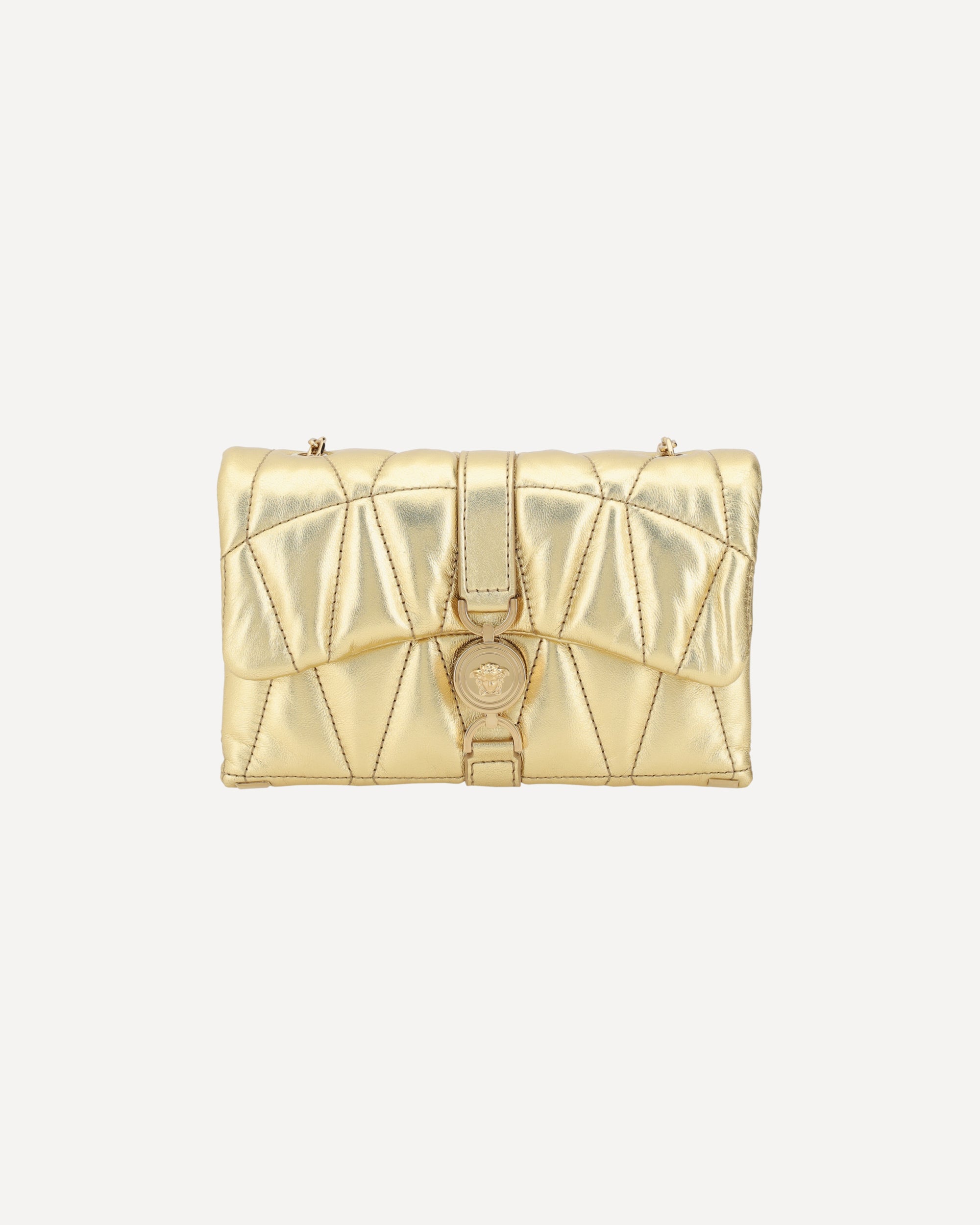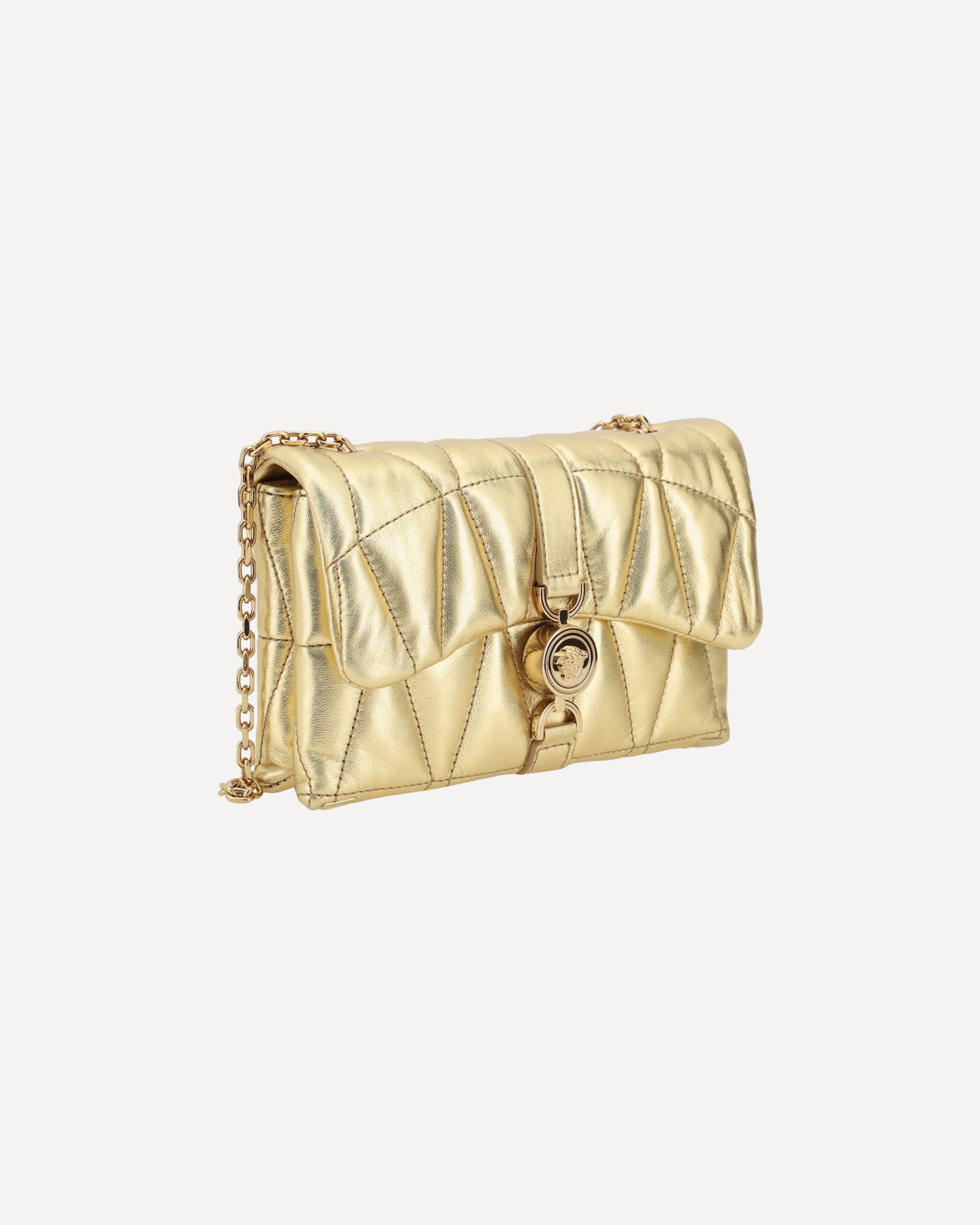 The Kleio mini Shoulder Bag is made of lambskin leather, with a quilted design that adds a touch of elegance. It features a front closure with a magnetic flap, decorated with the brand's iconic Medusa head. The chain shoulder strap is removable, offering the possibility of wearing it in different ways. Inside, the bag is divided into two compartments, ideal for organizing personal items. A perfect blend of luxury, functionality and distinctive design.