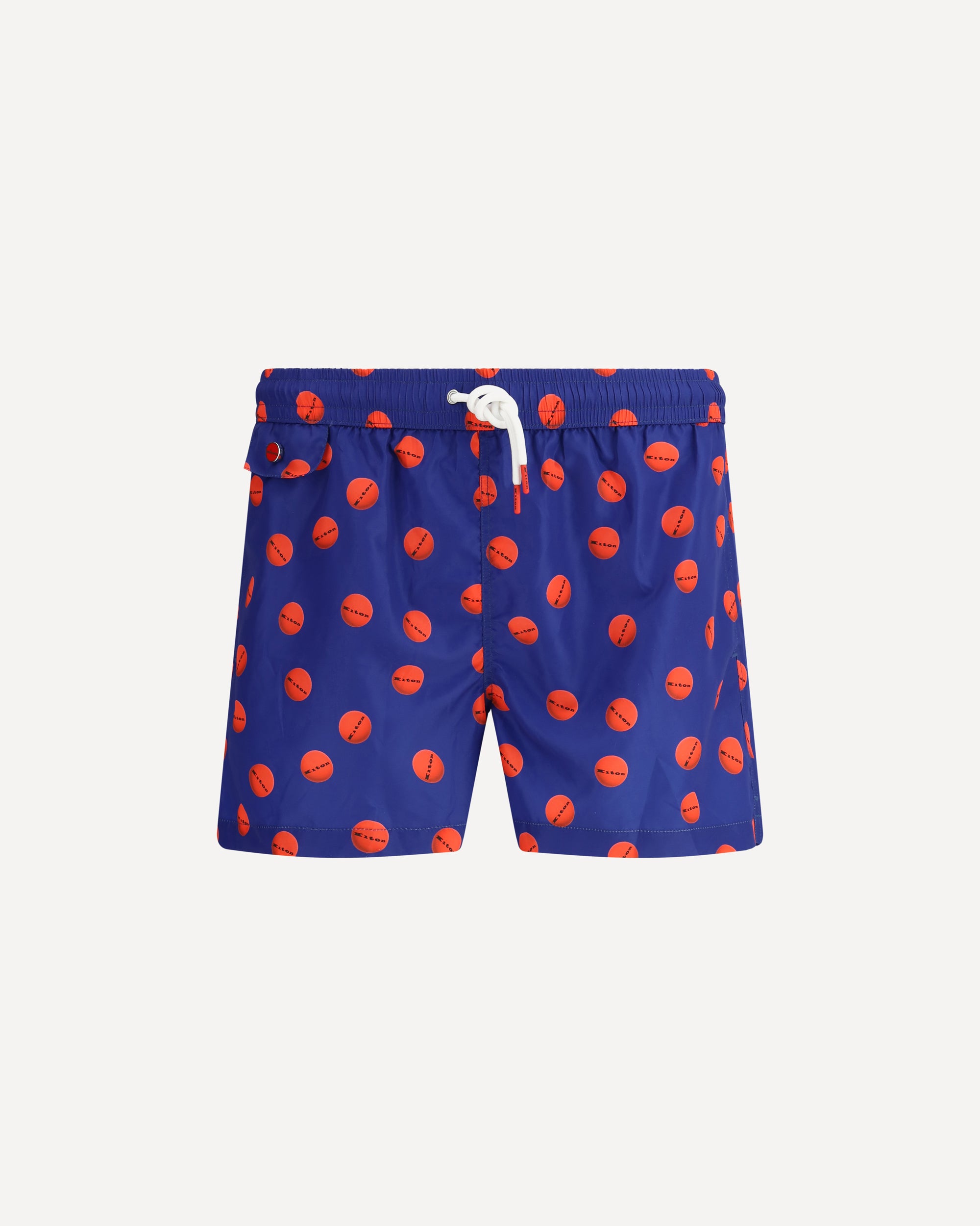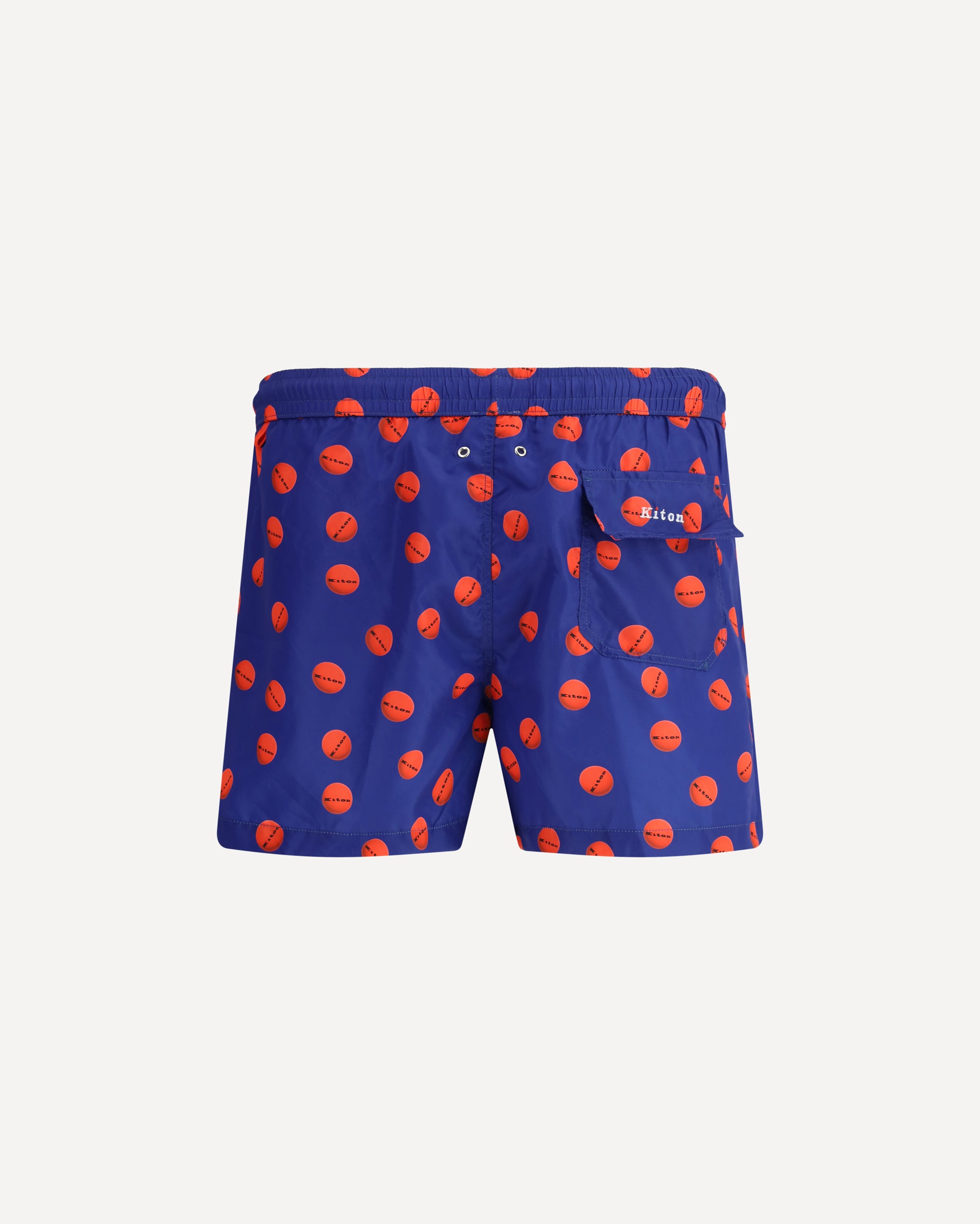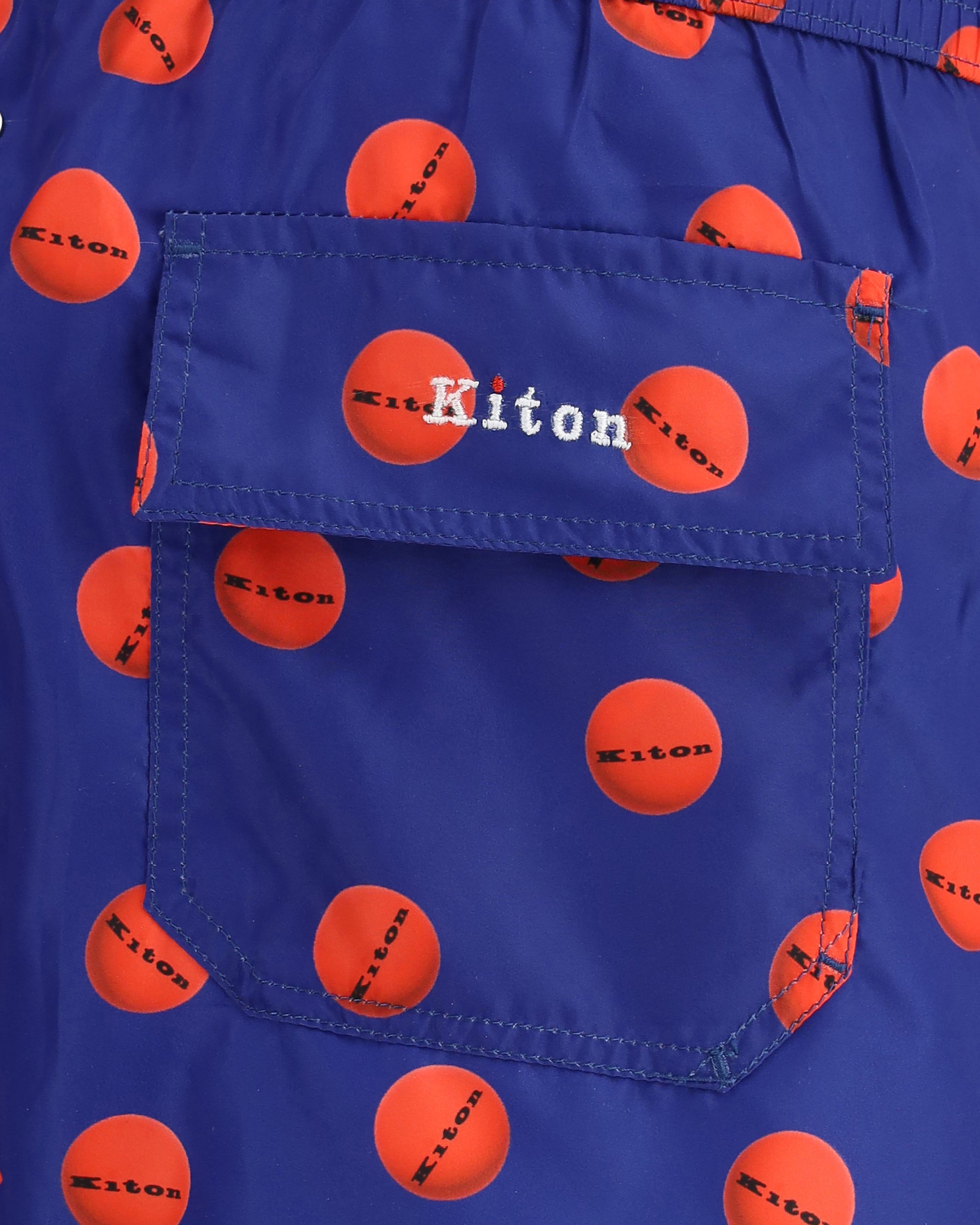 Kiton's Swimshorts is an elegant and refined garment that combines style and practicality. The adjustable elastic waistband with drawstring allows for a customized fit, while side welt pockets provide space for small items. The back flap patch pocket and front flap pocket add a touch of functionality and design while maintaining a clean, sophisticated aesthetic. Contrasting all-over logoed spheres make the suit distinctive and instantly recognizable, lending a touch of luxury to even a casual garment.