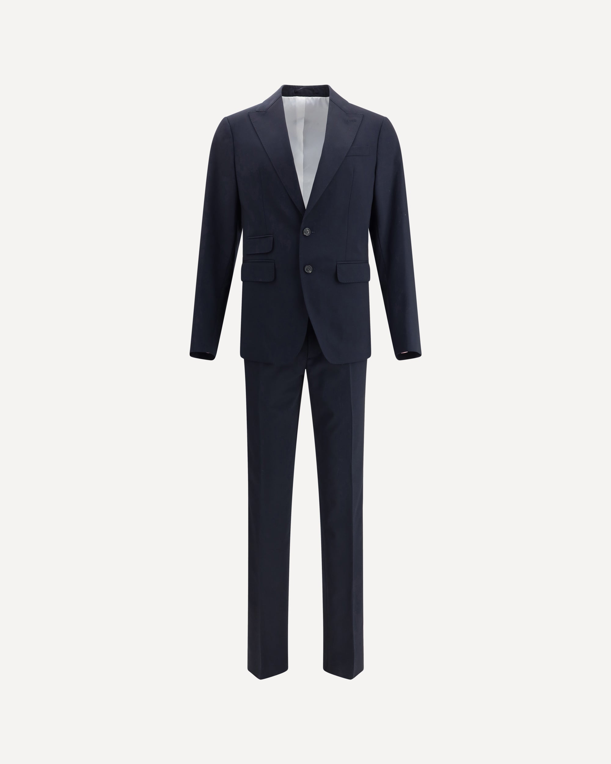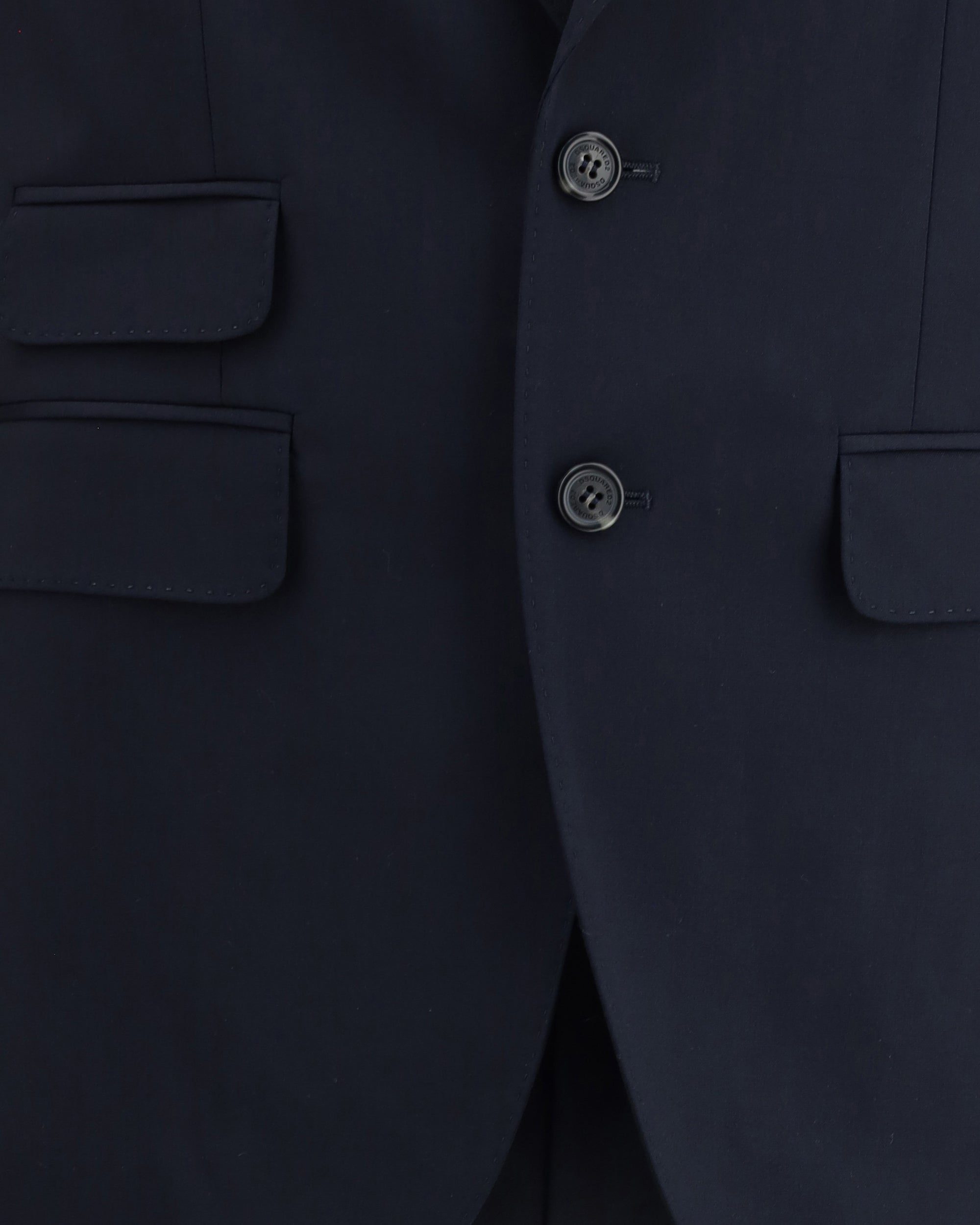 Dsquared2 Virgin Wool London Suit, consisting of jacket and pants. Wool blazer jacket, front button closure, three welt pockets on the front with flap, one slit pocket on the front, peaked lapels. Classic wool pants, front zipper and button closure, two welt pockets on the side, two welt pockets on the back.