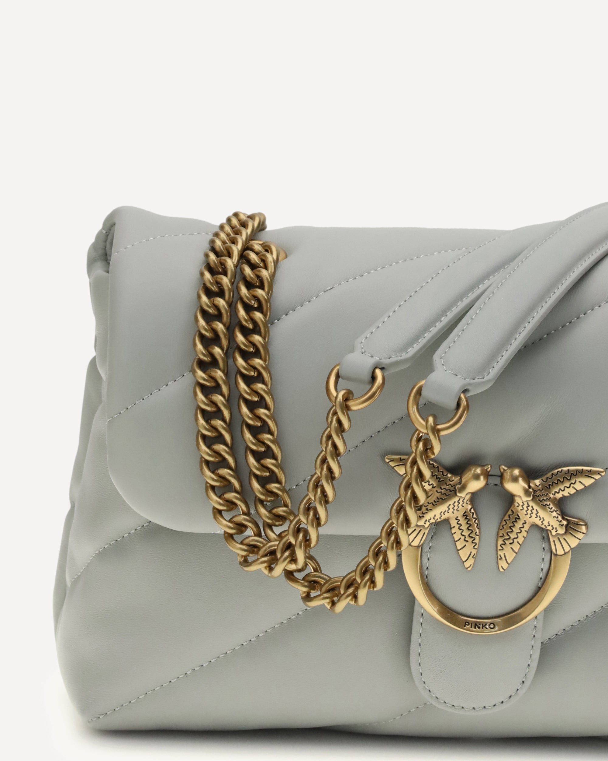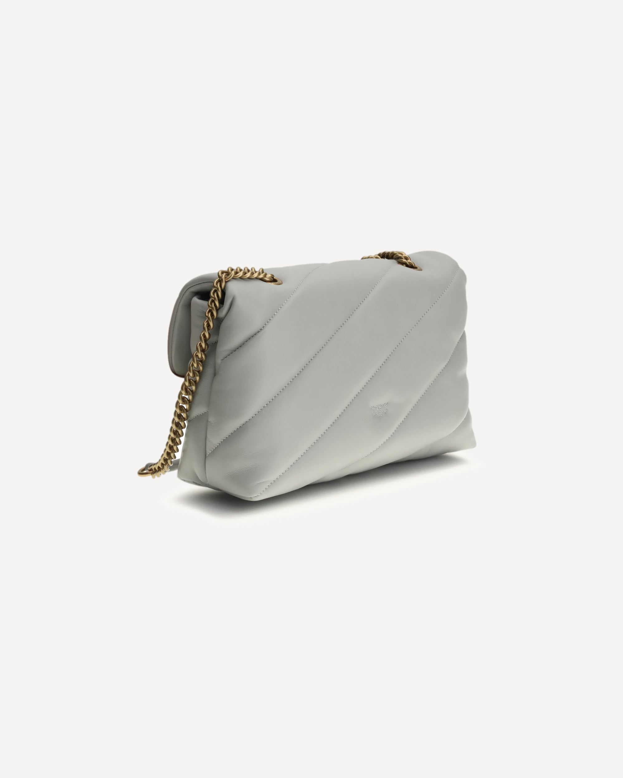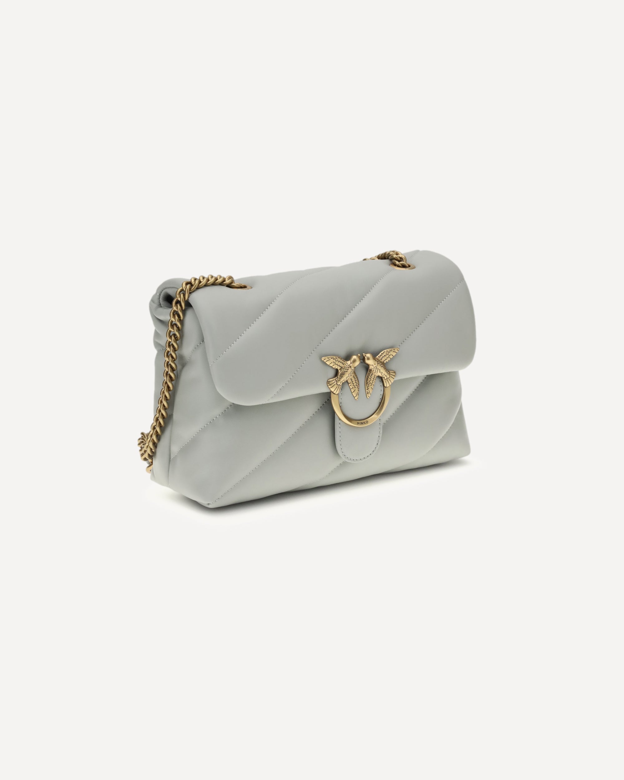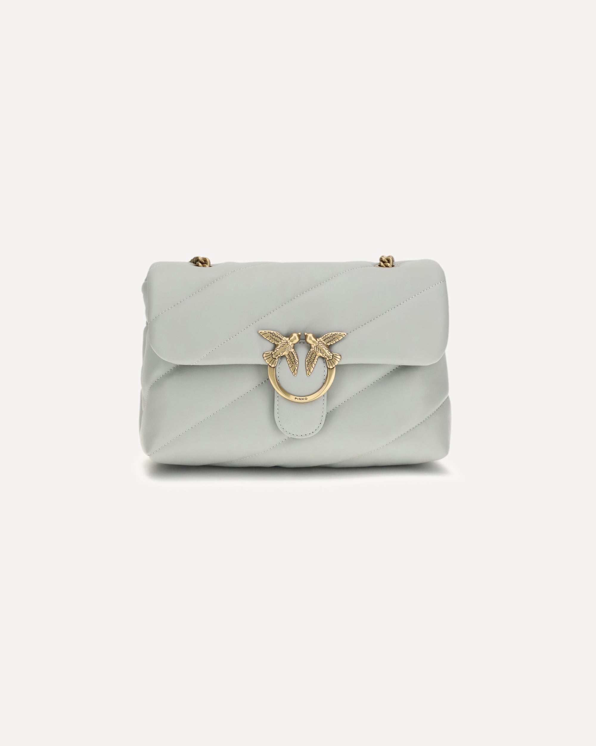 The Love Classic leather Shoulder Bag by Pinko features a quilted and padded design with a front magnetic button closure decorated with the iconic embossed gold-plated Love Birds logo. The interior is organized into two compartments, while a tone-on-tone embroidered monogram stands out on the back. The sliding chain shoulder strap completes the model, combining elegance and practicality.