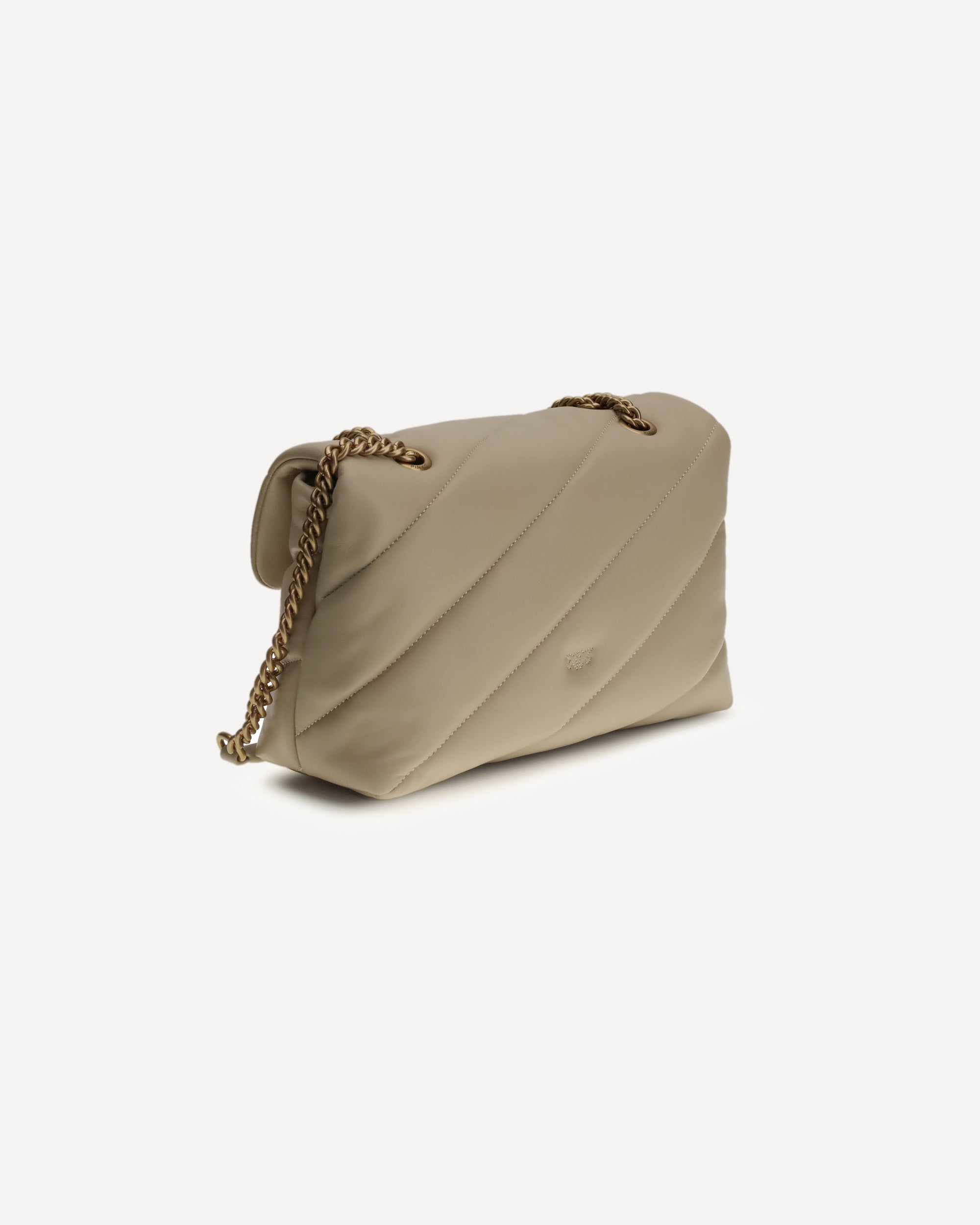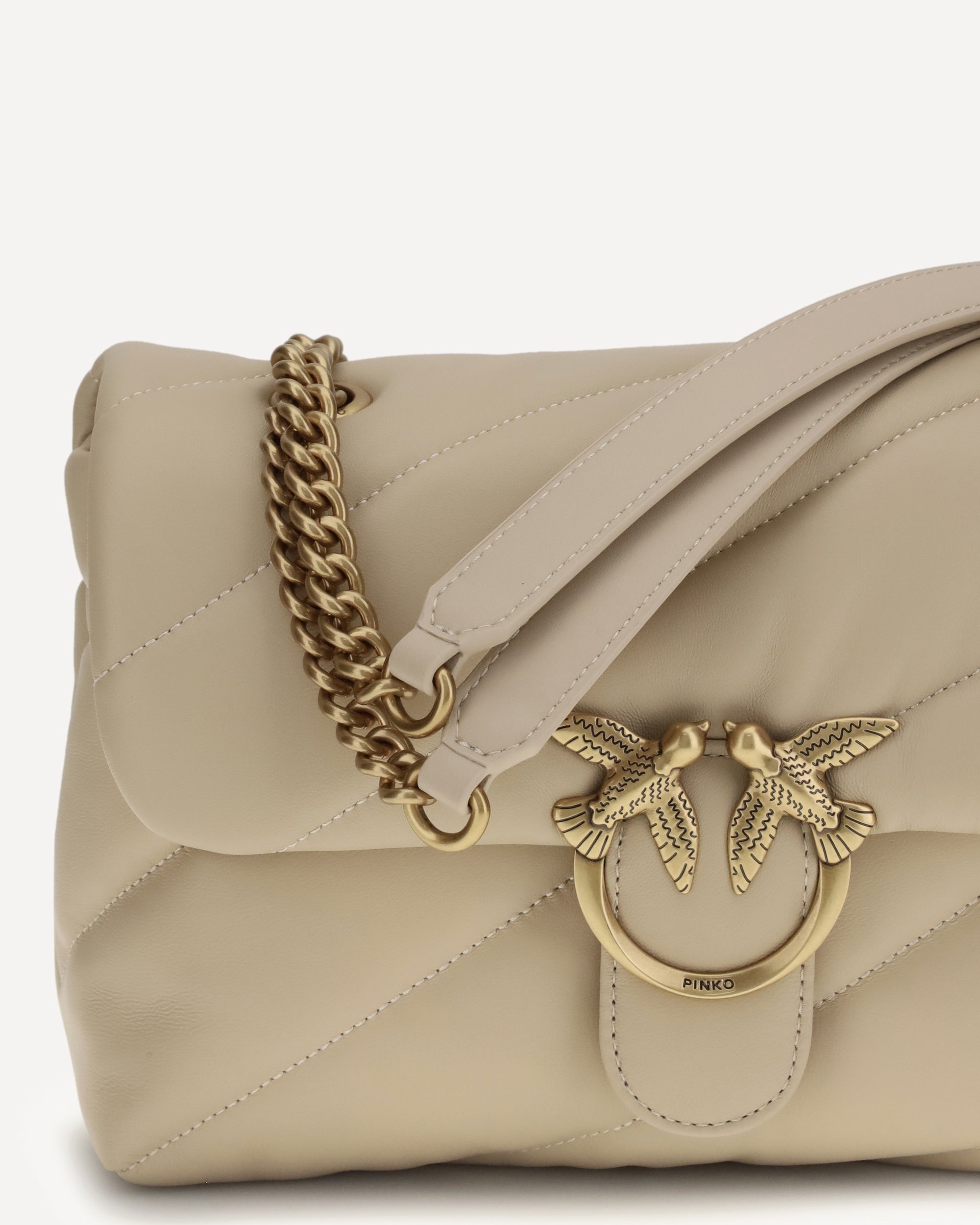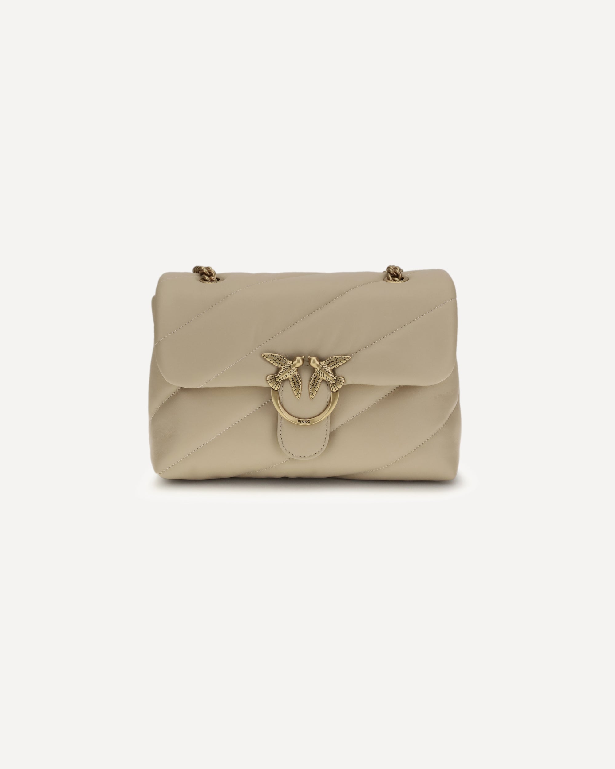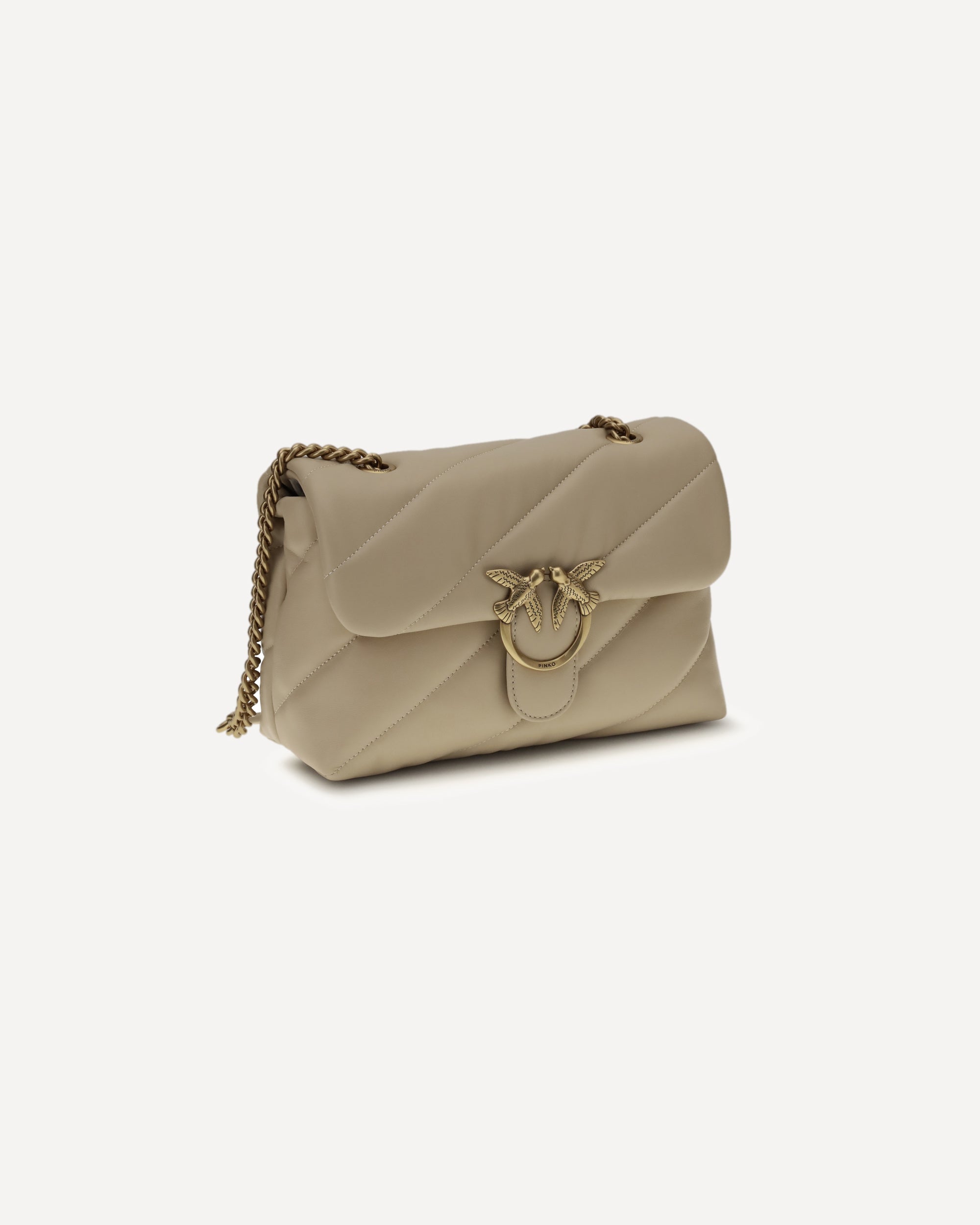 The Love Classic leather Shoulder Bag by Pinko features a quilted and padded design with a front magnetic button closure decorated with the iconic embossed gold-plated Love Birds logo. The interior is organized into two compartments, while a tone-on-tone embroidered monogram stands out on the back. The sliding chain shoulder strap completes the model, combining elegance and practicality.