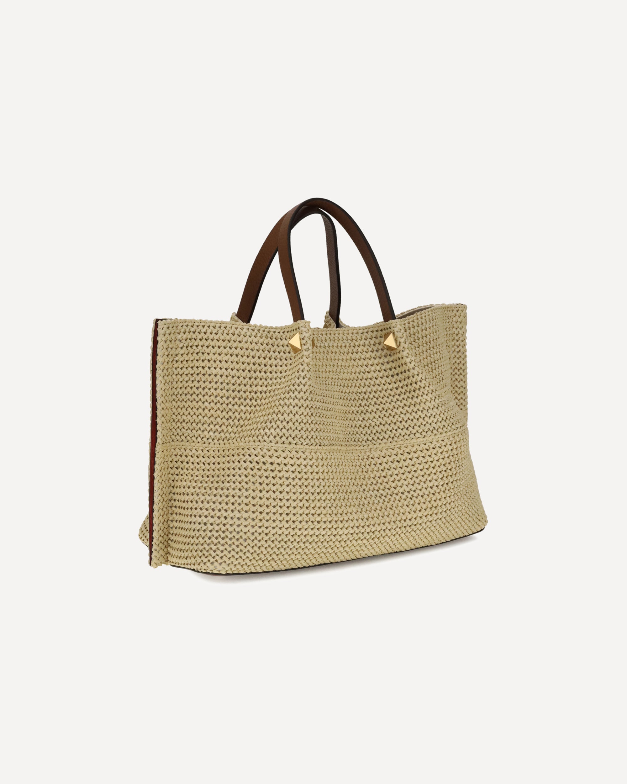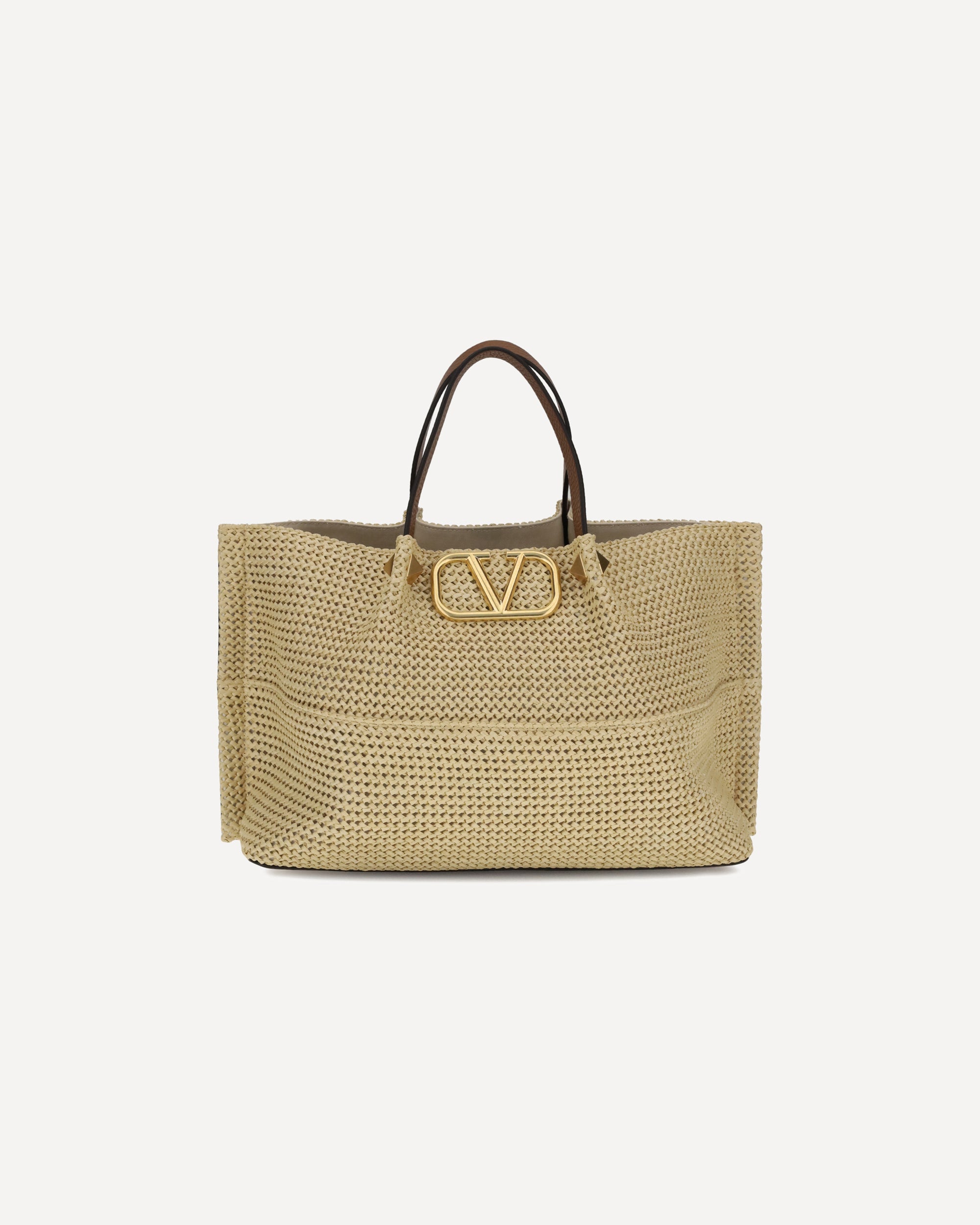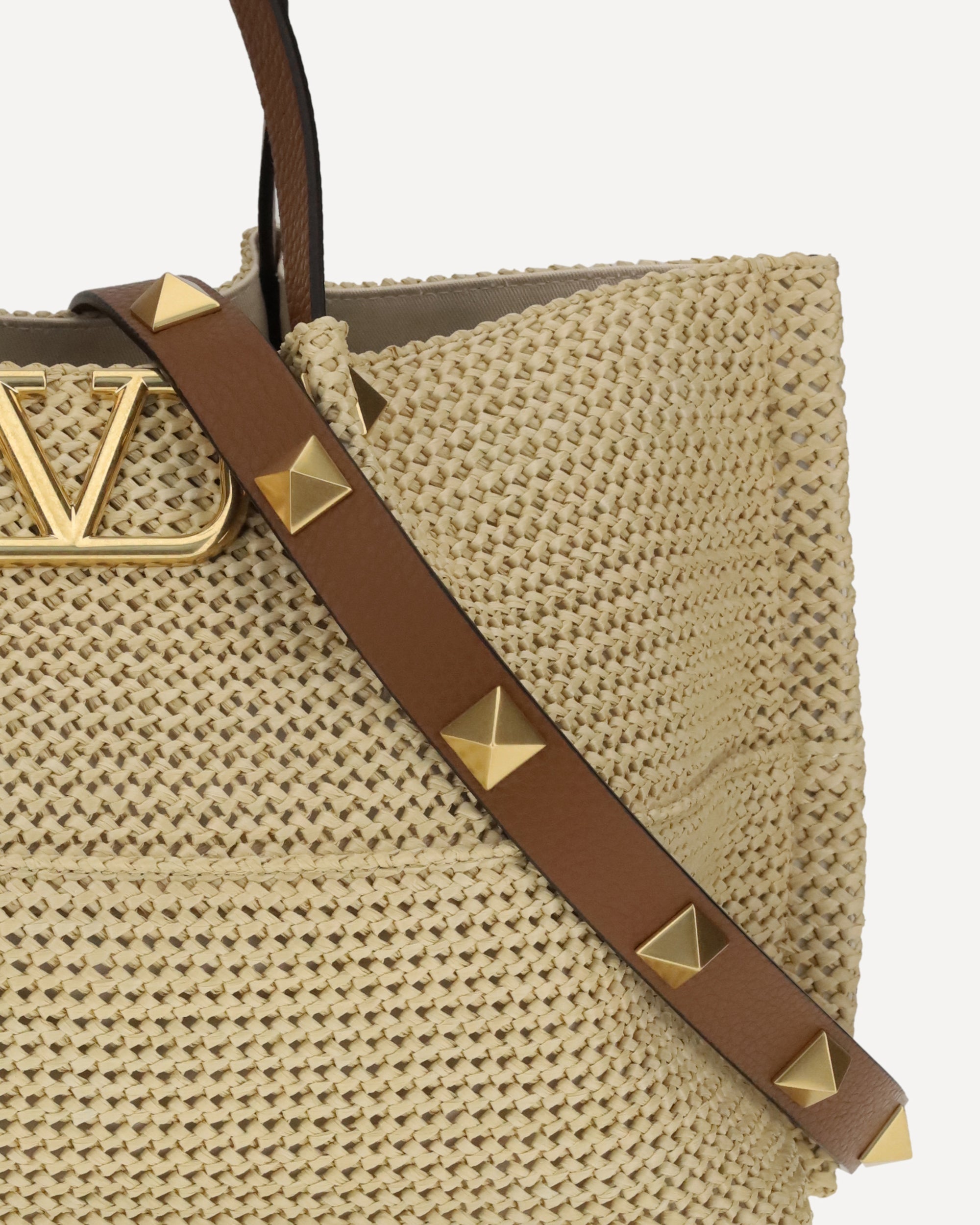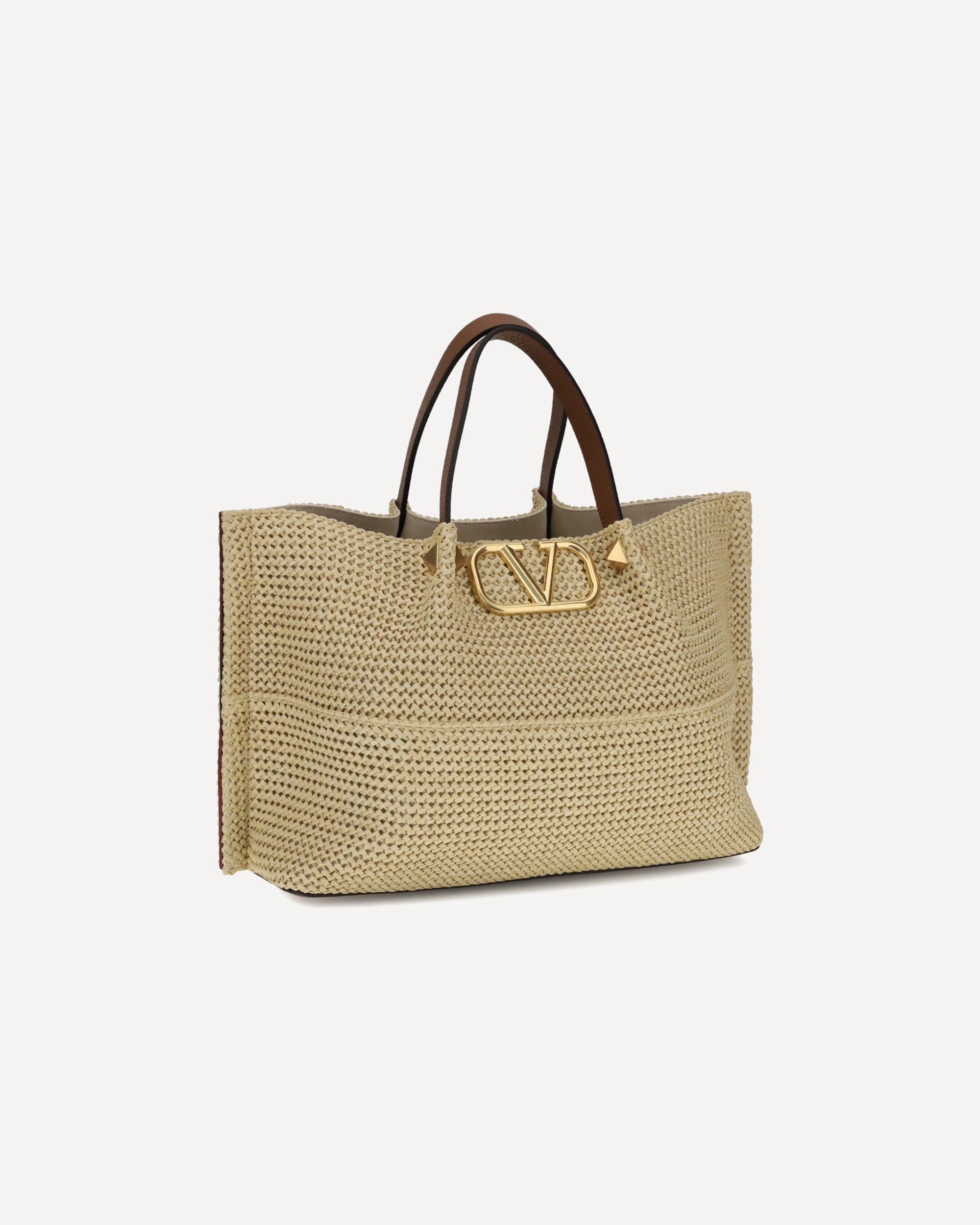 Valentino Garavani's raffia VLogo Tote Bag combines the summer spirit of raffia with the iconic character of the maison. The crochet-effect design gives a handcrafted and refined look, enhanced by the VLogo plaque applied on the front. The two tubular top handles allow a comfortable and refined hand carry, while the adjustable and removable leather shoulder strap is embellished with the iconic Rockstud studs. The interior, with a single compartment, houses a removable pouch to keep essentials safe. A perfect accessory to accompany the warm season in style.