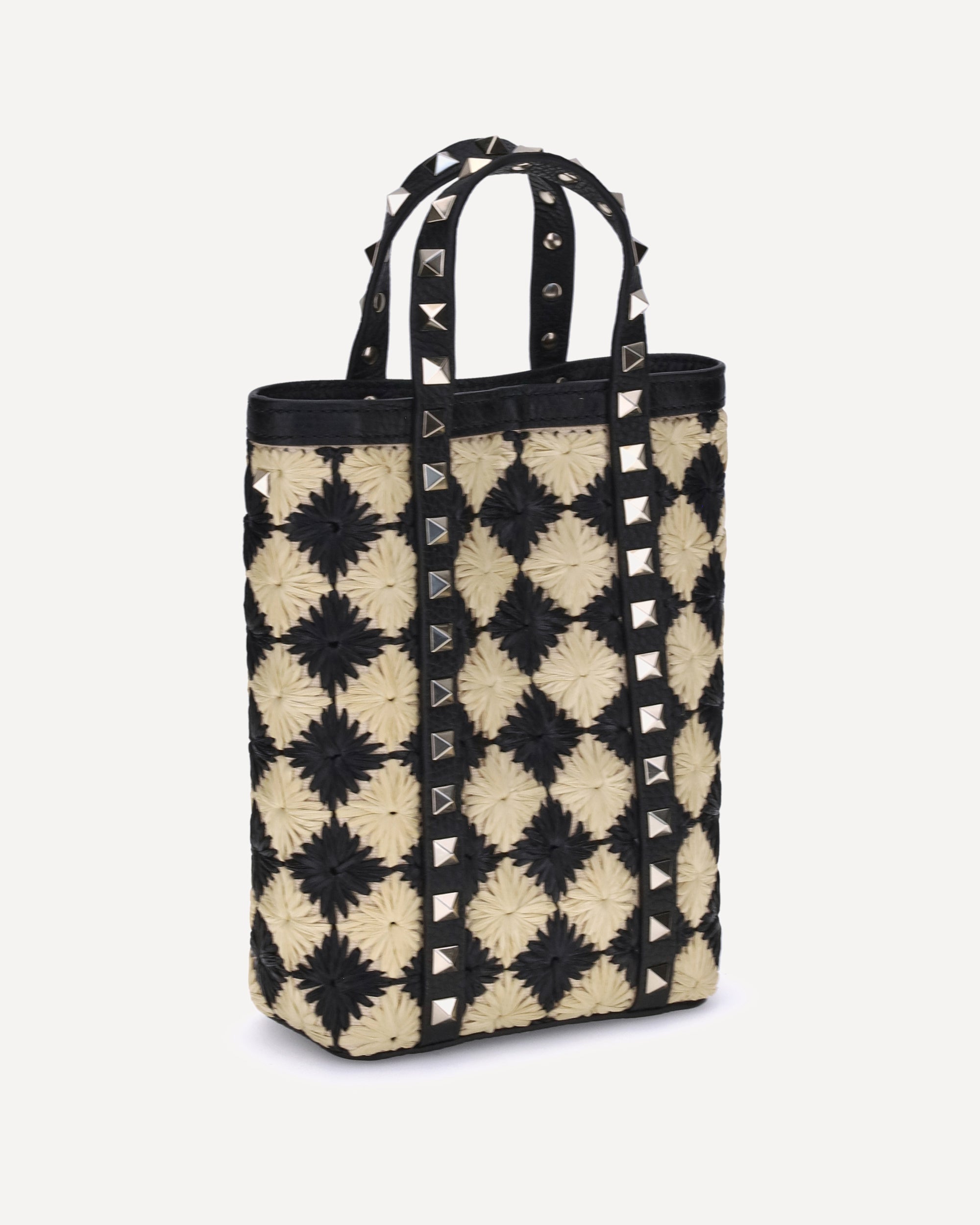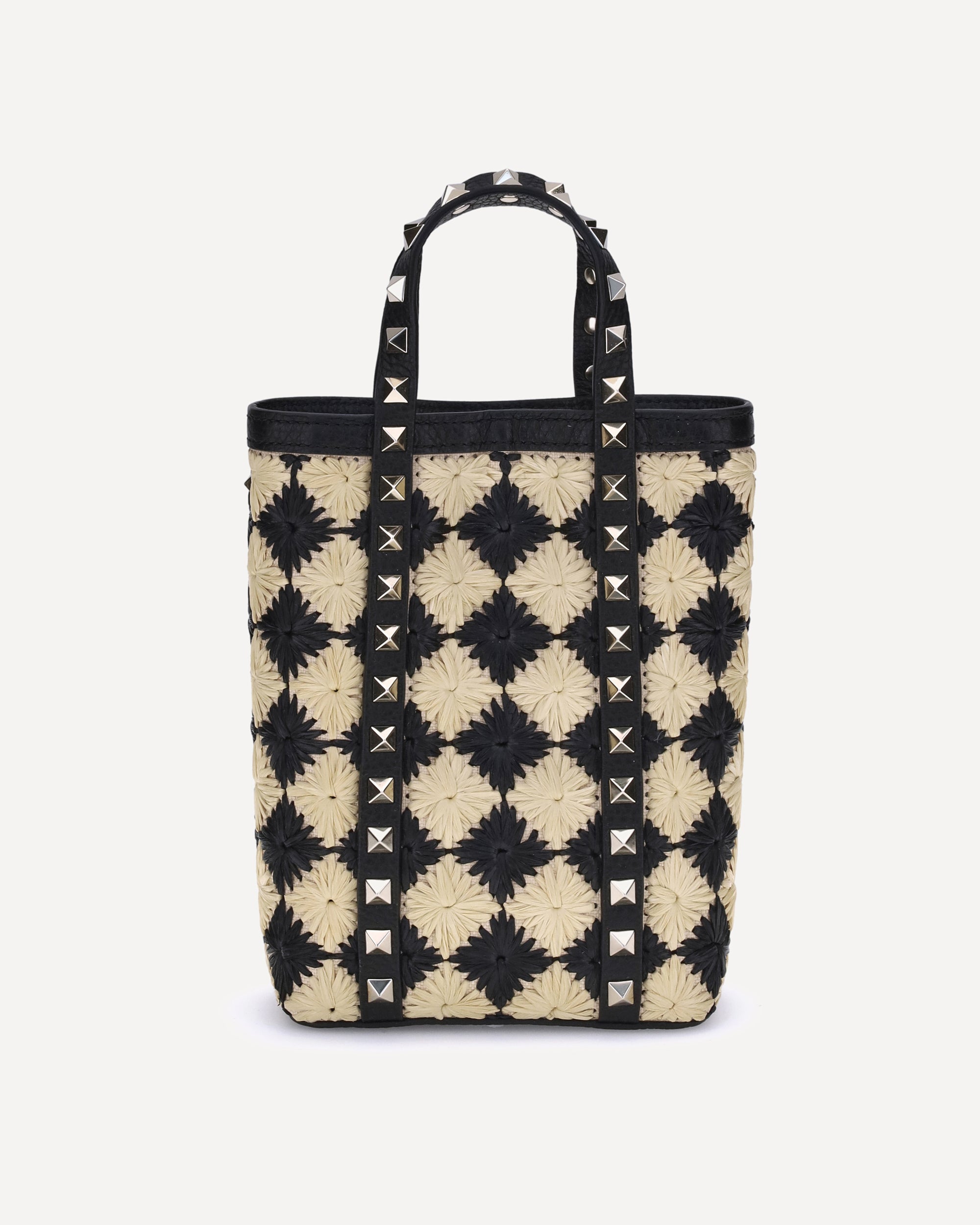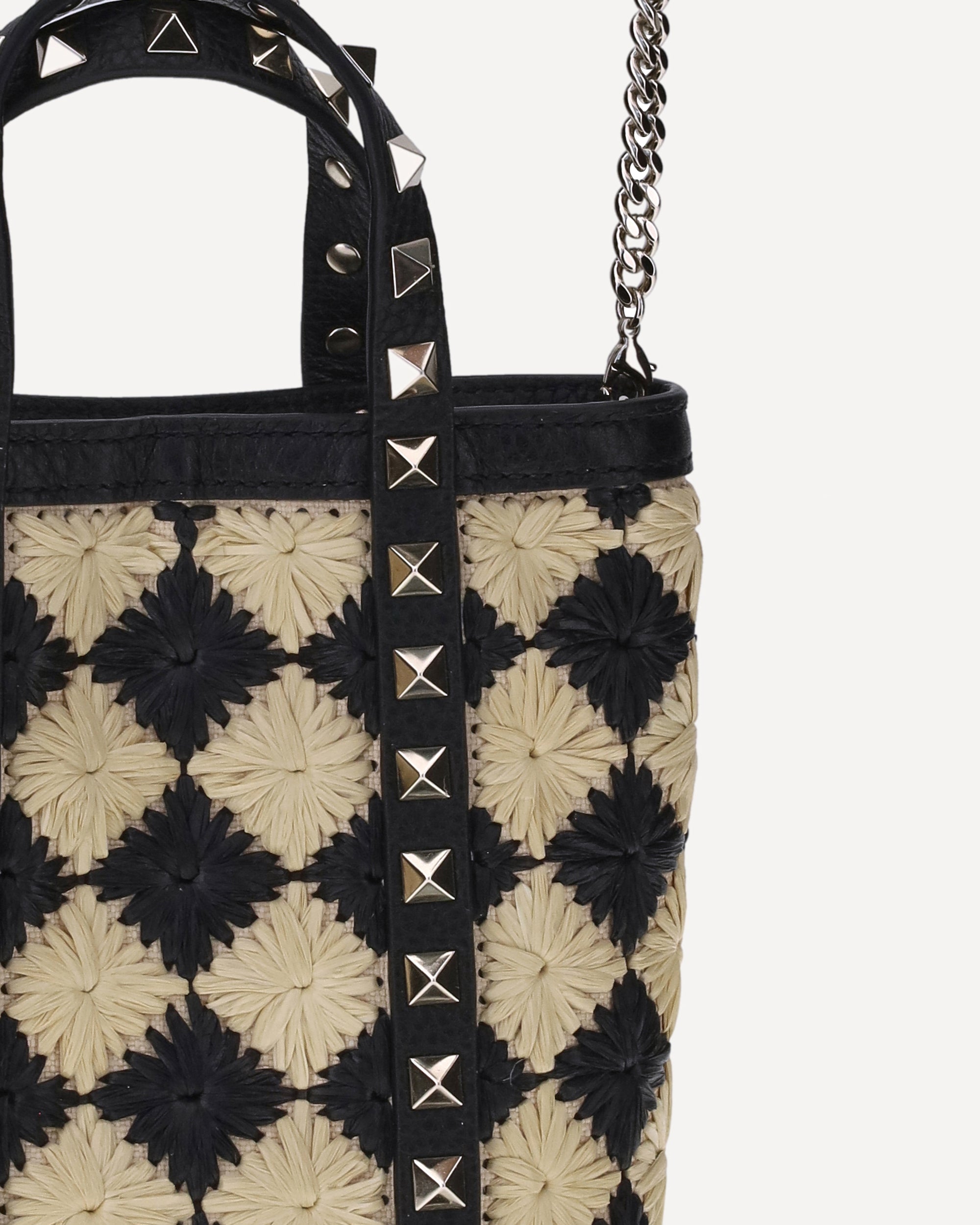 Valentino Garavani's Rockstud mini Tote Bag combines the natural appeal of raffia with fine leather details. Featuring two flat handles with extensions on the front and back panels, it is embellished with the iconic Rockstud studs appliqué, giving it a rock and sophisticated touch. The check pattern adds a classic and distinctive element, while the removable chain shoulder strap ensures versatility in carrying it. A perfect accessory for those looking for style and personality in every detail.