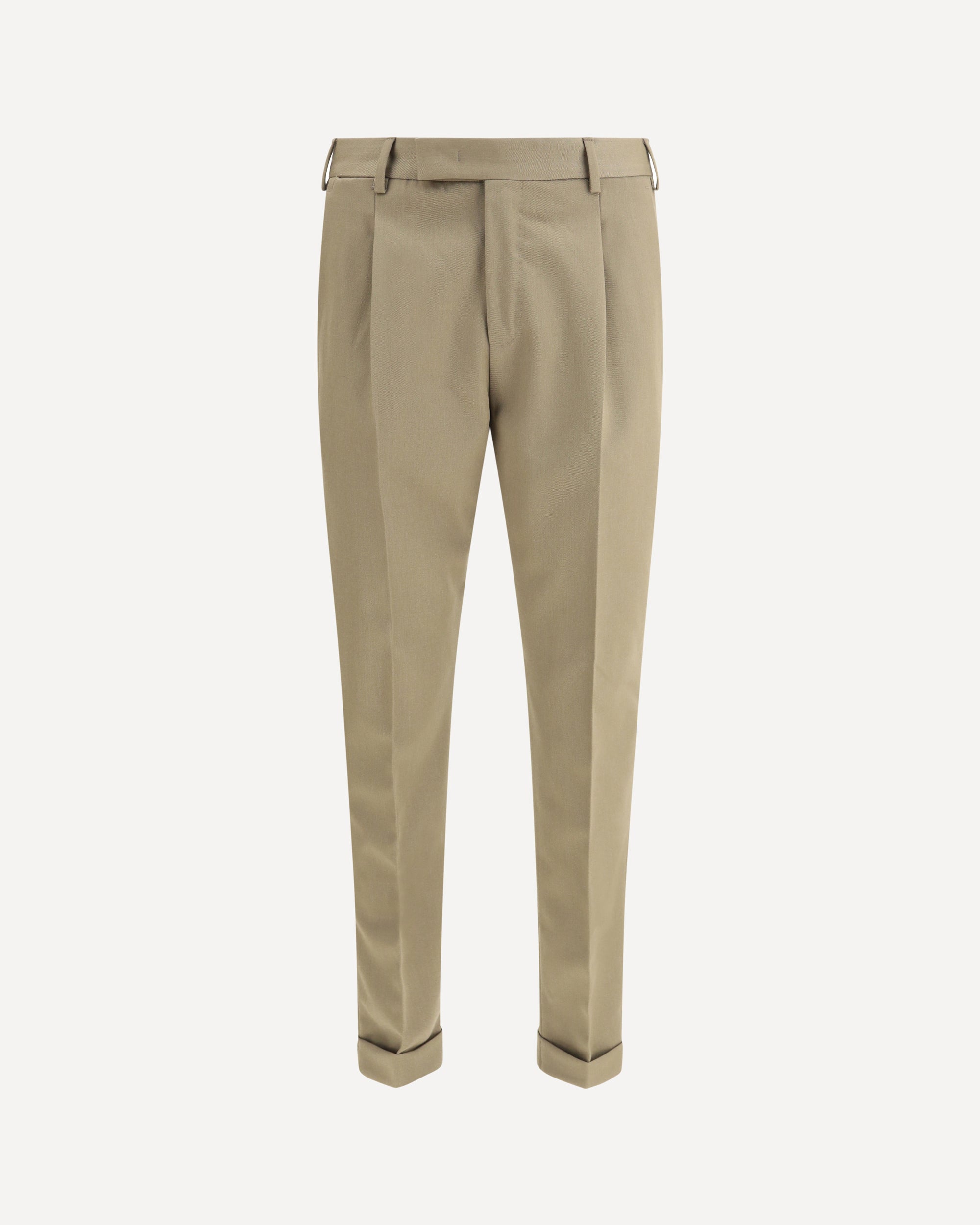 The Rebel Virgin Wool Trousers by PT Torino combine comfort with sartorial refinement. Featuring an elasticated waistband with belt loops, zip and hook closure, they are defined by front pleats that add volume and an elegant line. Side welt pockets and back flap pockets with button enhance practicality, while the cuffed hem completes the design.