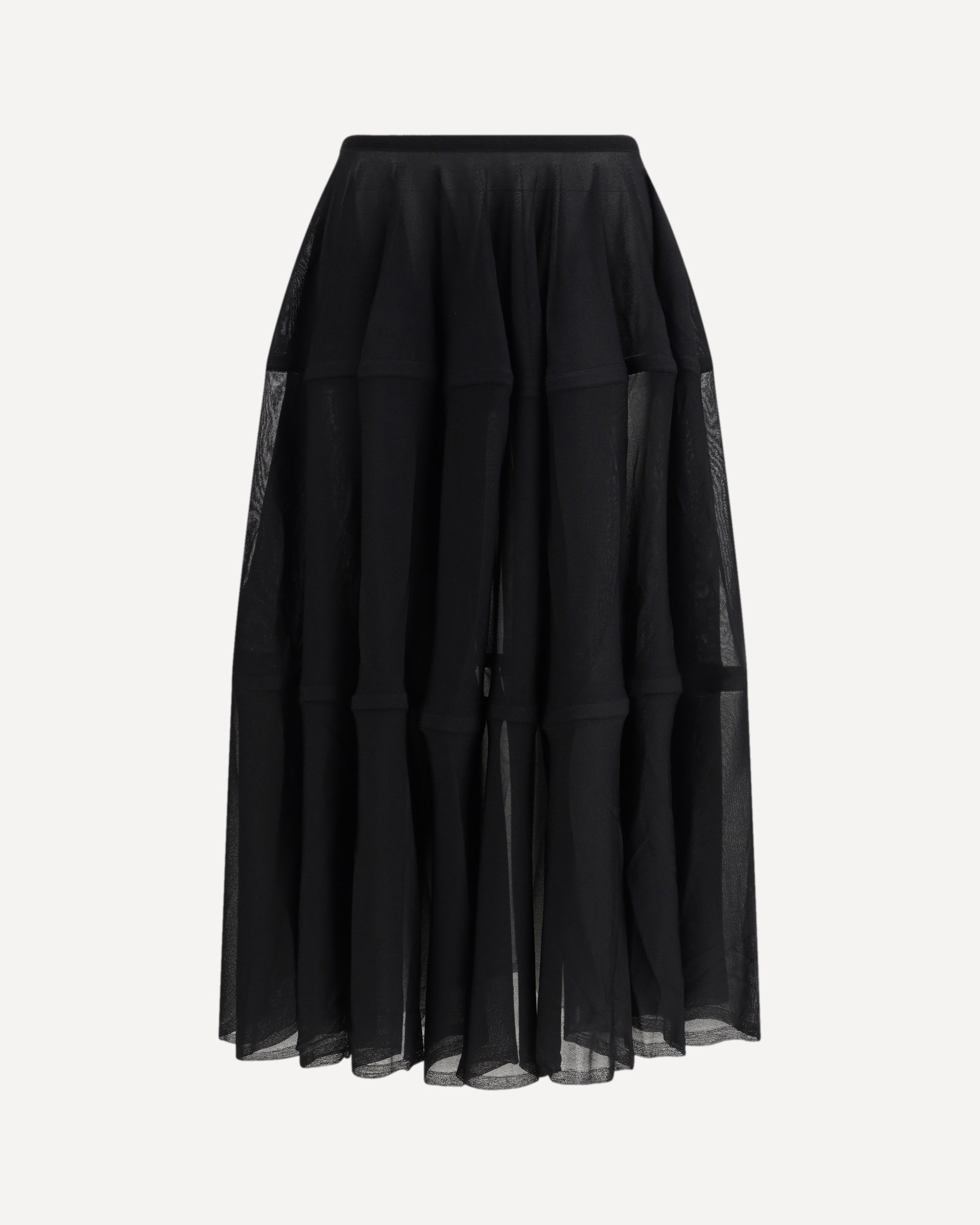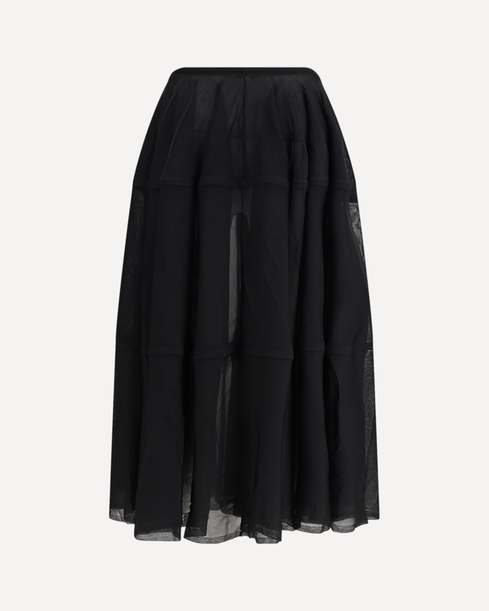 The peplum Skirt by Alaïa reflects the Maison’s iconic elegance through a fluid, contemporary lens. Crafted from viscose, it features a midi length and a subtly semi-sheer structure that brings lightness and movement to the silhouette. The high, elasticated waist gently defines the figure, while the peplum volume creates a refined interplay of proportions, enhancing femininity with controlled sensuality and grace.