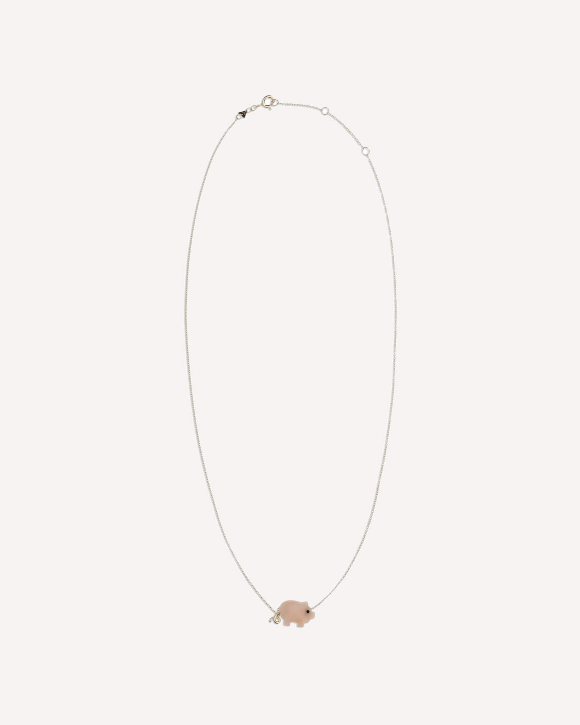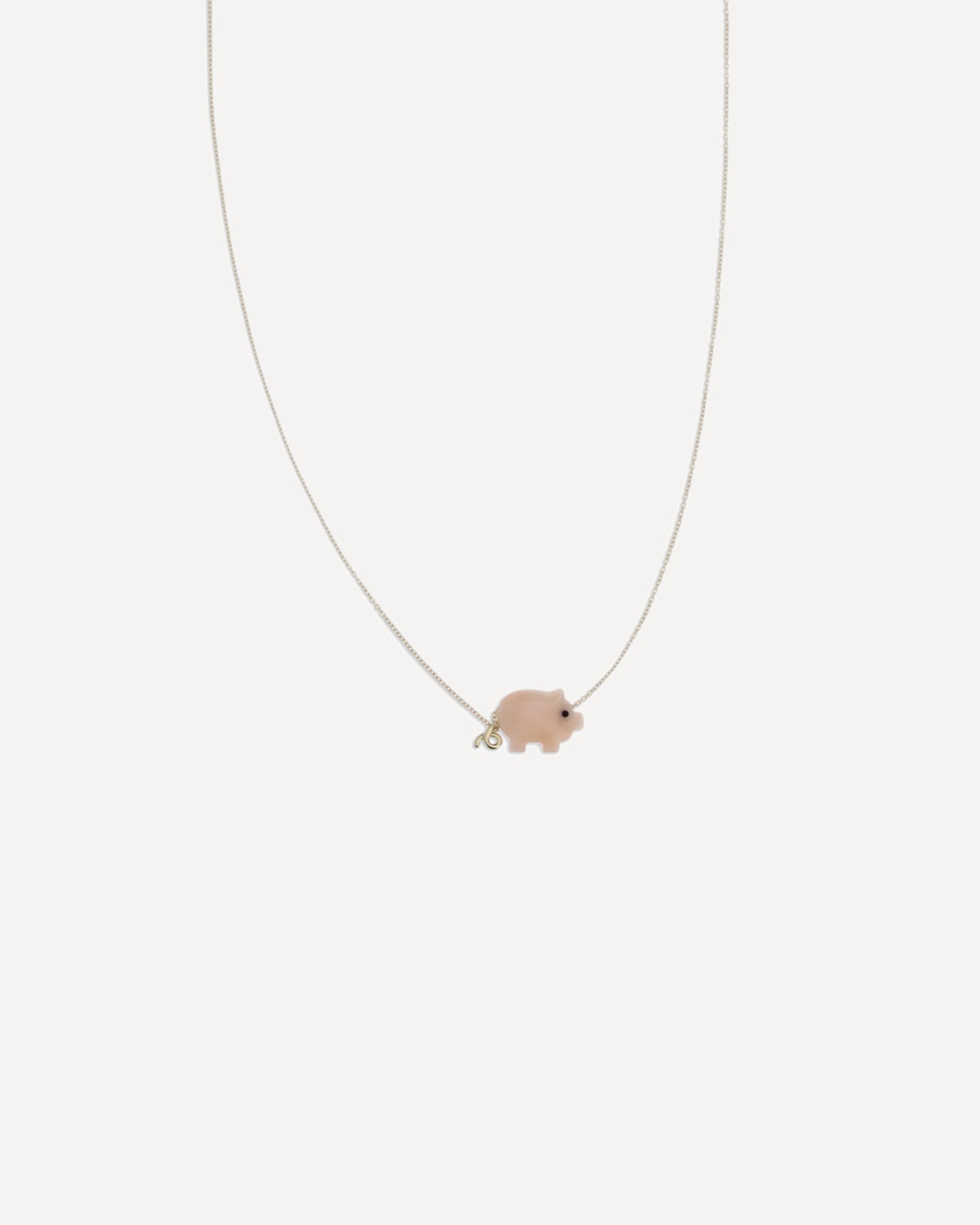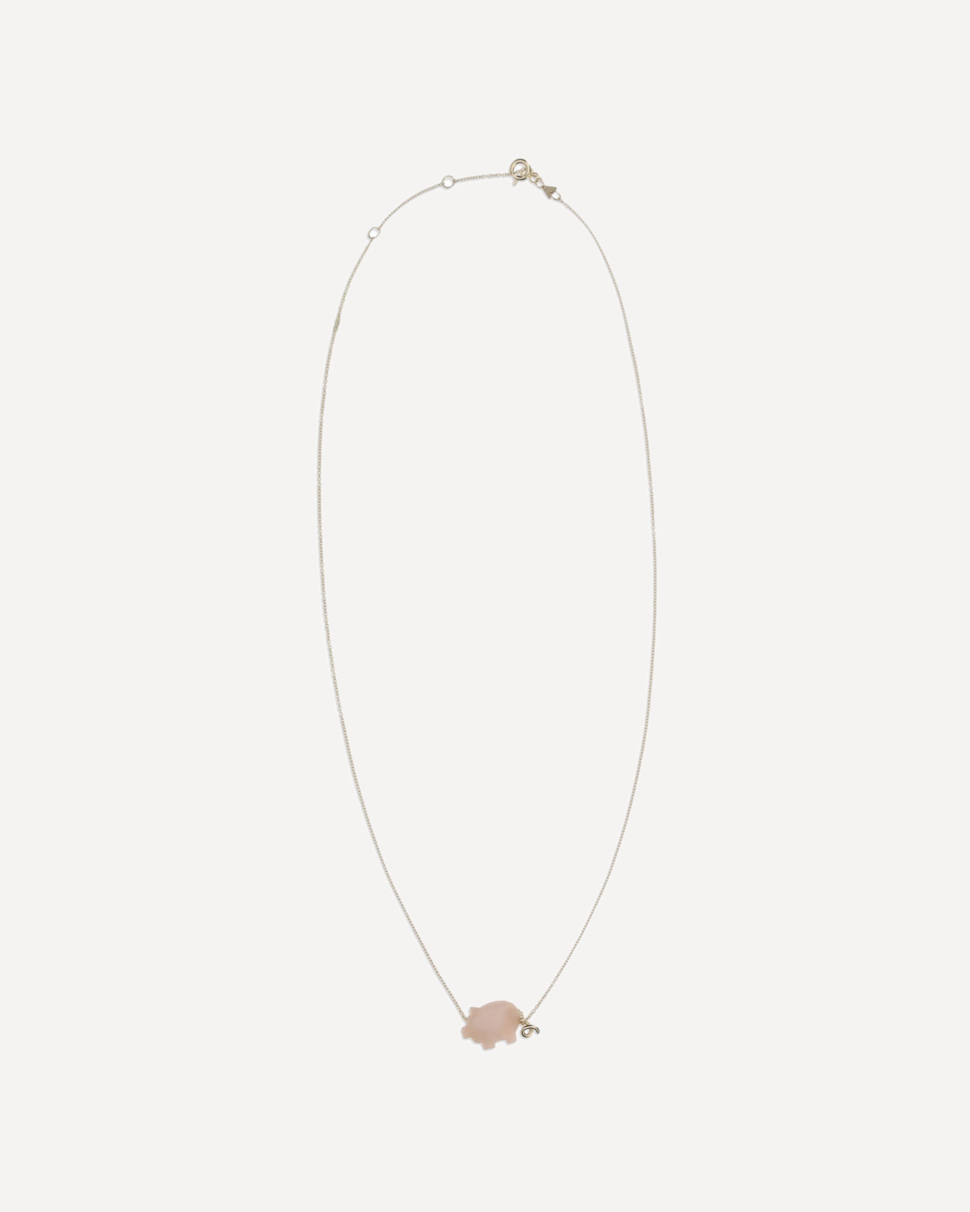 Piggy Necklace by Aliita combines irony and preciousness in a playful and refined design. The piggy-shaped pendant, made of pink coral and black Belgian marble, is mounted on a 9-karat yellow gold rolo chain with a ring clasp. A unique piece of jewelry that expresses lightness and character, perfect for those who love to wear small symbols with personal meaning and distinctive style.